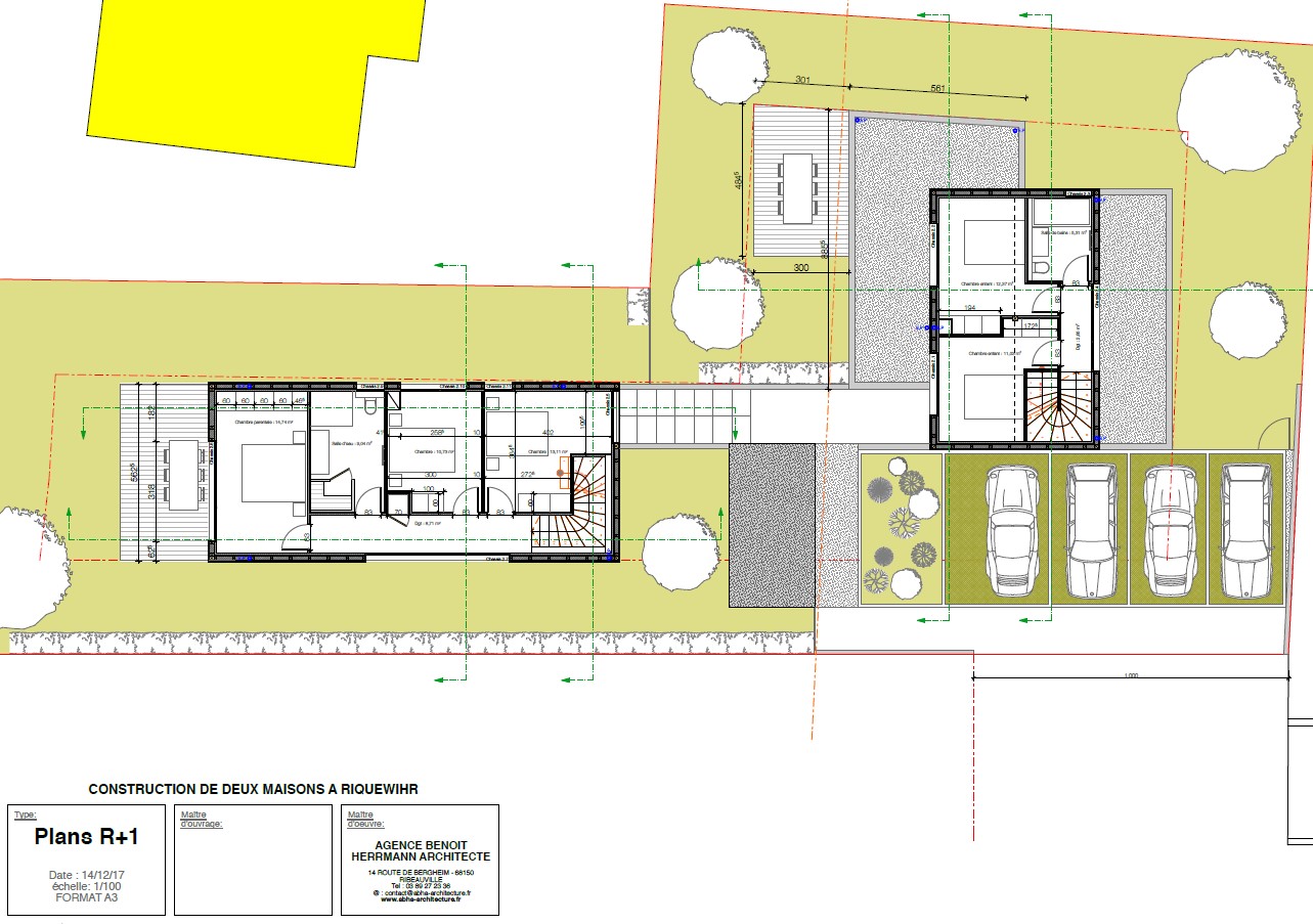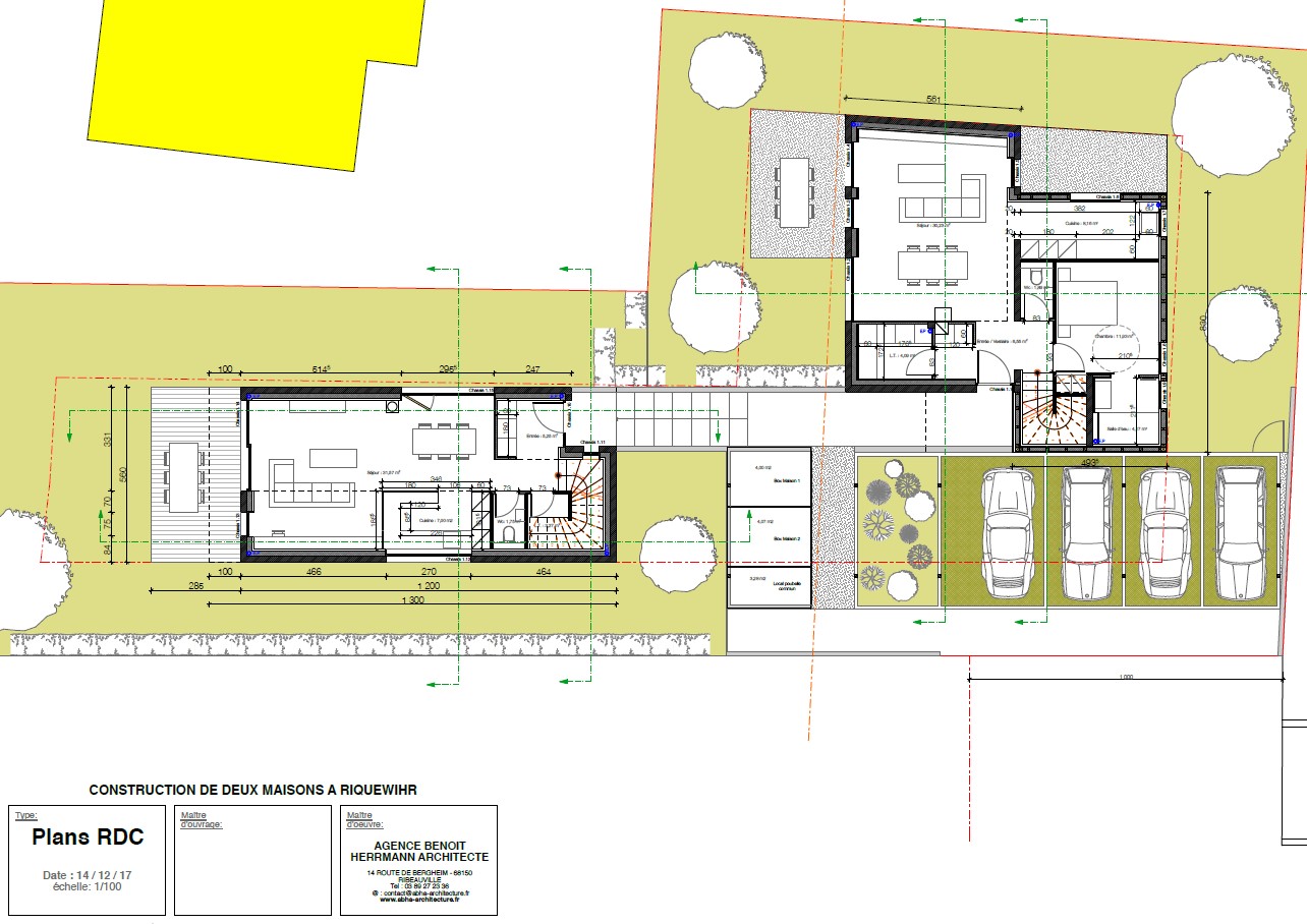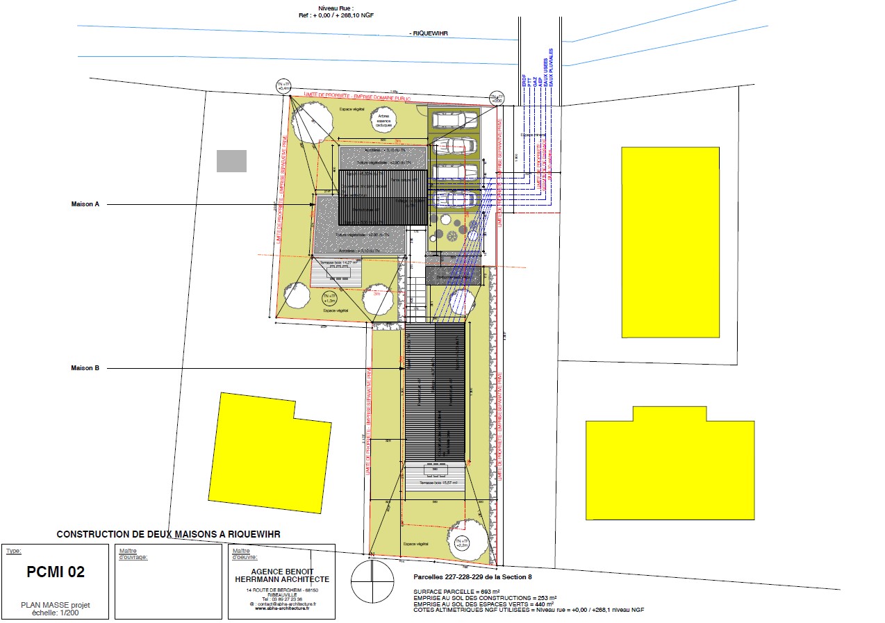 Lors de notre première rencontre avec les maîtres d'ouvrages, ces derniers souhaitaient construire deux maisons jumelées. Nous les avons alors orientés sur l'idée de construire deux pavillons indépendants l'un de l'autre. En effet, la forme du terrain justifie cette utilisation de l'espace, il offre l'avantage de créer deux entités proches l'une de l'autre, avec un stationnement commun et des circulations d'accès communes, mais permet surtout à chaque construction d'avoir ses propres espaces extérieurs et son entière intimité.