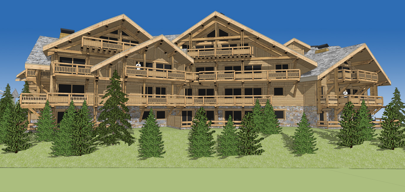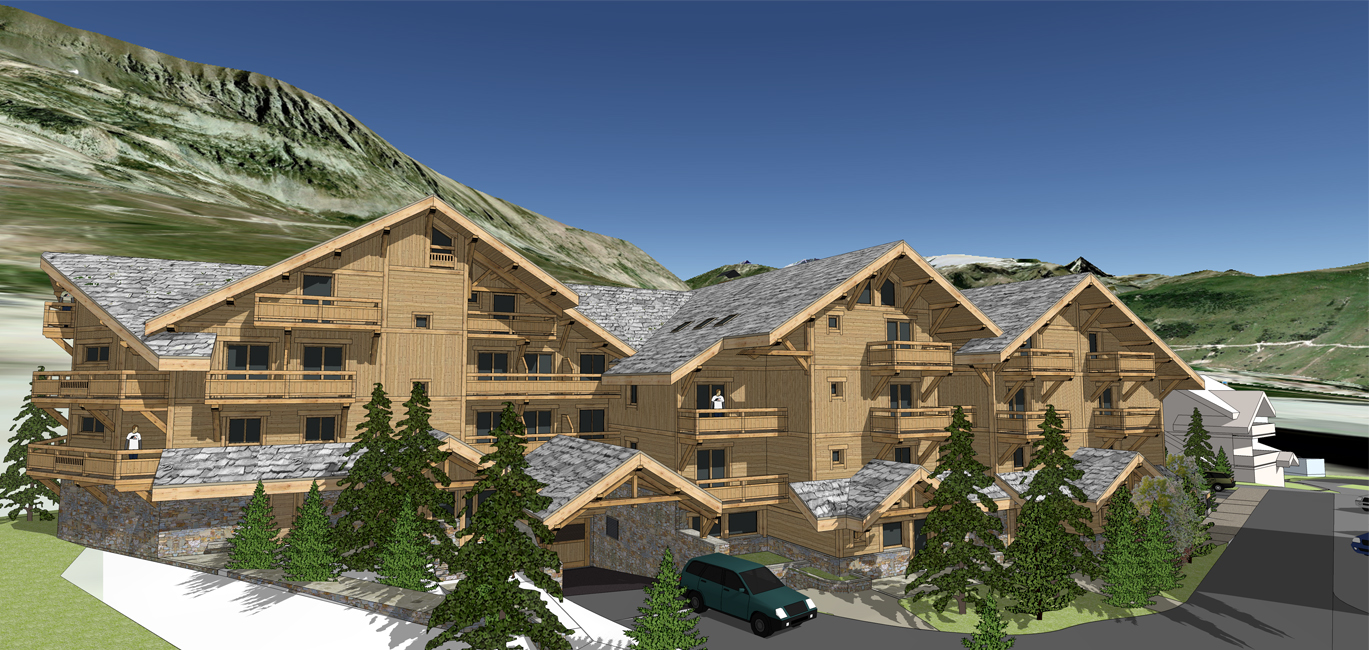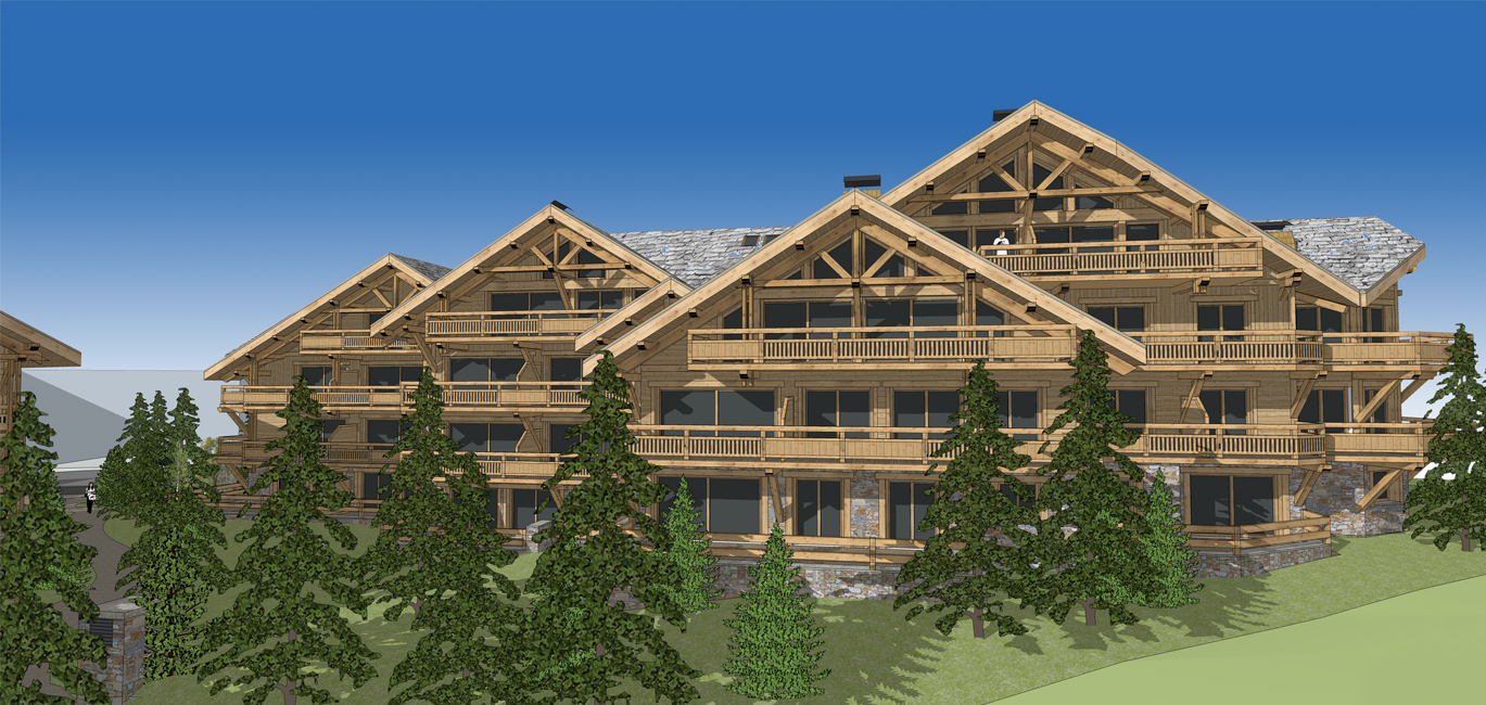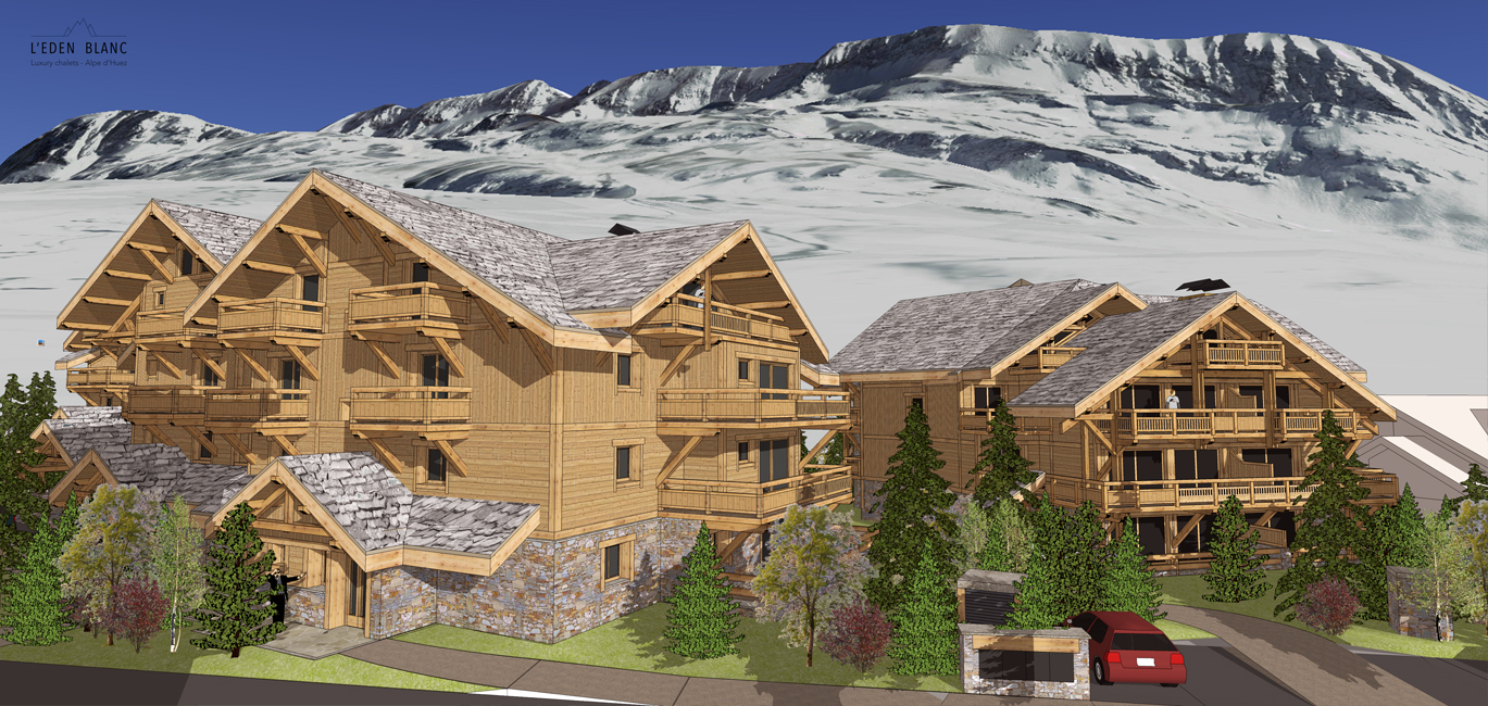 Descriptif technique : Le projet Eden Blanc a été construit en lieu et place du bâtiment Beausoleil. La structure principale (murs et planchers) est en béton-armé. Les murs de façades du dernier niveau sont des murs à ossature bois. La toiture et les balcons y compris les garde-corps sont traités en charpente bois traditionnelle en Douglas. Dans la continuité du style des chalet de la station, les murs du rez-de-chaussée sont habillés en pierre, les murs des étages sont recouverte d'un bardage mélèze, la toiture est couverte en pierre de Lauze. En intérieur, les parois sont entièrement habillées de bois. PEFC (Gestion forestière durable) FSC (Gestion forestière responsable)