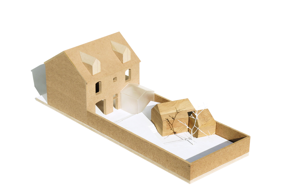 La maison se situe dans le quatier Sud-Gare à Rennes. Pour ne pas imposer un volume trop important sur la façade existante, nous avons dessiné trois petits volumes distincts : un jardin d'hiver, une chambre et une salle de bain. Ces trois volumes sont disposés de manière harmonieuse le long du mur mitoyen. Cette implantation nous a permis de profiter d'un maximum de lumière dans toutes les pièces, de conserver une surface de jardin raisonnable, de garder une perspective sur toute la profondeur du jardin, de donner depuis la chambre la sensation d'être dans un volume détaché de la maison.