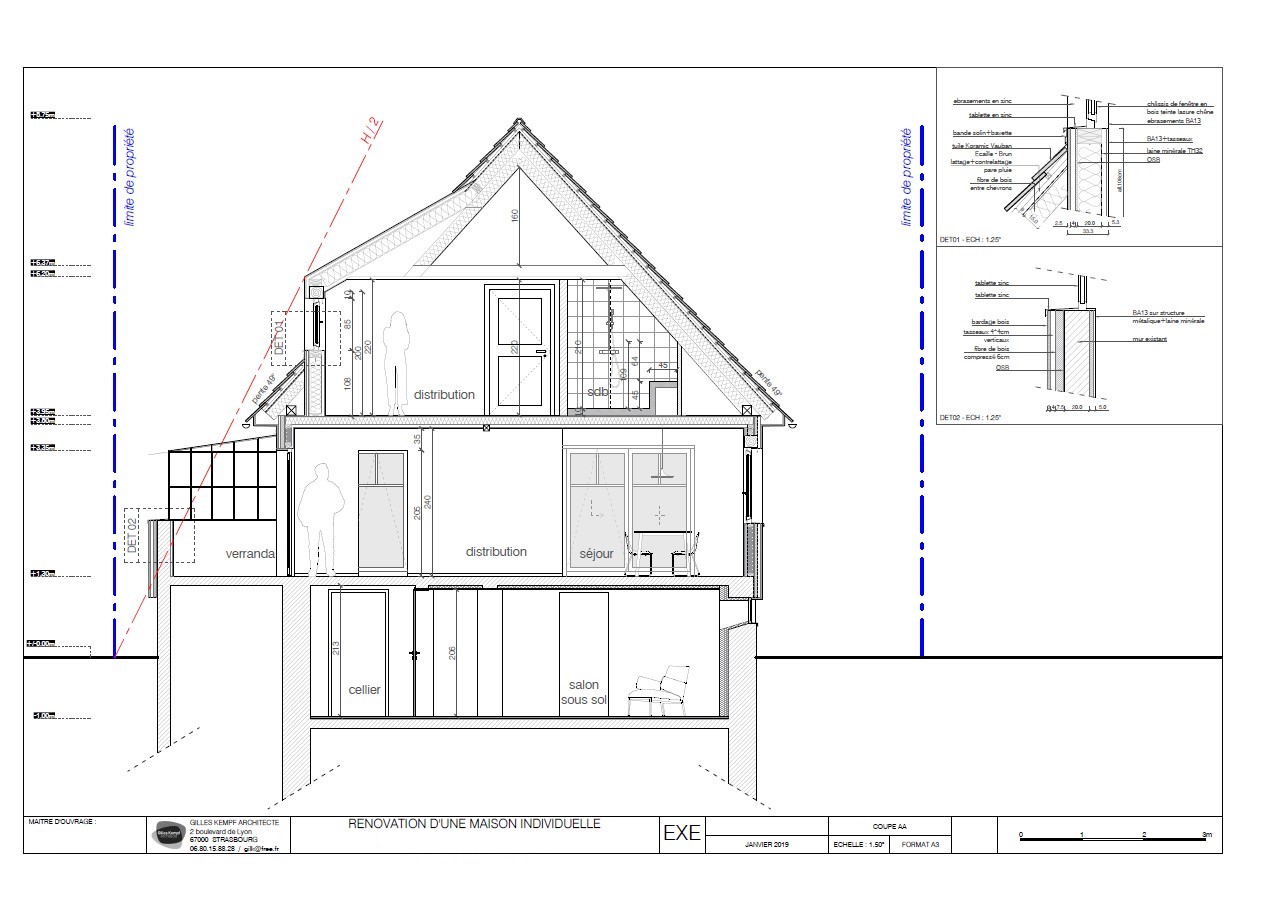 Rénovation et restructuration complète (intérieur + extérieur) d’une maison de l'année 1947, construite très économiquement. La répartition des espaces intérieurs et leurs rapports à l’environnement extérieur (jardin) a été modifiée, la maison retraitée et revisitée dans le respect de son apparence initiale. Une terrasse, une longue lucarne ainsi qu’une petite cour anglaise ont été ajoutées.