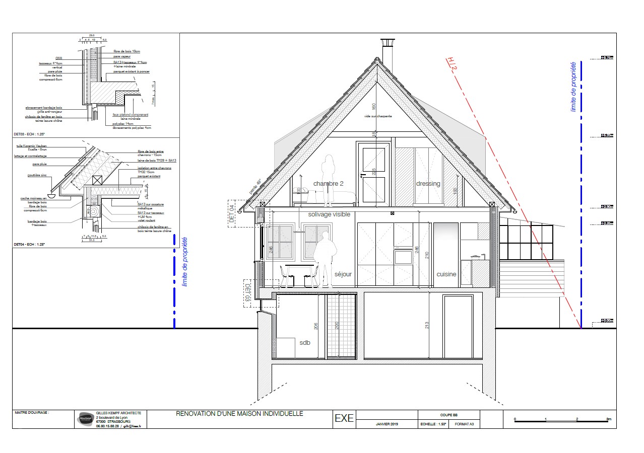 Descriptif technique : La maison construite très économiquement après-guerre a fait l’objet d’un déshabillage complet et d’un renforcement conséquent de ses éléments de structure (contreventements, façades, charpente). Ceci a permis de lui faire supporter l’ajout d’une isolation performante et de créer des espaces plus ouverts à l’intérieur ainsi que sur l’extérieur.