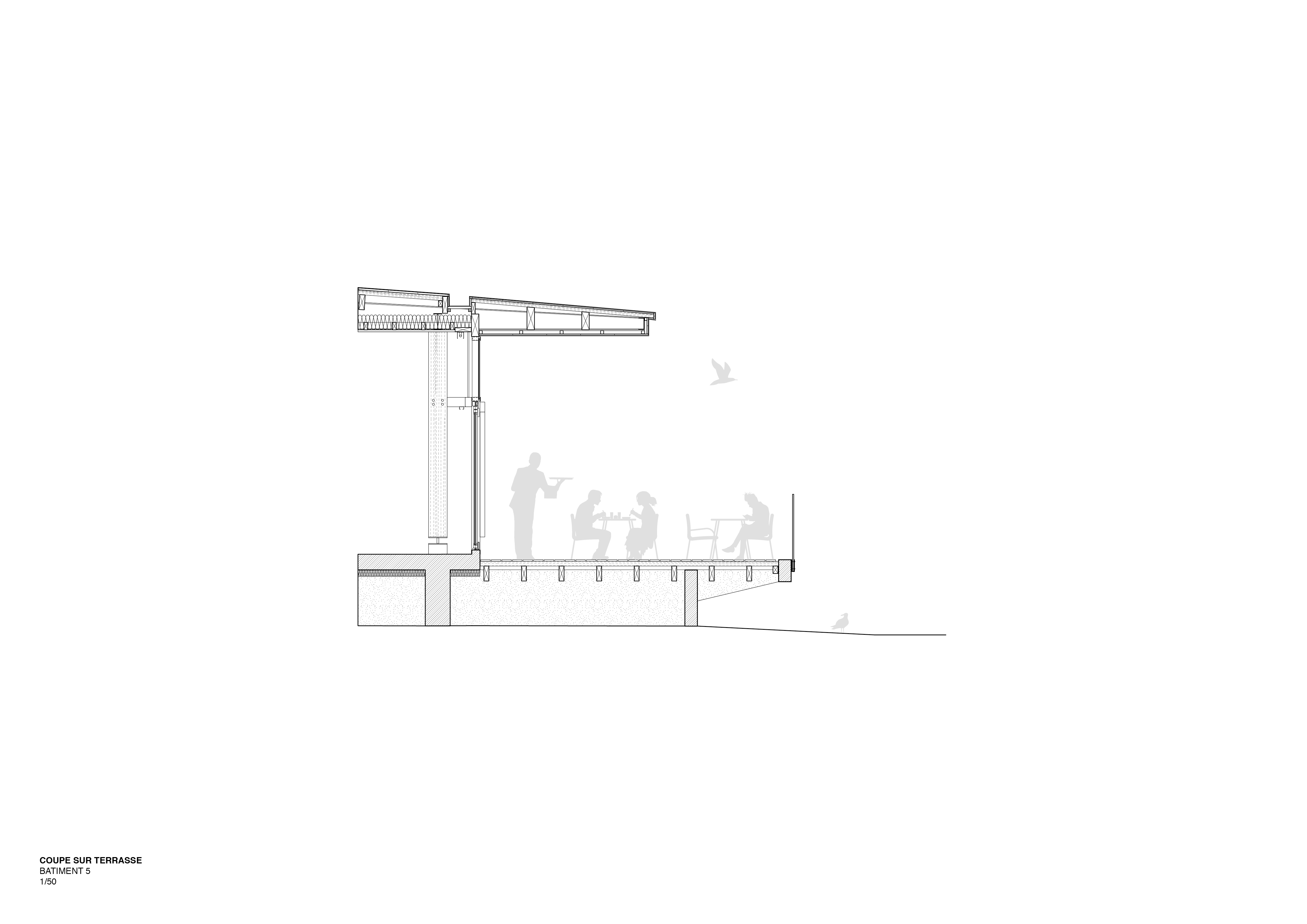 Descriptif technique : La structure principale des bâtiments est constituée de portiques pendulaires mixtes, d’environ 5.20 m à 6.90 m d’entraxe. Les poteaux en Lamibois sont support des traverses métalliques de portée variable d’environ 7.00 m à 10.50 m et présentant des porte-à-faux pouvant aller jusqu'à 2.80 m. La charpente bois, support de la volige et de la couverture en zinc, est constituée de chevrons en bois massif, de pannes LC, de vaux LC, d’arêtier LC et faîtages LC. Cette charpente et le faux-solivage en bois massif, support du plafond horizontal, sont fixés sur les structures métalliques.