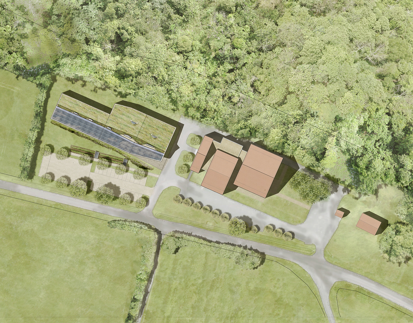 Approche environnementale : La composition architecturale du projet est portée par des matières denses et saines, qui reflètent la richesse du Périgord Vert, autant sur le plan symbolique que physique. La composition en trois travées de la halle suffit à organiser le plan et la géométrie du programme. La travée centrale, reçoit les émergences sur une forme de crête, devenant l'organe principal de l'édifice. Celui-ci concentre les fonctions actives principales du projet. Sur le flanc sud de la toiture, une surface continue capte l'énergie solaire et la restitue à la fois pour chauffer le bâtiment en hiver et pour produire de l'électricité. Cette figure assumée d'une toiture active trouve son pendant sur le flanc nord en devenant une prairie vallonnée offerte à la forêt et source d'une lumière douce pour les espaces intérieurs.