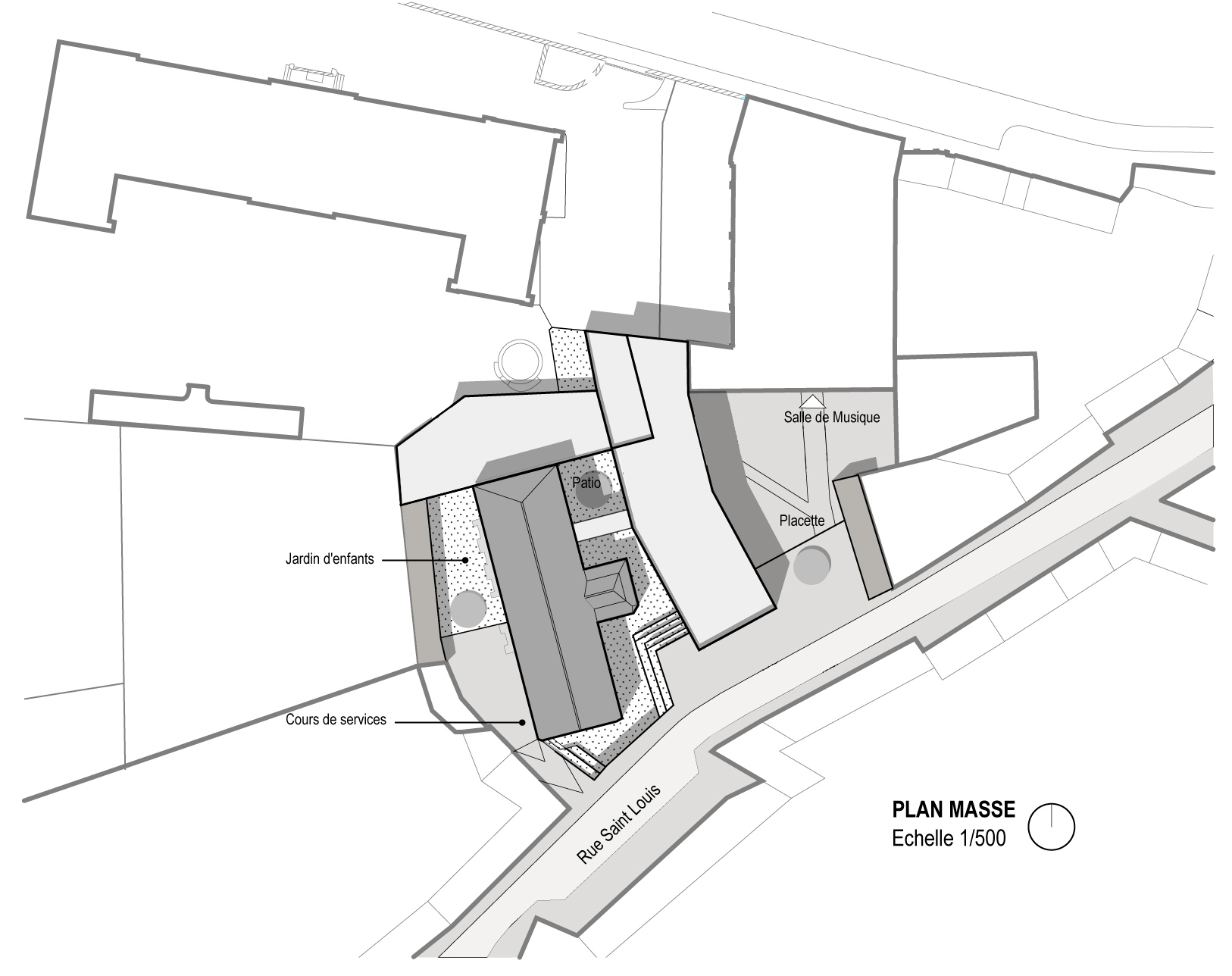 Le projet consiste à insérer un équipement public de quartier dans un tissu ancien, composé du bâtiment du Jeu de Paume réhabilité et étendu. Cet équipement se situe à proximité et en lien avec le bâtiment de la Salle de la Cité existante. Le projet architectural dans son ensemble tire son essence de la simplicité constructive et affirmée du bâtiment historique en bois, construit au XVII ème siècle. La complexité du projet a résidé dans la mise en adéquation du programme (crèche et salles associatives) avec la volonté impérieuse de mettre en valeur les volumes historiques.