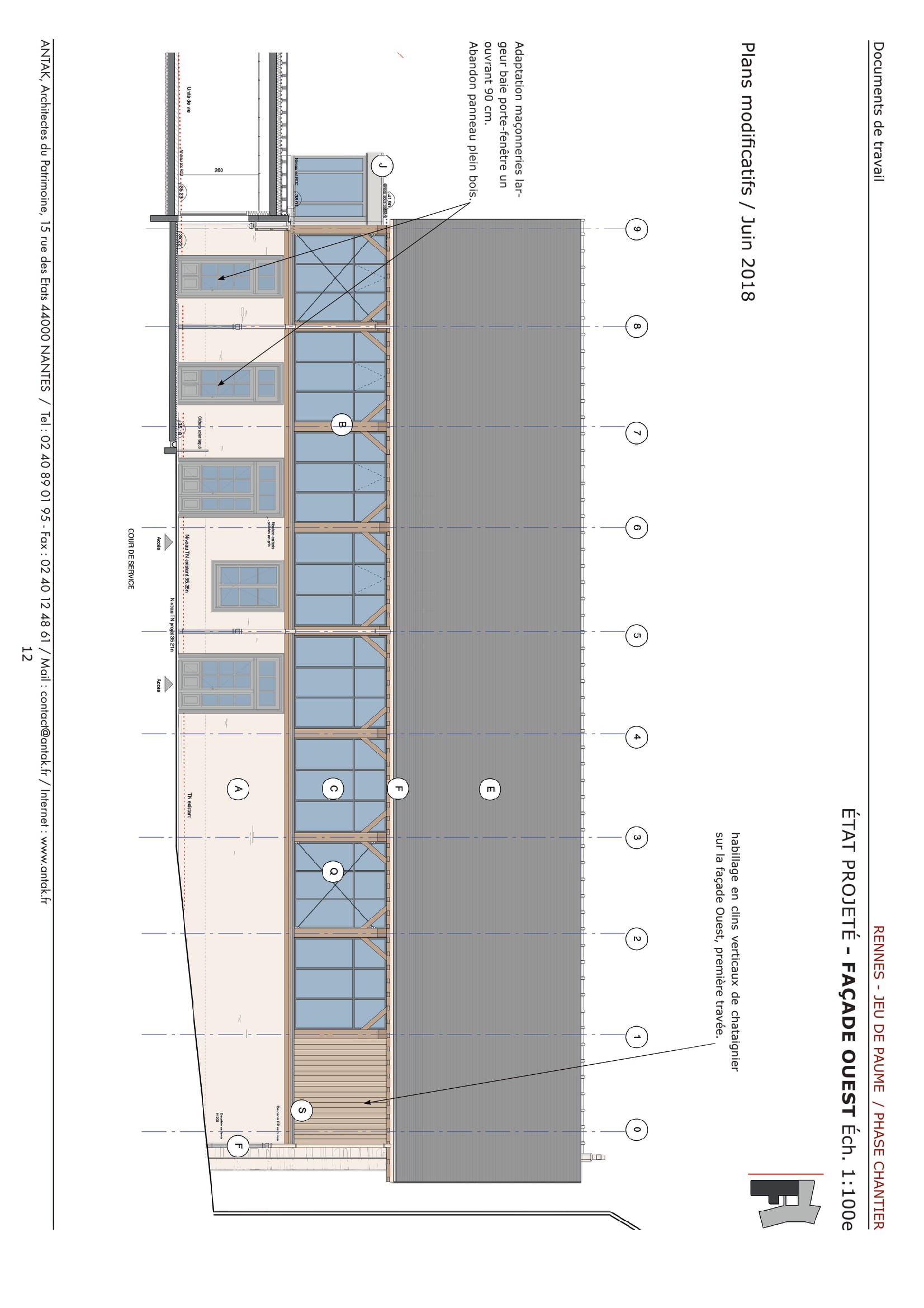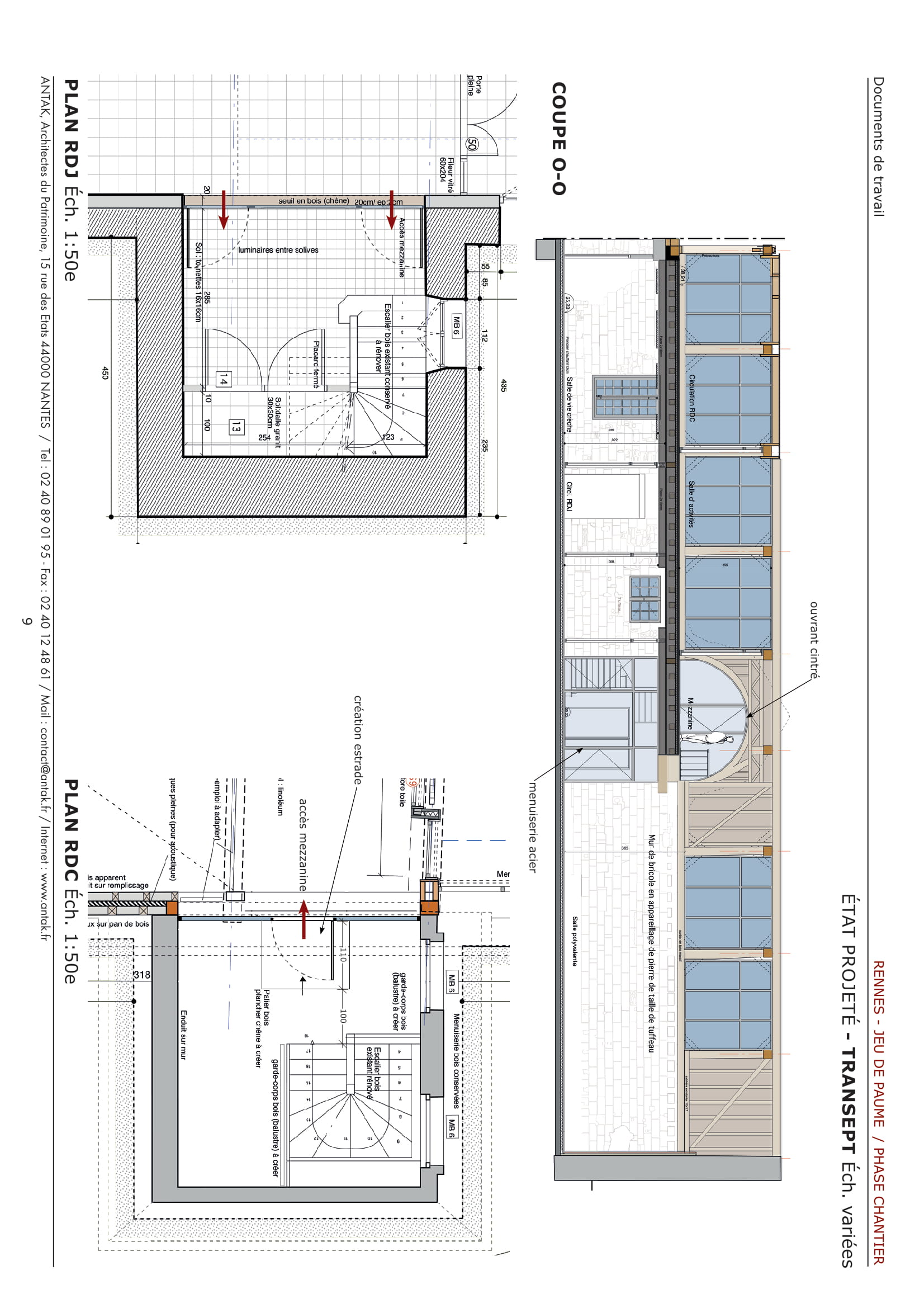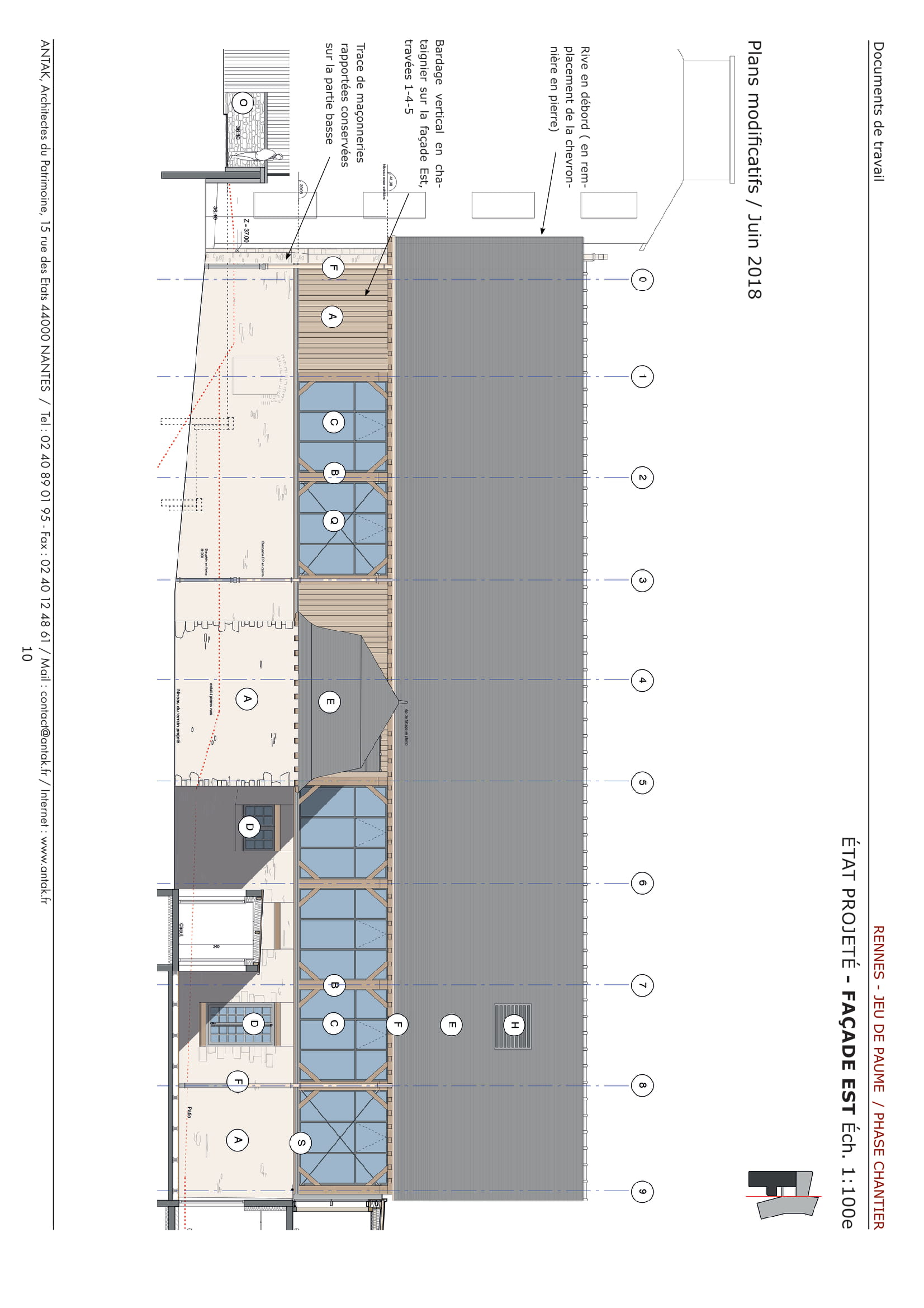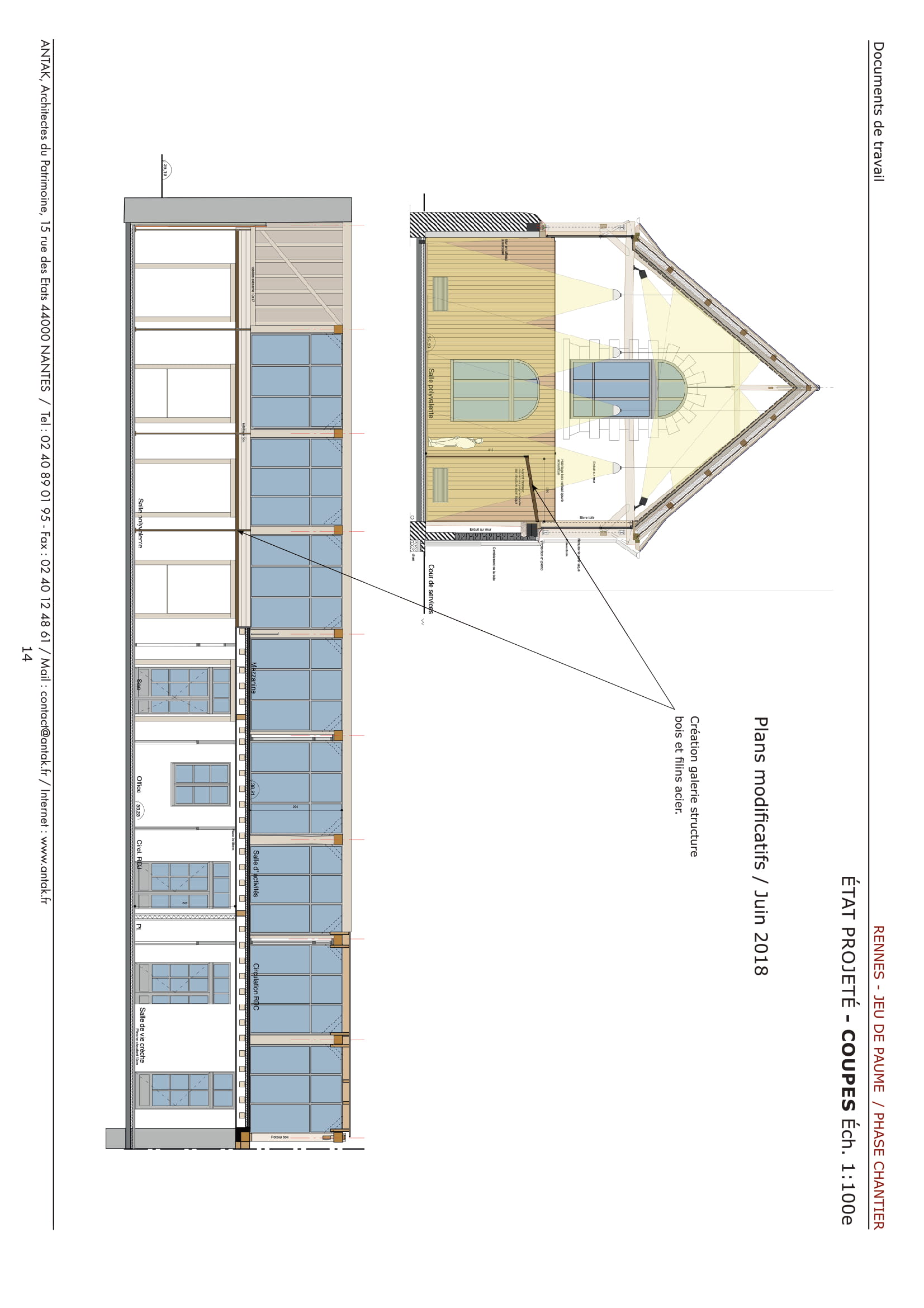 Descriptif technique : La charpente du bâtiment restructuré est composée de fermes et de pannes en chêne restaurées. Un diaphragme lamibois en toiture joue le rôle de poutre au vent et ramène les efforts sur les points durs. La stabilité longitudinale et transversale des structures bois est assurée par des palées de stabilités, des croix de Saint-André et des murs à ossature bois sur les façades. Le plancher haut du rez-de-chaussée est un plancher collaborant mixte bois-béton.