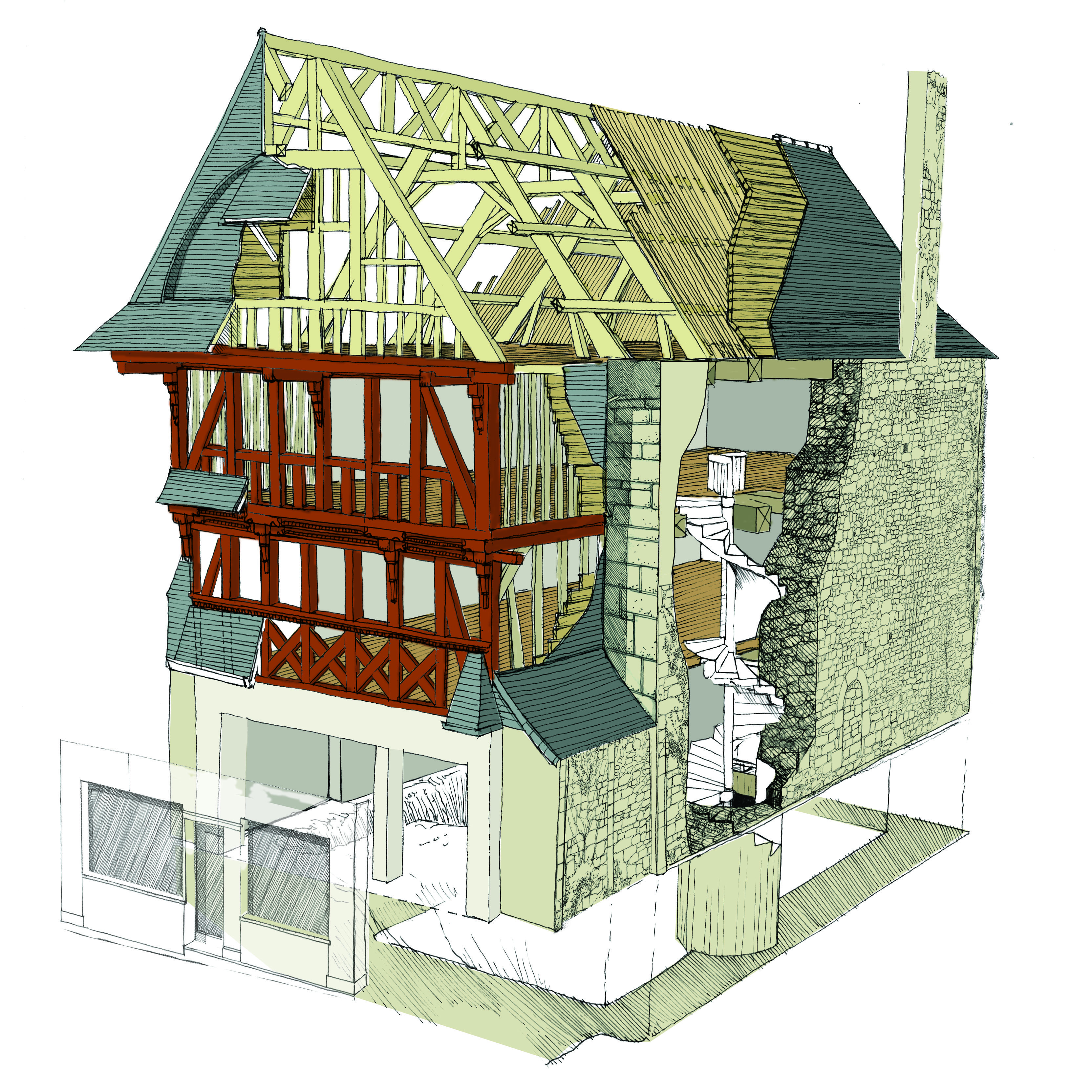 Le projet de restauration vise à révéler la richesse architecturale et historique de cette maison par la restauration de sa structure bois et de sa façade sur la rue Pérès en restituant le porche en rez-de-chaussée. Une de ses caractéristiques majeures est sa structure en chêne datant du XVIe s., dont 70% des bois d’origine ont été conservés et restaurés. Ce projet de restauration se veut simple avec un usage pérenne adapté à son architecture du XVIe s.
