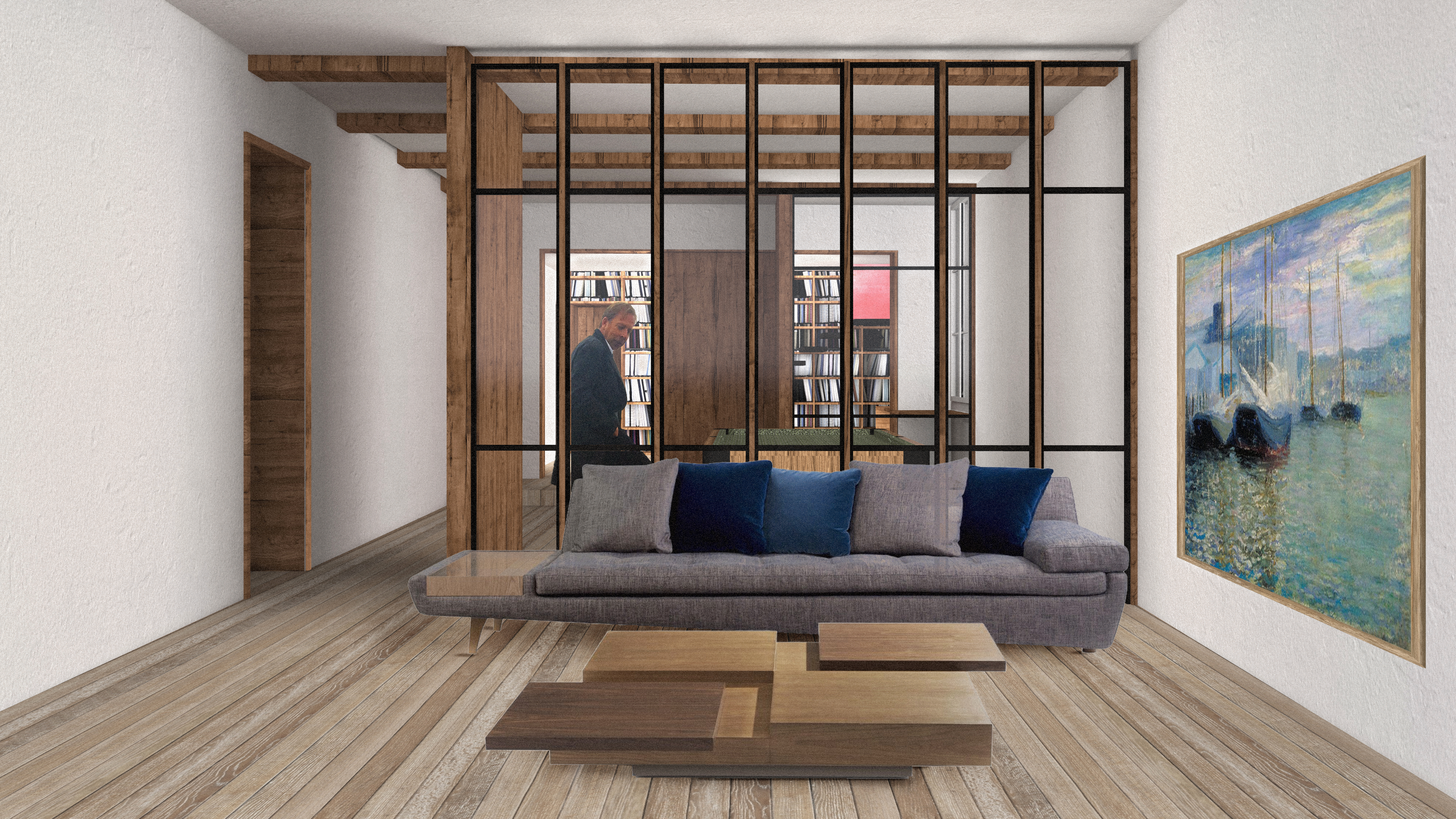 Descriptif technique de l'aménagement : La nouvelle répartition du volume est imaginé avec la volonté de réduire l’impression de longueur du volume intérieur - un espace de 15 x 5 mt sans interruption, sans accident avant projet - par la création d’une succession de pièces où le travail du bois par des menuiseries soigneusement détaillées et de la pierre révélée servent la recherche d’une atmosphère chaleureuse et cossue qui vient pallier au manque de lumière naturelle.
