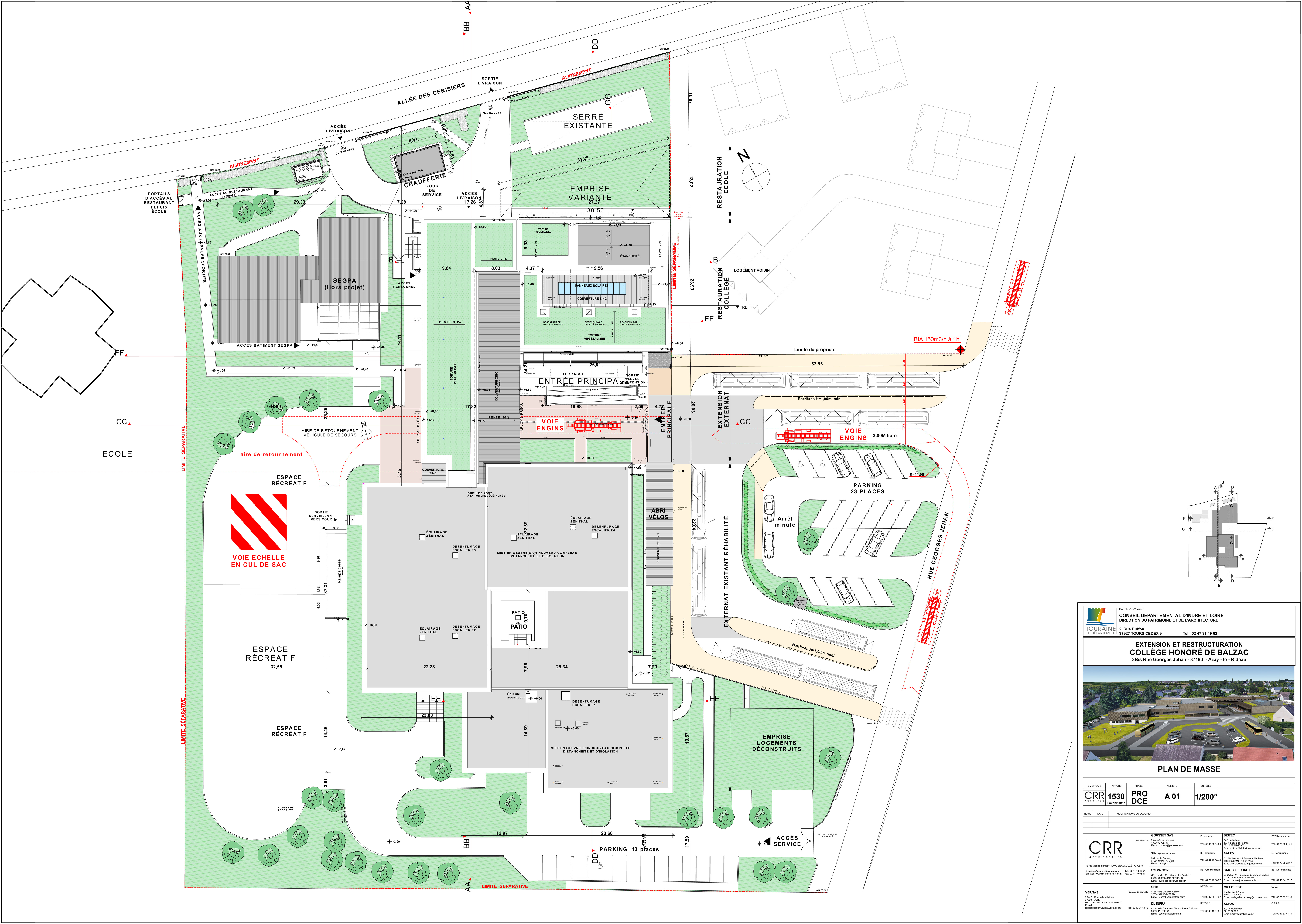Descriptif technique : Désamiantage, restructuration partielle, remplacement intégral des menuiseries extérieures et isolation par l'extérieur du bâtiment existant du Collège, Construction d'une demi-pension, de 6 salles d'enseignement et d'un préau. Réaménagement de l'aire de desserte et de l'accès au Collège PEFC (Gestion forestière durable)