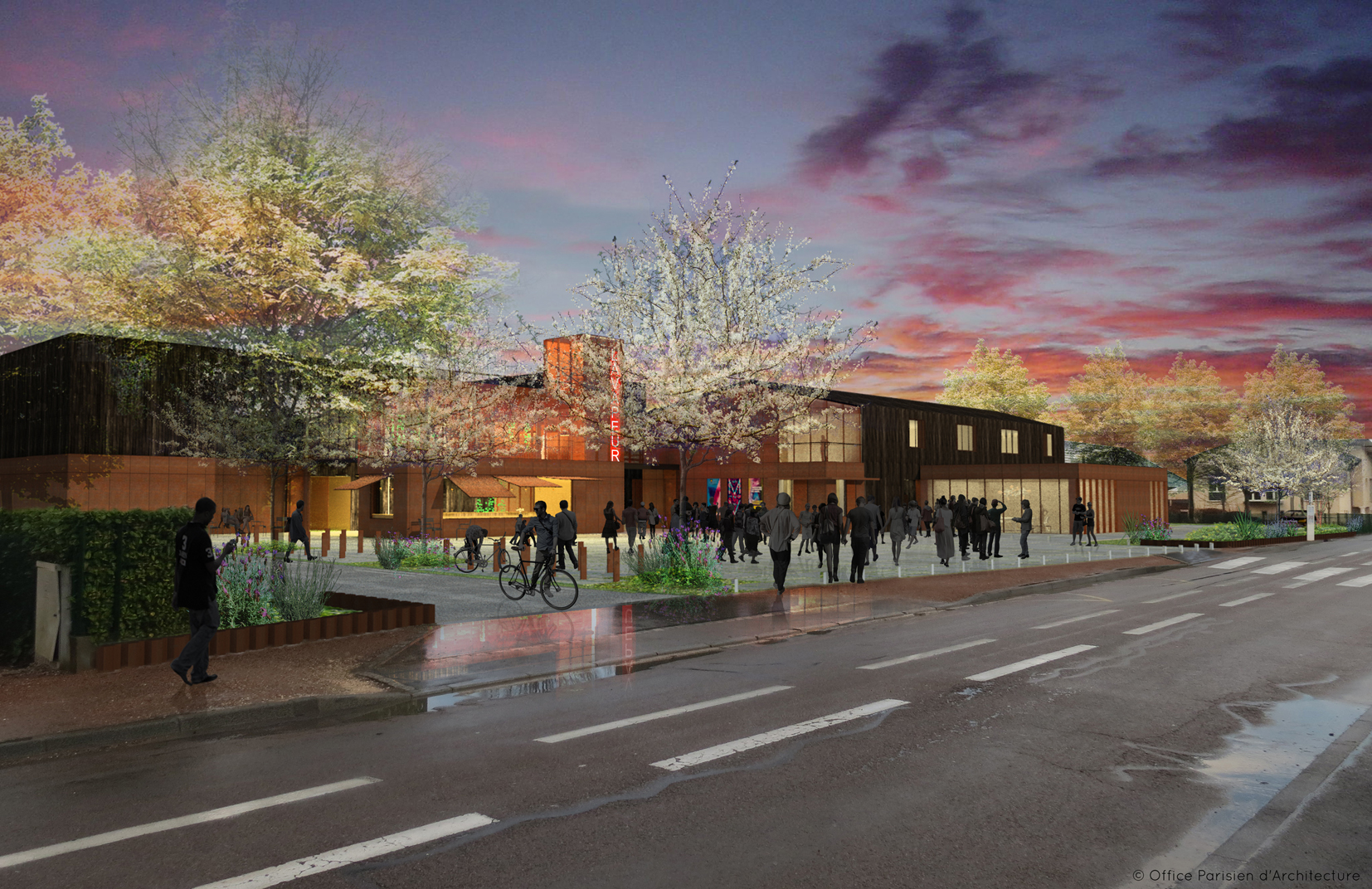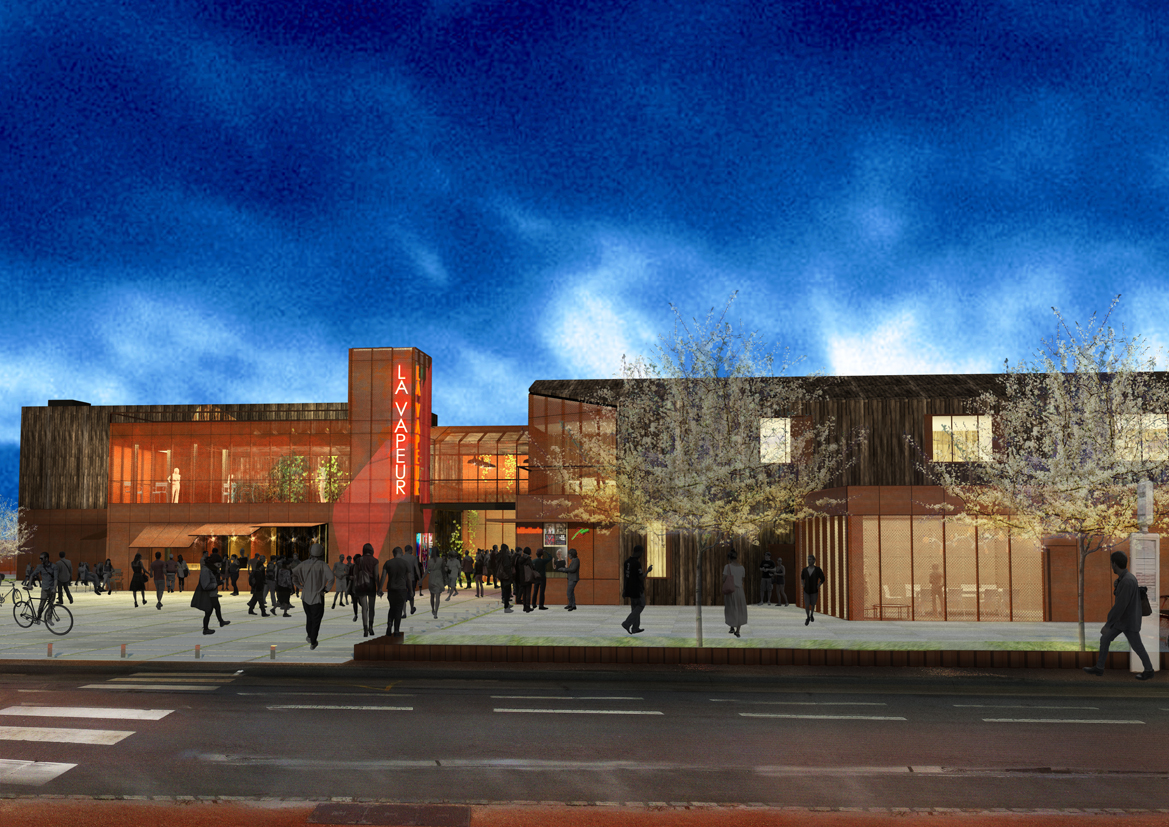 Le programme consiste en la réhabilitation-extension d'une SMAC pour augmenter la capacité d'accueil de 700 à 1200 personnes. Le bâtiment proposé tisse des liens d’amitié avec le quartier. Notre parti a été celui de la générosité et du partage, en libérant le sol et en offrant à la rue un parvis. Les matériaux et les techniques de mise en œuvre (acier Corten, bois brûlé, asphalte, béton, KLH) servent en même temps la technique, l’acoustique et l’esthétique répondant ainsi à l’exigence d’un faible coût de construction au m².
