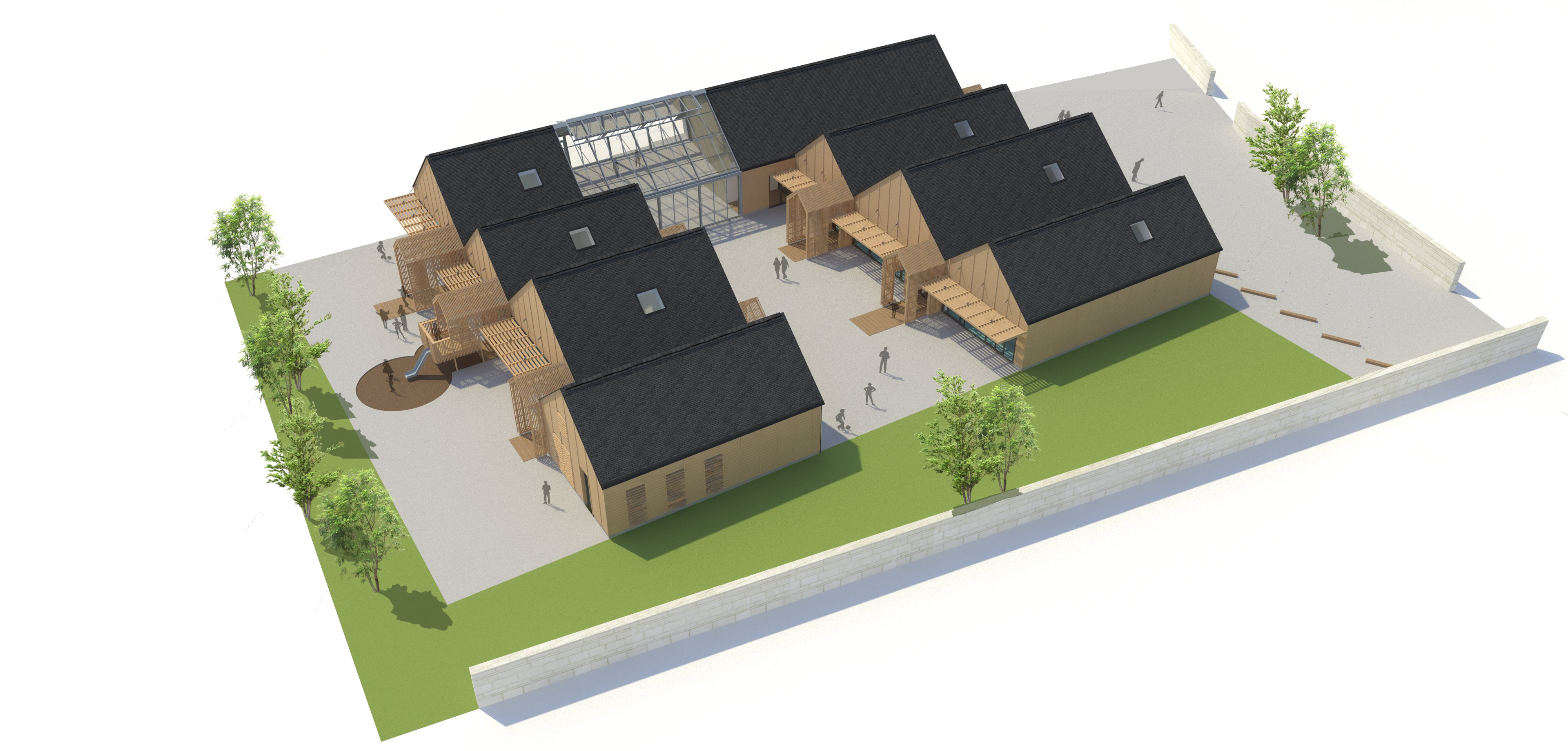 Approche environnementale : Le programme, réparti en 2 volumes bâtis, optimise les apports solaires en doublant les façades vitrées au sud. Au nord, les double-murs en pierre isolent et protègent massivement les locaux. Les 2 ailes d'activités sont reliées par une serre bioclimatique ouverte sur le paysage, protégeant la cour des vents d’ouest. En hiver, cet espace abrité est naturellement tempéré. En été, il s’ouvre largement sur la cour de récréation. Les matériaux bio-sourcés sont privilégiés : charpente et MOB, bardage châtaignier, linoléum, parquet chêne et plafonds fibres de bois.