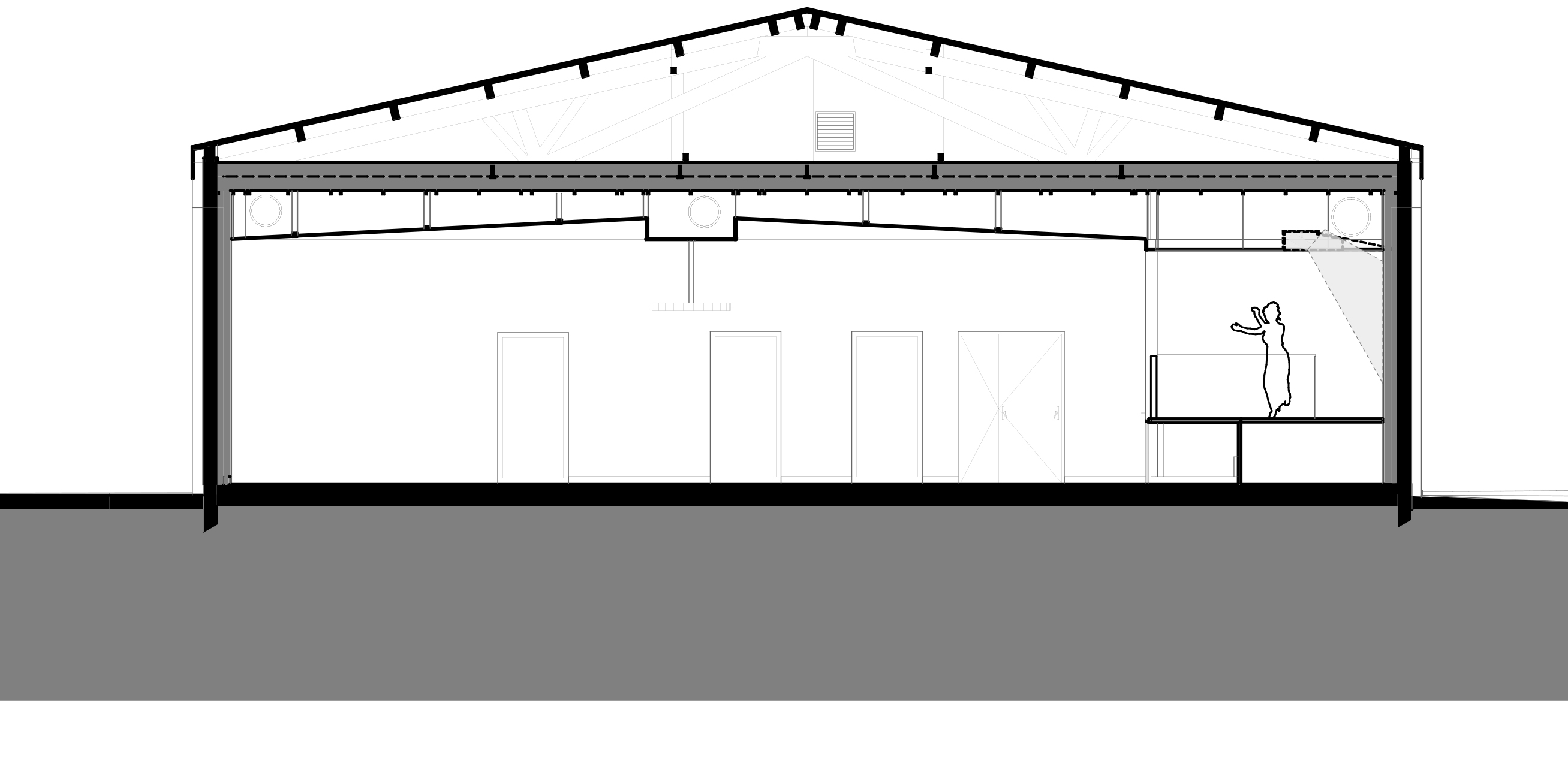 Nous avons été missionnés pour une réhabilitation thermique d'une ancienne salle des fêtes bien trop énergivore pour continuer son fonctionnement. Le volume global du bâtiment existant est conservé en l'état. Trois ouvertures verticales seront créées afin de profiter de la vue sur le paysage et de créer un lien avec la terrasse de la salle polyvalente. Un mur en bardage bois de l'entrée sera le seul élément de façade modifié. La structure de notre intervention sur bâtiment est en Ossature bois. L'intérieur de la salle polyvalente est entièrement réaménagé: Un lambris bois est posé au mur, tandis qu'au plafond des modules de faux-plafond suspendus en bois et un voile acoustique noir permettent d'intégrer le nouveau système de ventilation double flux à récupération de chaleur.