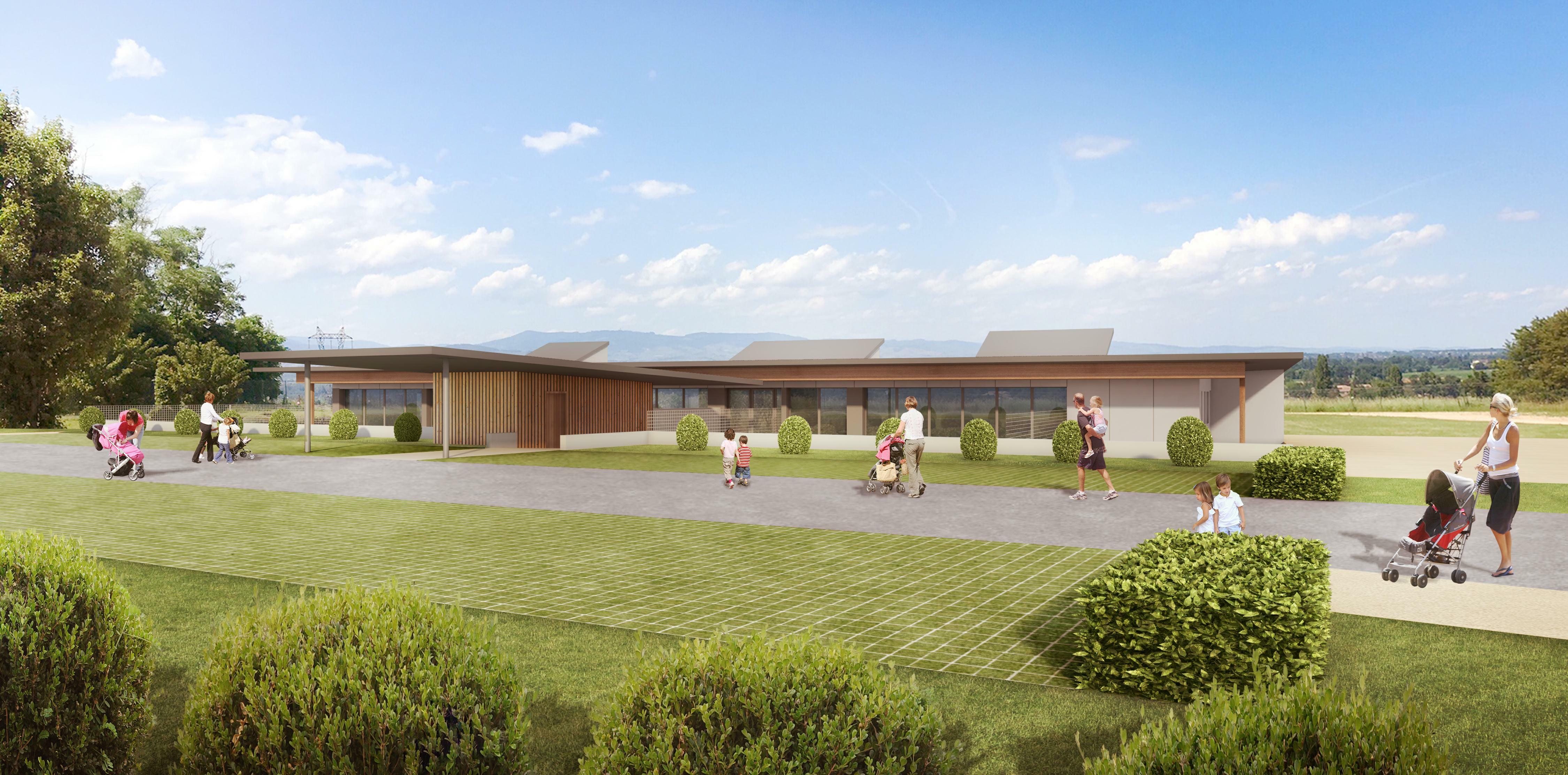 Bâtiment entièrement de plain-pied, très horizontal qui se fond dans les lignes du paysage, sans rivalité avec le complexe sportif existant Seuls 3 « sheds », tels des paupières ouvertes sur le site dégagé prennent la lumière du Nord, apportant une lumière naturelle au coeur des circulations de l’équipement La forme rectangulaire du bâtiment, les larges débords de toiture et une couverture essentiellement végétalisée accentuant cette insertion dans le paysage. Un préau d’entrée accueille parents et enfants. Ce préau articule les deux fonctionnalités du bâtiment (crèche à l’Ouest, Relais Assistantes maternelles à l’Est) avec deux cours, espaces extérieurs Sud.
