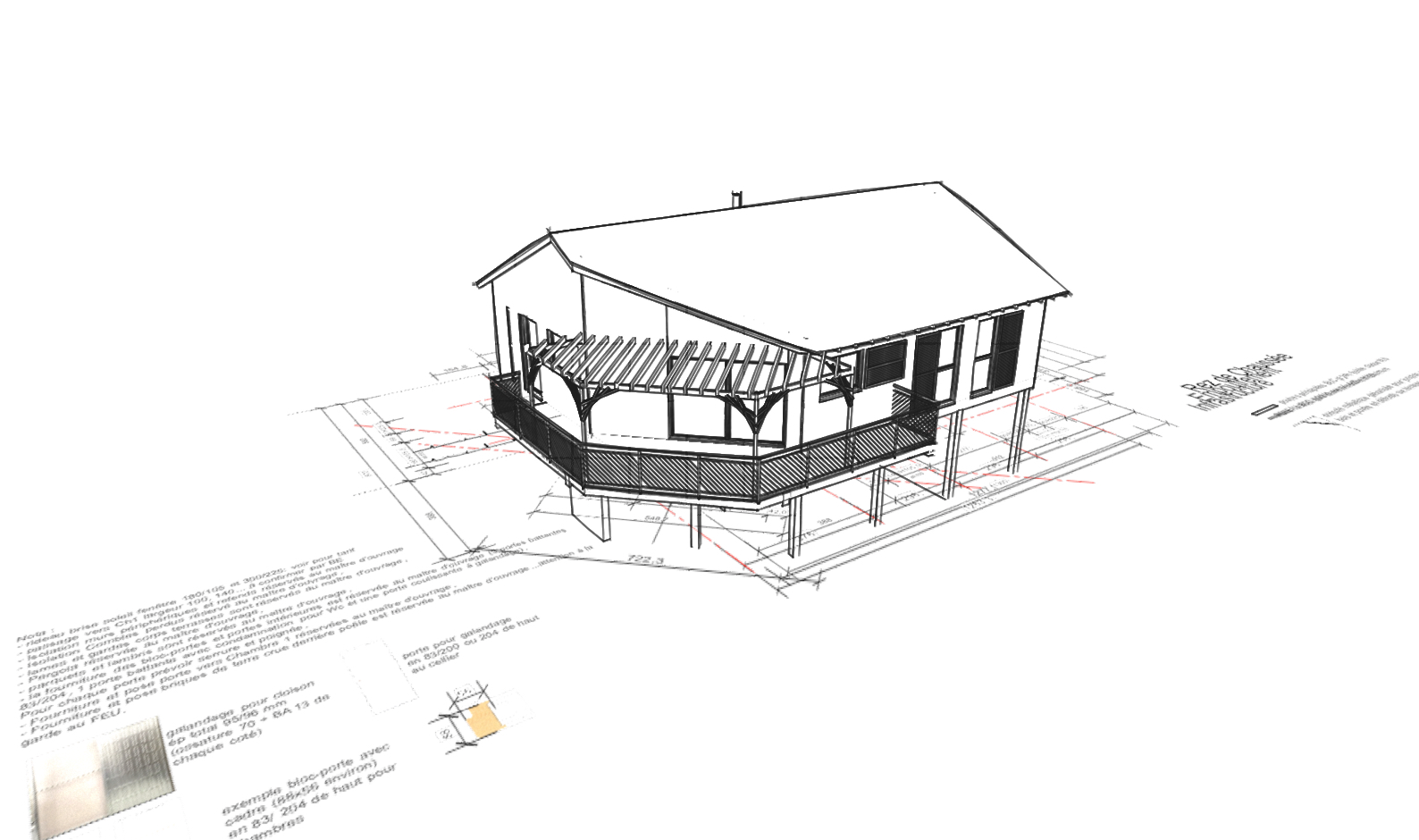 Approche environnementale : Les abords existants sont conservés en l'état. Le parement en lames de douglas ne sera pas traité et obtiendra ainsi une patine idéale à son intégration. Le volume totale (poteaux/dalle/ mur/charpente/parquet/bardage/lame terrasse/isolant) représentent 30 m3. On sait que l'utilisation de 1m3 de bois permet de retirer 0,9 tonne de CO2 de l'atmosphère ici 27m3 de CO2 en moins. Les matériaux de notre construction sont réutilisables. Les bois sont issus de forêts situées dans un rayon de 200 kms et sont sciés et taillés en Lozère participant ainsi à une économie circulaire vertueuse et locale.