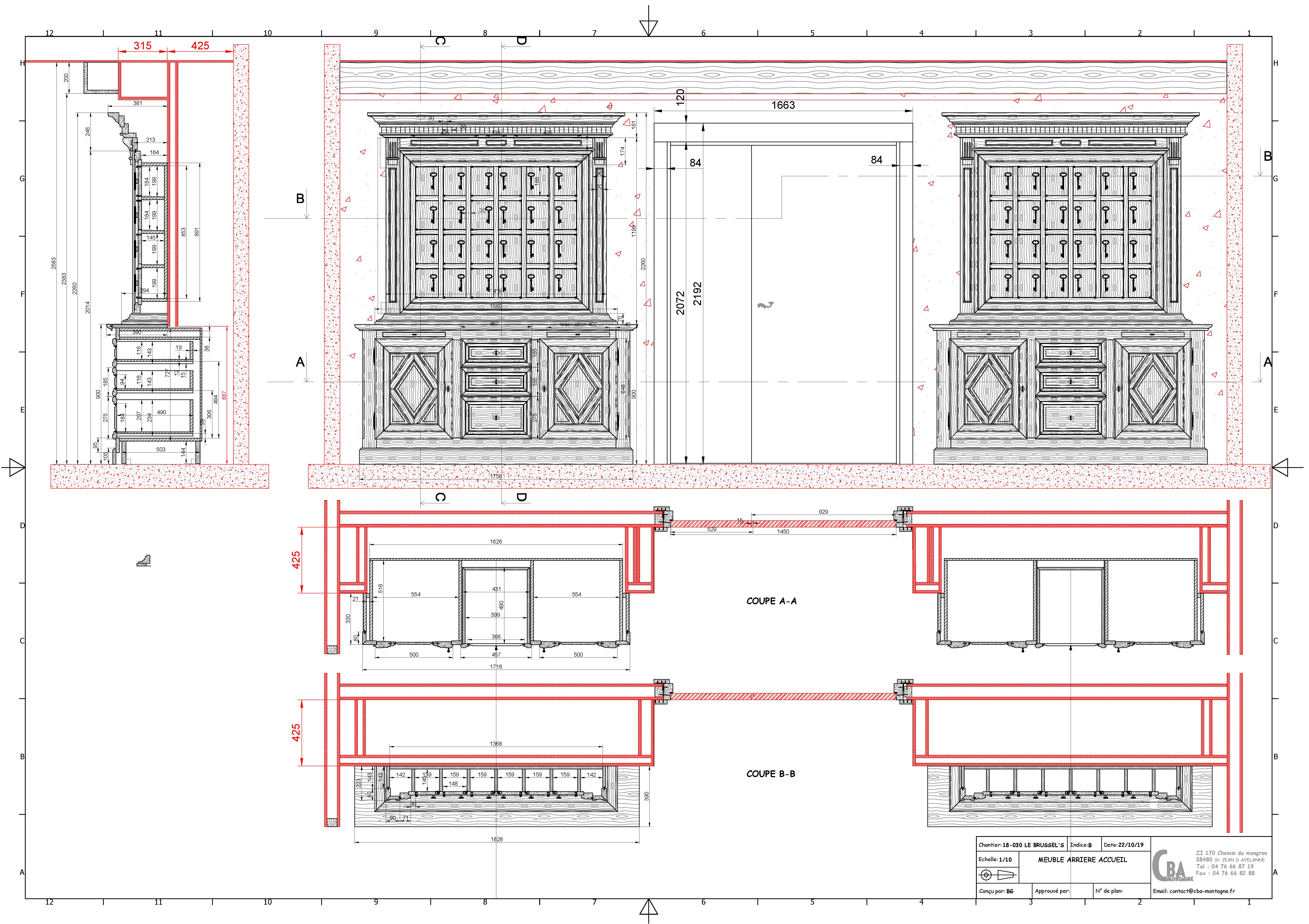 Descriptif technique de l'aménagement : Menuiserie intérieure : - Portes (palières et de communication) - Châssis vitrés - Escalier monumental - Habillages muraux et plafonds - Poutres décoratives (certaines atteignent 8 mètres de long ) - Parquet Agencement : - Chambres et Suites (dressings, meubles sous vasque, habillages baignoires, mobilier de rangement, cuisines) - Banques accueil - Bar et arrière-bar - Restaurant - Bibliothèque - Sauna en vieux bois - Skiroom (banquette, penderie , bureau accueil, vitrine )
