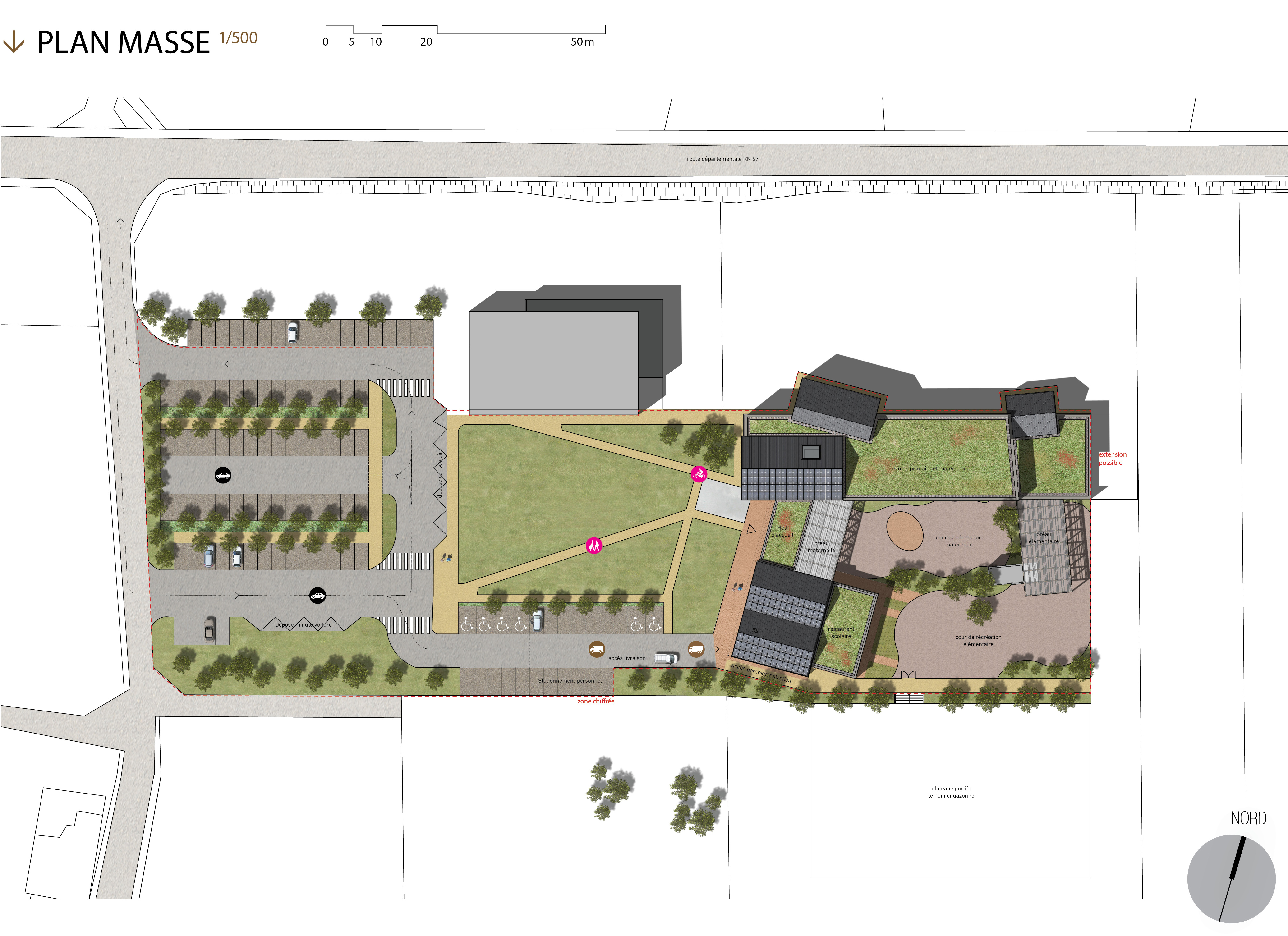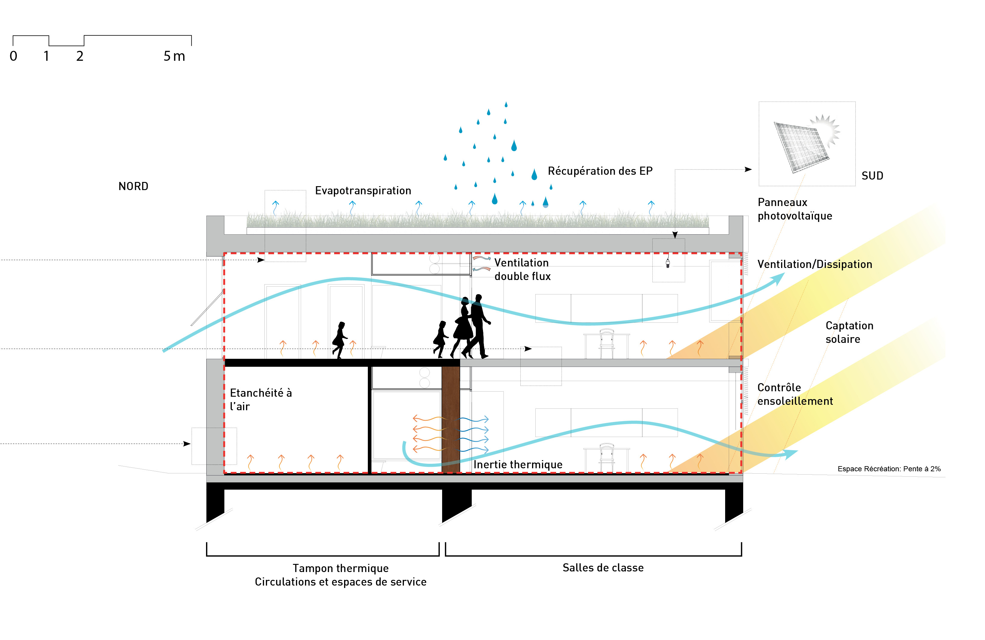 Approche environnementale : Le groupe scolaire se caractérise par: - une compacité maitrisée pour un fonctionnement optimal et une recherche prioritaire pour un ensoleillement maximum avec des façades principales orientées Sud. - Un éclairage naturel de partout, - une ambiance climatique recherchée par l'utilisation de matériaux naturels, peu transformés et biosourcés, avec la terre, le bois et la paille, pour une ambiance saine, naturelle et confortable.