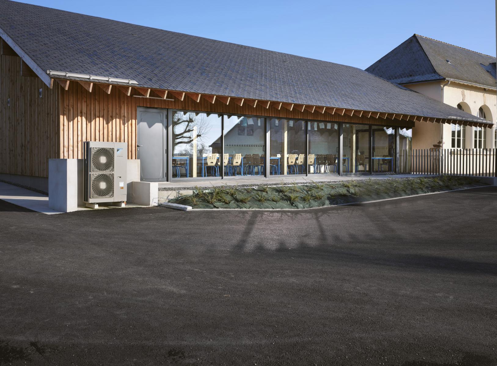 Le nouveau restaurant scolaire s’inscrit dans la continuité de la mairie et de l’école élémentaire. Sa toiture élancée lui permet de se raccorder harmonieusement aux deux équipements existants et donne une nouvelle cohérence à l’ensemble. La couverture en ardoise traditionnelle est réinterprétée de façon contemporaine et constitue le cœur du projet : la charpente se compose de deux versants décalés qui créent une faille en faîtage pour apporter une lumière zénithale dans le réfectoire. La structure bois est laissée apparente et renforce la légèreté de la toiture.