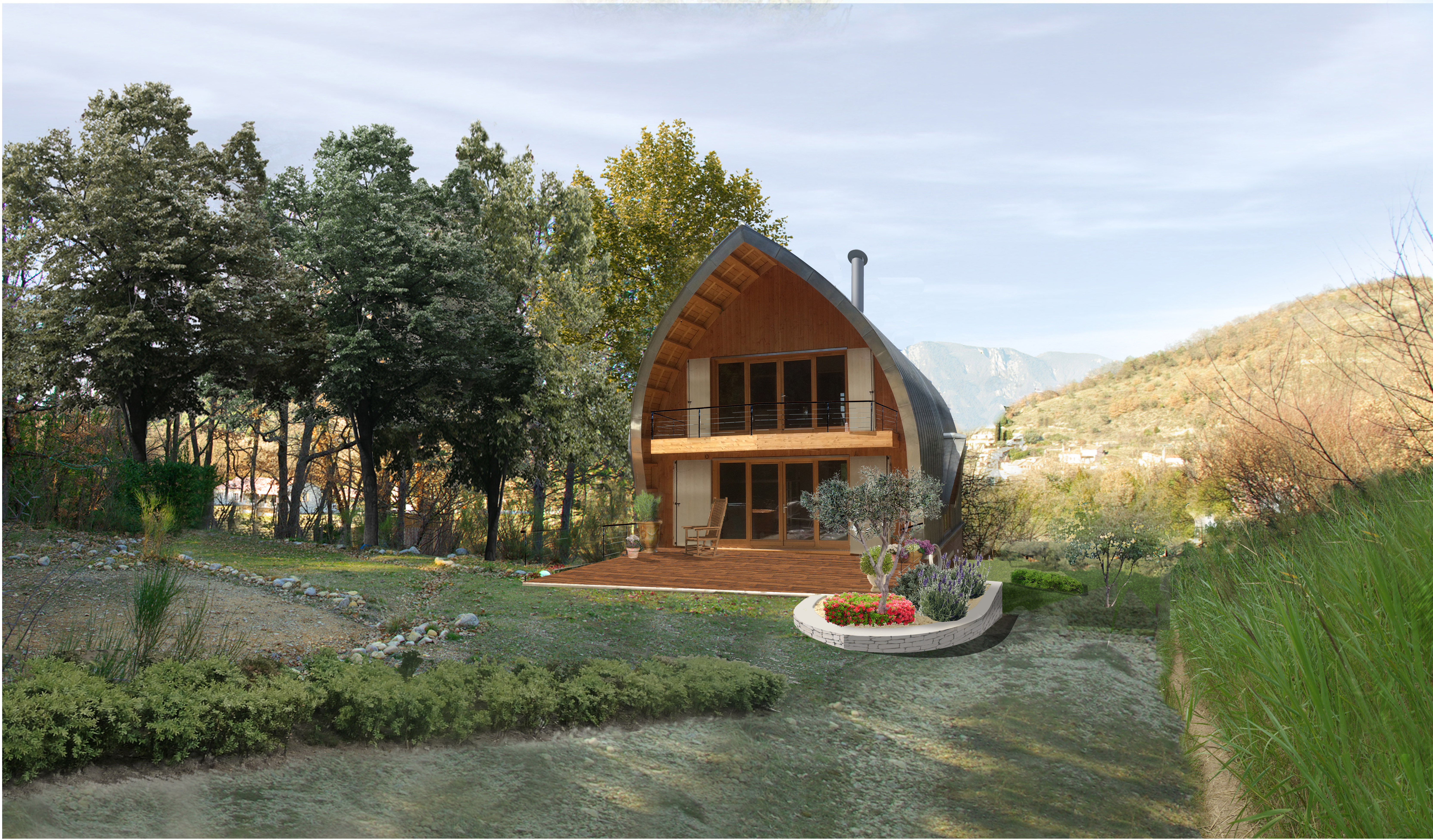 Ce projet implanté dans la partie médiane du terrain, bénéficie d’un ensoleillement confortable et d'un point de vue sur la Vallée et du vieux village, blotti sur le coteau Sud d’en face, de l’autre côté de la rivière. Le parti architectural, en forme de "tente", résulte de la parcelle étroite et allongée orientée N/S et de la volonté de traduire, en dur, la pratique estivale familiale du camping depuis plusieurs générations et d'en user toute l'année. La "Nef" renversée, de la charpente en LC devient murs et abrite 2 étages tout bois, posés sur un socle maçonné en agglos de bois 1/2 enterré.