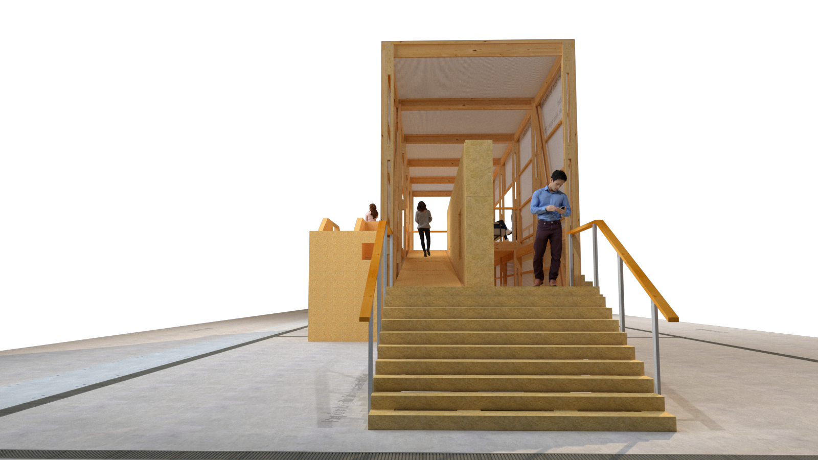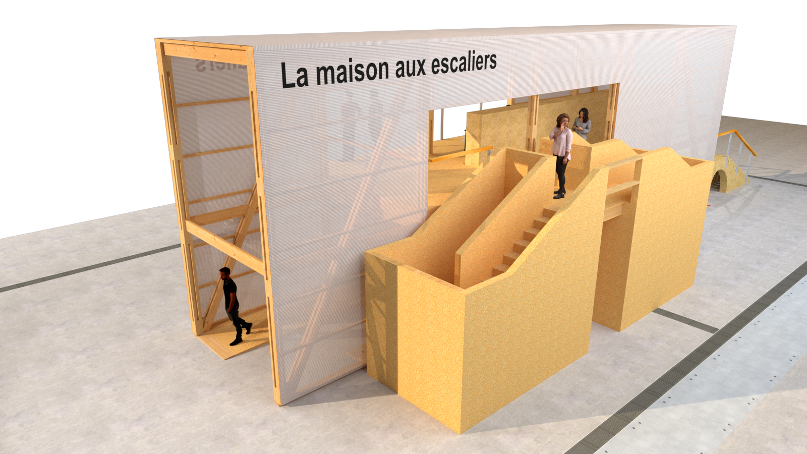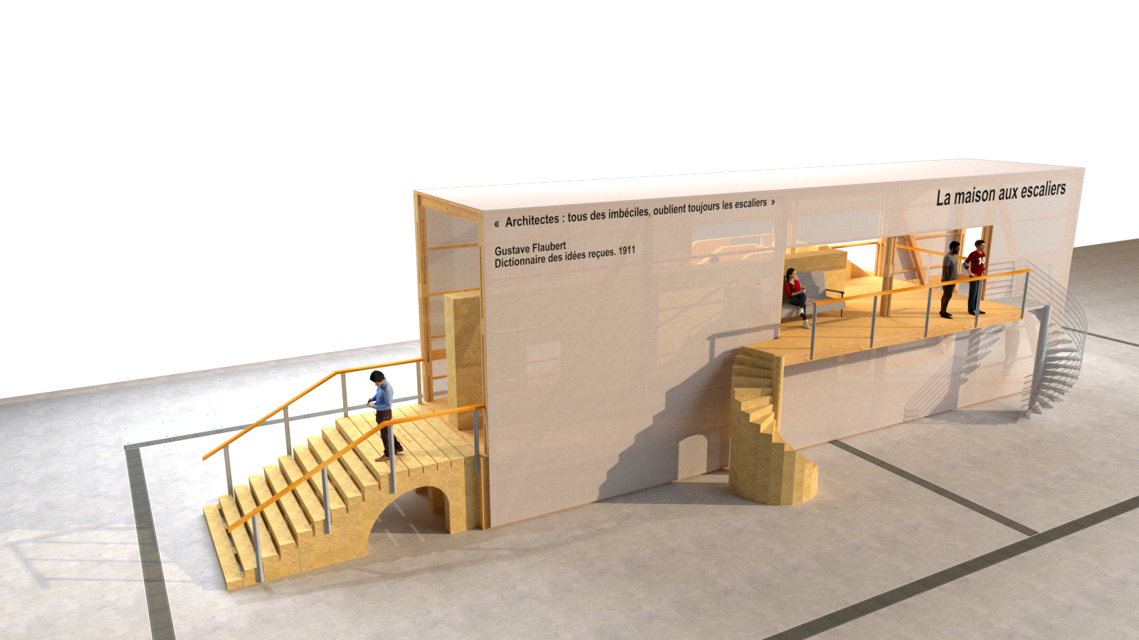 "La Maison aux Escaliers" est une installation architecturale temporaire destinée à l'apprentissage expérientiel de la conception et de la réalisation de différents types d'escaliers et rampes composant "une promenade architecturale" dans un espace démonstrateur. Elle est réalisée en 5 jours aux GAIA par 48 élèves architectes de 1ère année en collaboration avec des jeunes charpentiers, tailleurs de pierre, et métallier-serruriers en formation auprès des Compagnons du Devoir et du Tour de France (centres de Villefontaine, de Rodez et de St Etienne), encadrés par des compagnons-formateurs de l'AOCDTF et des enseignants-chercheurs de l'ENSAG. Ce module d'enseignement partagé étant destiné à se répéter chaque année, les éléments le composant ont été préfabriqués, démontés et stockés en vue de leur réemploi lors des prochaines sessions. L'objectif pédagogique est de permettre, dès le début des études, la compréhension des logiques de conception et de construction propres à chaque matériau afin d'installer la notion de "culture constructive" aussi bien chez les concepteurs, que chez les constructeurs, afin de leur donner le goût commun d'être "des bâtisseurs d'espaces habités". Le projet architectural décline plusieurs mode de déplacements et d'élévation dans un espace démontrant des effets variés de matérialité, de lumière, de transparence, d'ouverture et de dispositions spatiales. Au terme de la réalisation en quatre journées pleines, les étudiants architectes sont invités à un travail d'analyse, de prise de notes et de représentation de l'objet réalisé. Un carnet de bord personnel sert de base d'évaluation de leur implication et de l'acuité de leur regard. La formation s'accompagne de cours théoriques de conception d'escaliers et de références architecturales, dispensés en début de session et en cours du soir.
