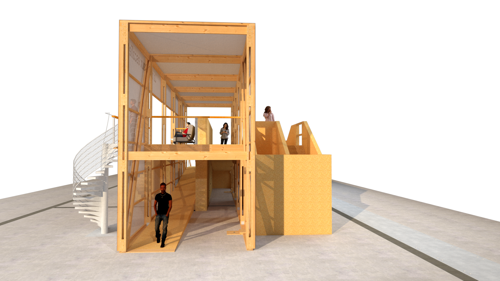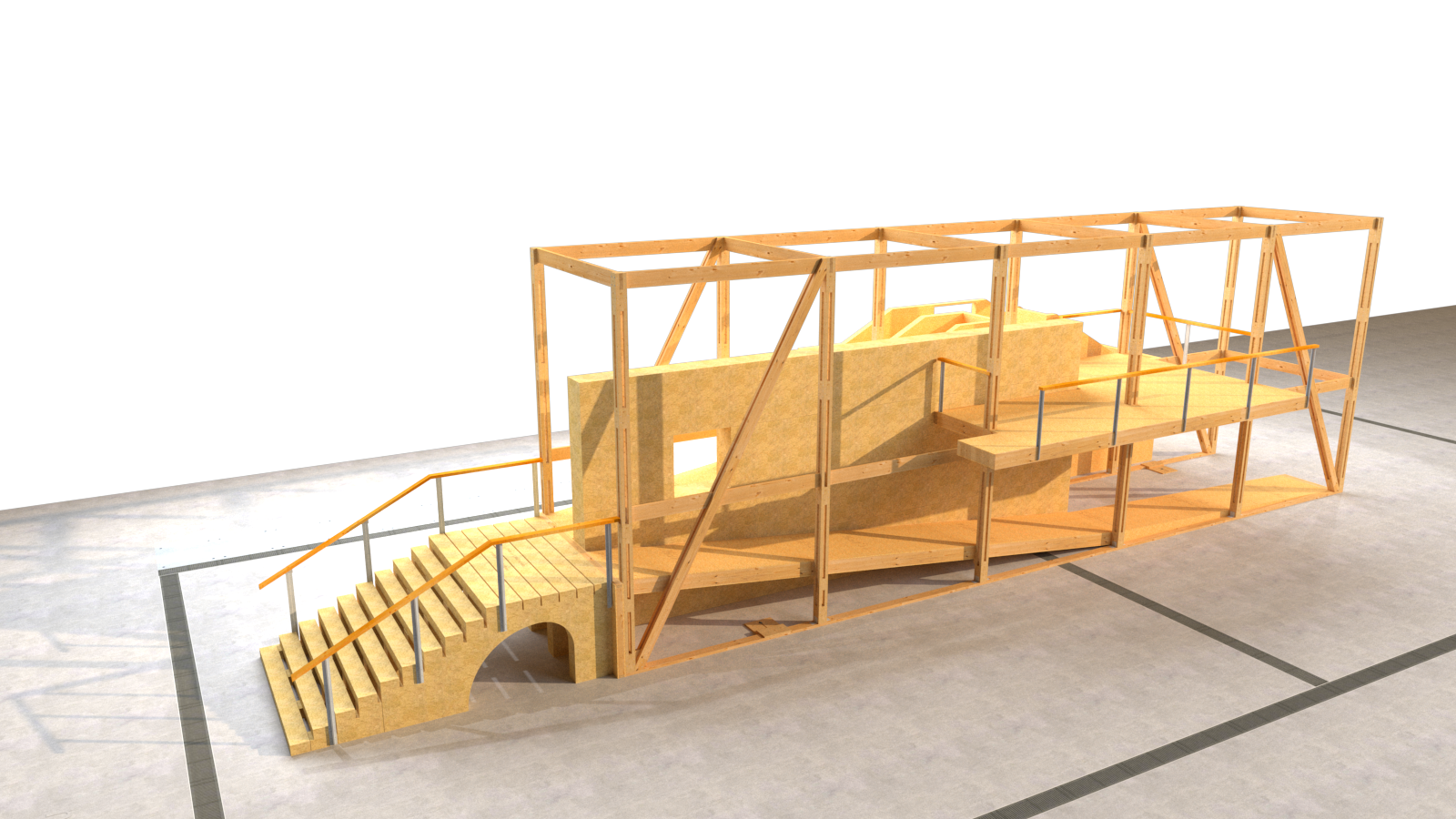 Descriptif technique : La construction est organisée autour d'un mur central de 10 m de long, 0,5 m d'épais et 4m de haut, réalisé en blocs de pierre massifs posés au pont roulant. Des rampes de 1,20m de large s'enroulent autour du mur et desservent une plateforme d'observation située à + 2,89m. Ces ouvrages sont réalisés en caisson à ossature en bois massif revêtus de panneaux OSB sur deux faces. Six portiques en profils bois reconstitués vissés à partir de tasseaux 55 x 55 mm, composent un volume de 17,40m de long, 3,50m de large et 5,70m qui enveloppe le mur et les rampes. L'ossature bois supporte des panneaux de façade et toiture textile montés sur des cadres bois. Un escalier droit sur arc rampant et un escalier hélicoïdal en pierre, un escalier hélicoïdal en acier, et deux escaliers demi tournants droit et balancé en bois, desservent la plateforme d'observation et propose un circuit en boucle ininterrompue. L'ensemble permet aux jeunes apprenants des divers cursus de comparer les exigences techniques de chaque matériau ainsi que les gestes spécifiques à chaque métier, et d'évaluer l'impact d'une organisation de chantier rigoureuse garantissant la sécurité de cent personnes travaillant de concert, dans un délai très court. Le projet permet ainsi de mesurer l'ampleur de la force du collectif... L'ensemble est démonté en une demie journée le dernier jour du module d'expérimentation. L'équipe logistique des GAIA a apporté son soutien continu aux enseignants-chercheurs et aux compagnons formateurs durant la période de préparation et durant le déroulement du projet. La société Serge Ferrari a fourni les toiles techniques de l'enveloppe. Swiss Krono a fourni les panneaux OSB. Würth France a fourni la visserie et des chevilles de connexion bois/pierre. L'ENSAG, avec l'aide de l'IDEX de l'Université Grenoble-Alpes, a financé les coûts afférents au fonctionnement de sa filiale GAIA, à la fourniture des matériaux et du matériel acheté, ainsi qu'au déplacement et à l'encadrement de ses 48 étudiants dans le cadre du module S2AX de son programme pédagogique de Licence 1. L'AOCDTF a financé les coûts afférents au déplacement, à l'encadrement et à l'hébergement de ses 55 apprenants (35 tailleurs de pierre, 10 charpentiers, 10 serruriers-métalliers) dans les divers types et niveaux de formations invités à participer à l'expérience. Le projet convoque donc des savoirs architecturaux et techniques, mais aussi beaucoup d'ingénierie pédagogique destinée à promouvoir les modalités d'apprentissage de type design-build, et notamment la construction en bois. Marquage CE