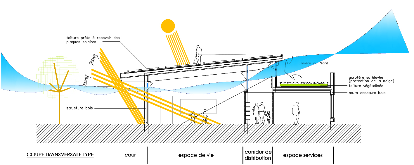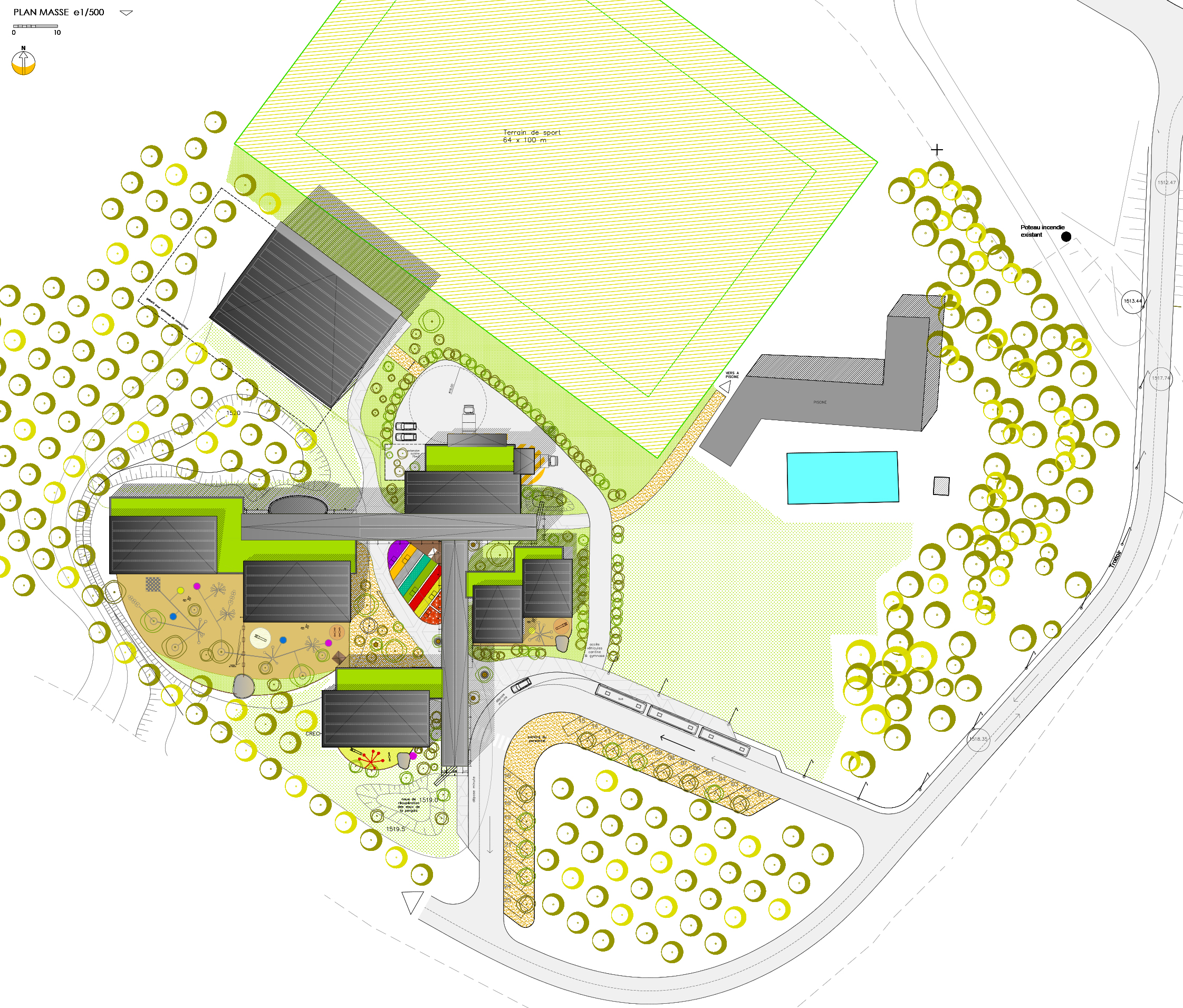 Tous les bâtiments du pôle (crèche, centre de loisirs, école, cantine et gymnase) sont construits de plein-pied. Ils sont disposés selon une orientation stricte Nord-Sud le long de deux cheminements croisés orthogonaux protégés d’une ombrière bois. Chaque bâtiment s’organise de la même façon : un espace servant au Nord retranscrit au travers d’un volume bas revêtu en bois, et sur la partie Sud, un volume plus haut revêtu en métal, qui accueille les espaces de vie. Ce jeu de toitures apporte sur la zone de vie des entrées de lumière naturelle côté Nord et une ventilation croisée sur l’ensemble des salles de cours. Le débordement de la toiture côté Sud permet la protection solaire et aux intempéries.