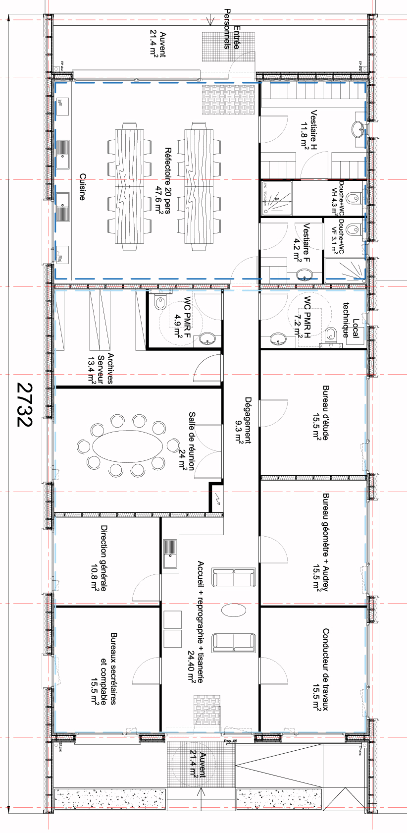 En réponse à une simple demande de dépôt de PC pour des modules préfabriqués de bureaux standards nous avons conçu un projet sur-mesure et porteur d'une identité visuelle forte pour créer le siège et les locaux sociaux d'une PME de travaux publics. L'ossature bois nous a permis de répondre aux enjeux économiques et calendaires du projet (4 mois de travaux !) La conception intérieure des locaux permet la modularité des cloisons sans démolir les plafonds acoustiques ni les sols en carrelage.