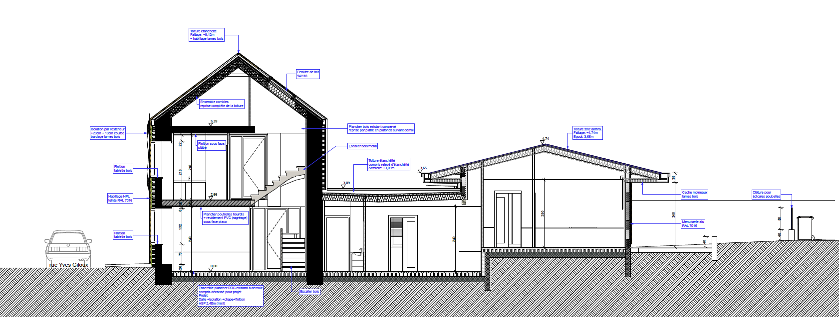 Descriptif technique : L’existant est composé avec une isolation thermique par l’extérieur avec recouvrement en bardage Douglas. En limite de propriété, le pignon est traité par un enduit minéral. L’habillage bois vient alors coiffer l’ancien volume de l’habitation sur les façades ainsi que la toiture. L’extension de plain-pied s’étend dans le jardin et est composée par des murs en ossature bois avec revêtement Douglas et une couverture en aluminium anthracite.
