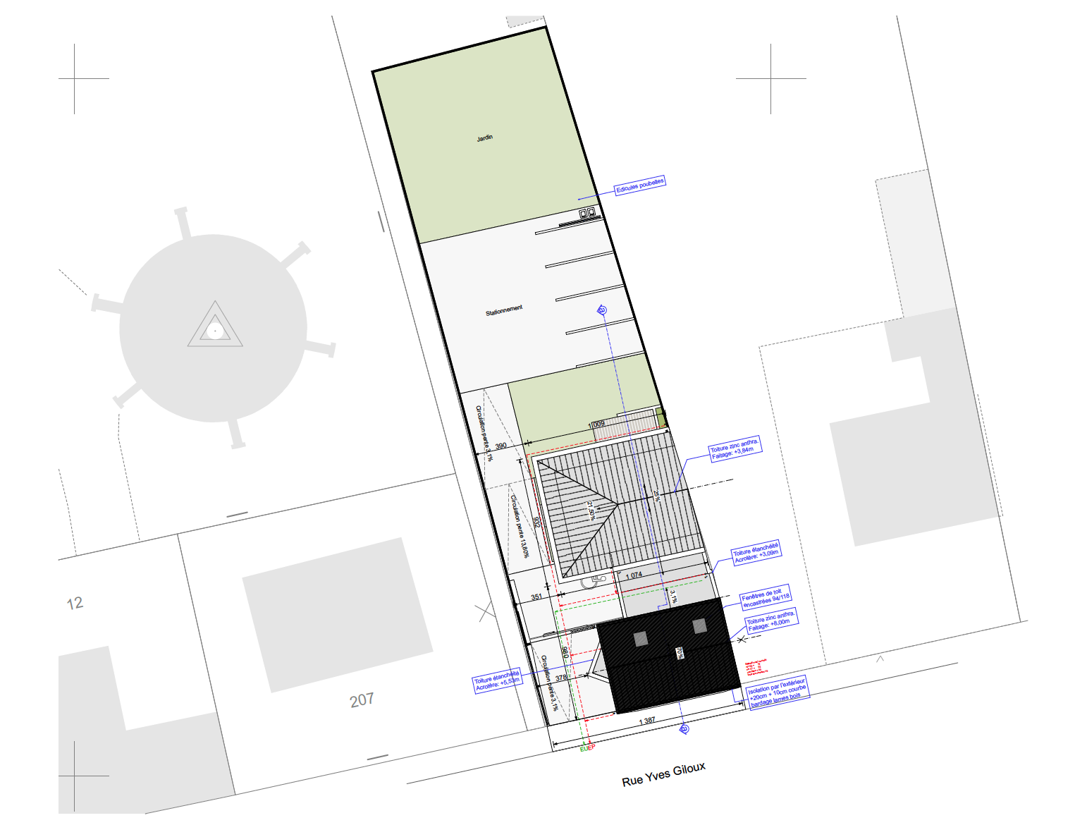 Cette maison des années 30 a été réhabilitée et restructurée pour y installer l’agence d’architecture. Le volume principal est conservé, mais entièrement réinterprété. Une extension de plain-pied s’étend dans le jardin à l’arrière. La façade traditionnelle sur rue est réinterprétée et épurée à une simple expression de volume. Les carrés de cheminée, les chevronnières supprimés dessinent une enveloppe simple qui est ponctuée par les trames de bardages ajourés. Une forme libre d’interprétation anime la façade sur rue par le jeu des ombres et profondeurs dans la structuration du bardage.