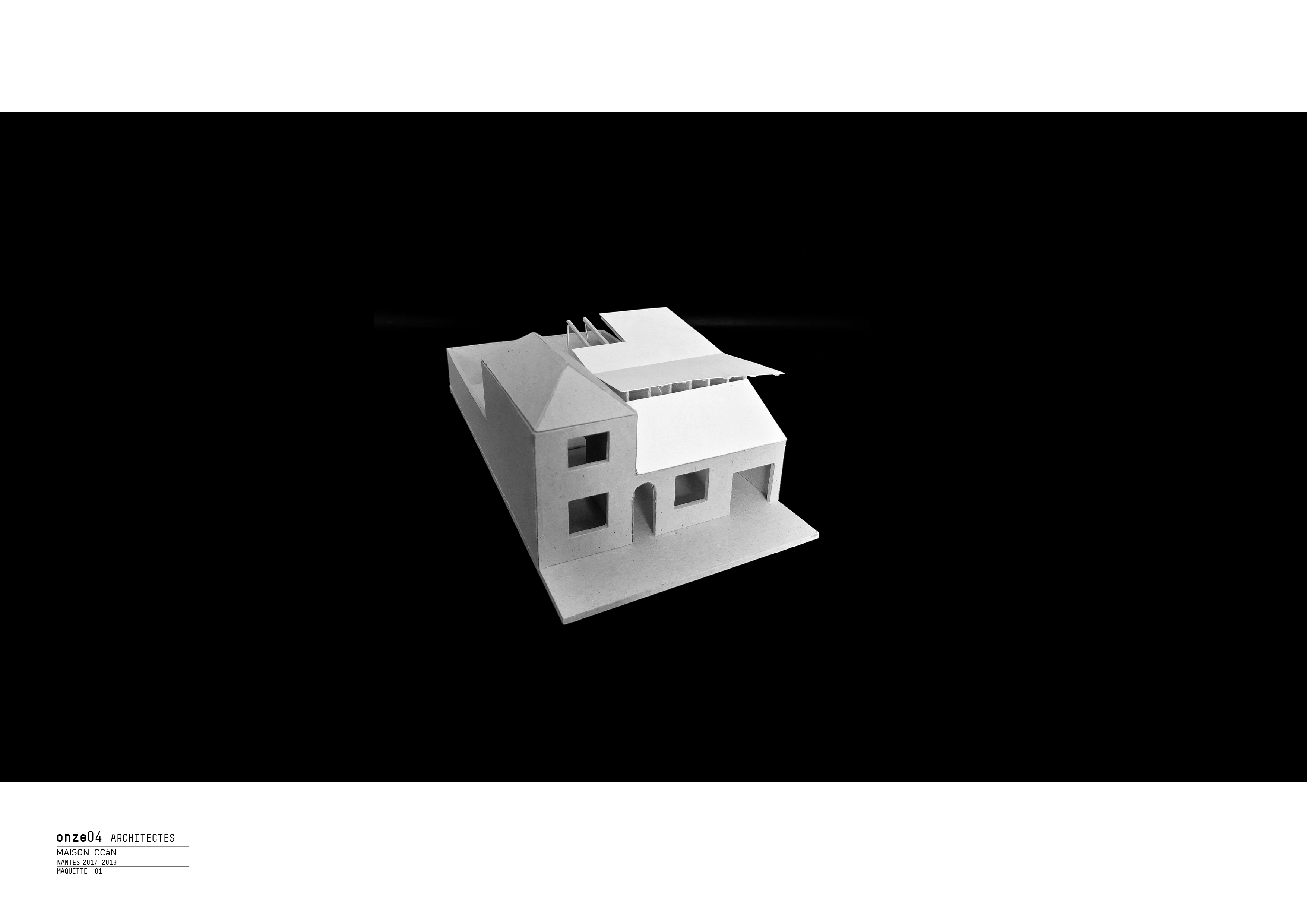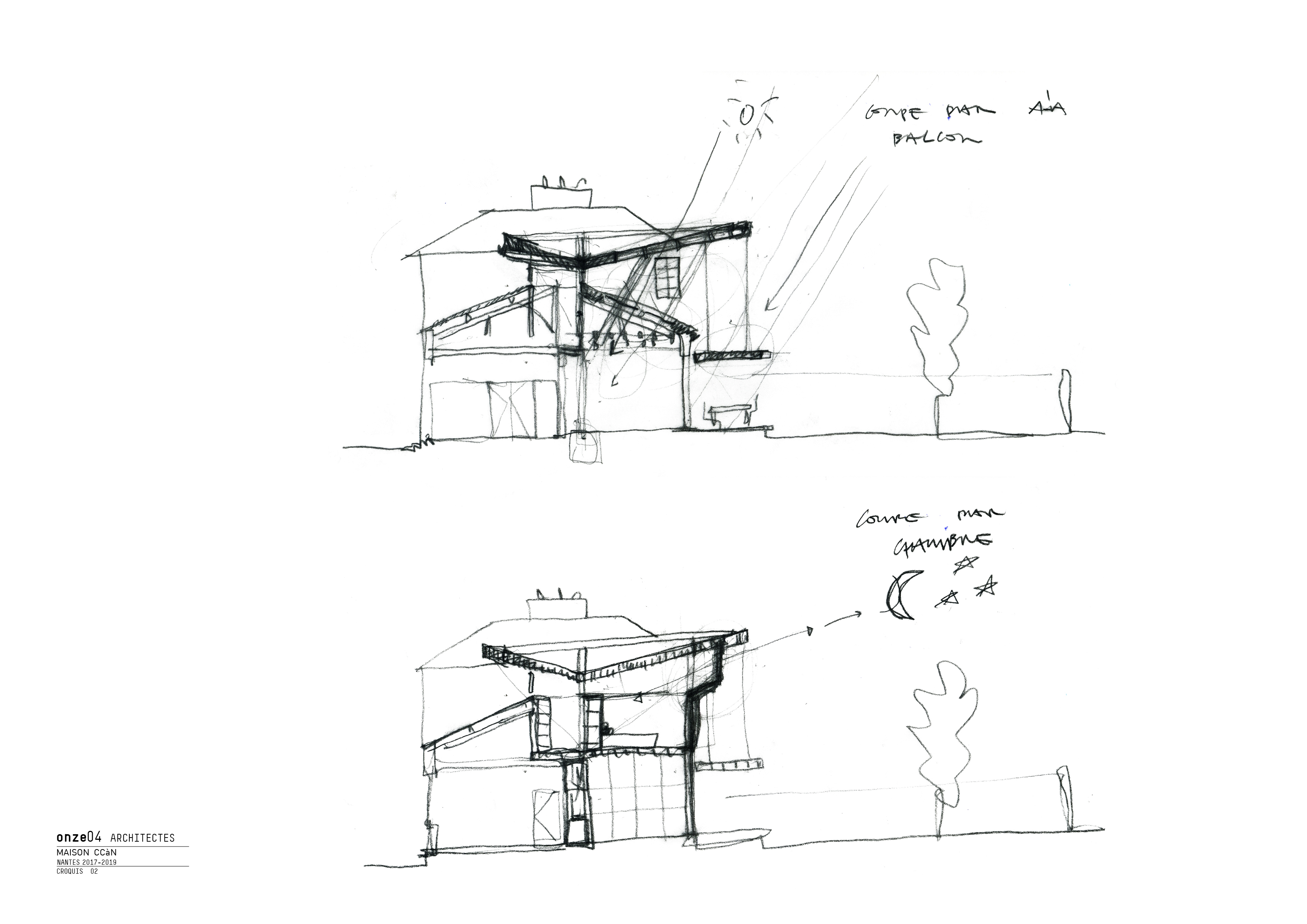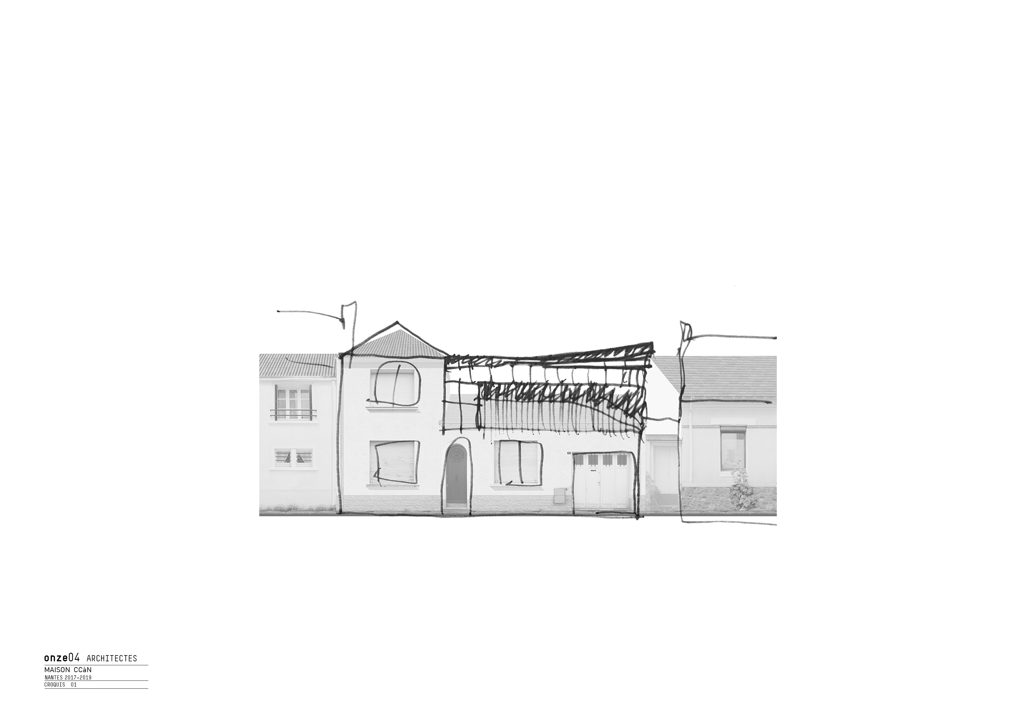 Afin de respecter l’environnement patrimonial de l’avenue où est située la maison, le projet propose d’avoir l’impact le plus faible possible sur la rue. Nous avons réalisé une toiture à pente inversée, qui se décolle de la toiture existante grâce à une fine bande de fenêtres. Cette toiture, en retrait de la façade, tourne légèrement vers l’Ouest afin de relier visuellement le projet à la maison voisine et présenter ainsi une continuité urbaine. Si sur la rue, la toiture veut rester discrète, sur le jardin, le nouveau volume s’exprime pleinement. Les chevrons nécessaires à la structure sont prolongés et une pergola vient s’y suspendre.