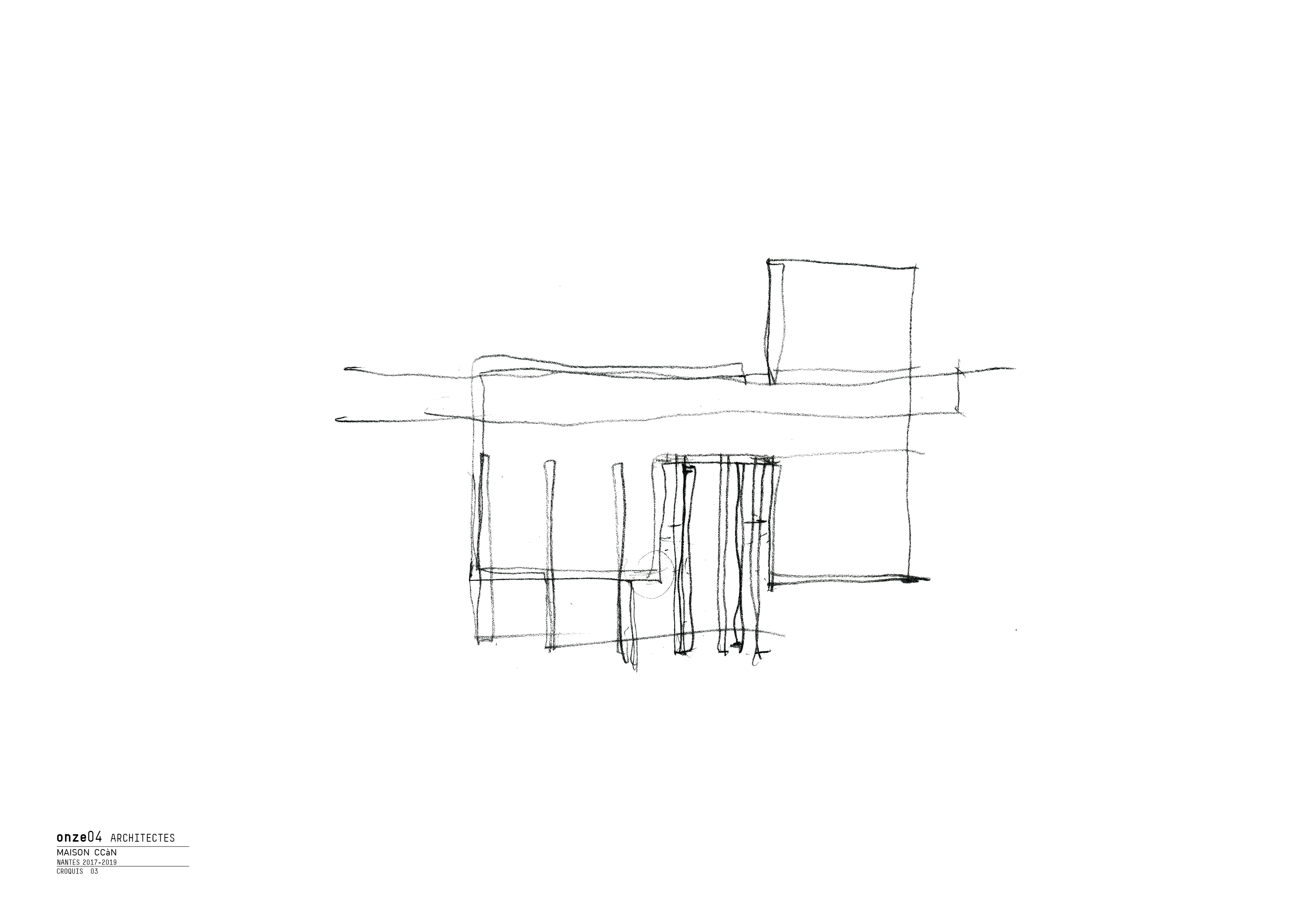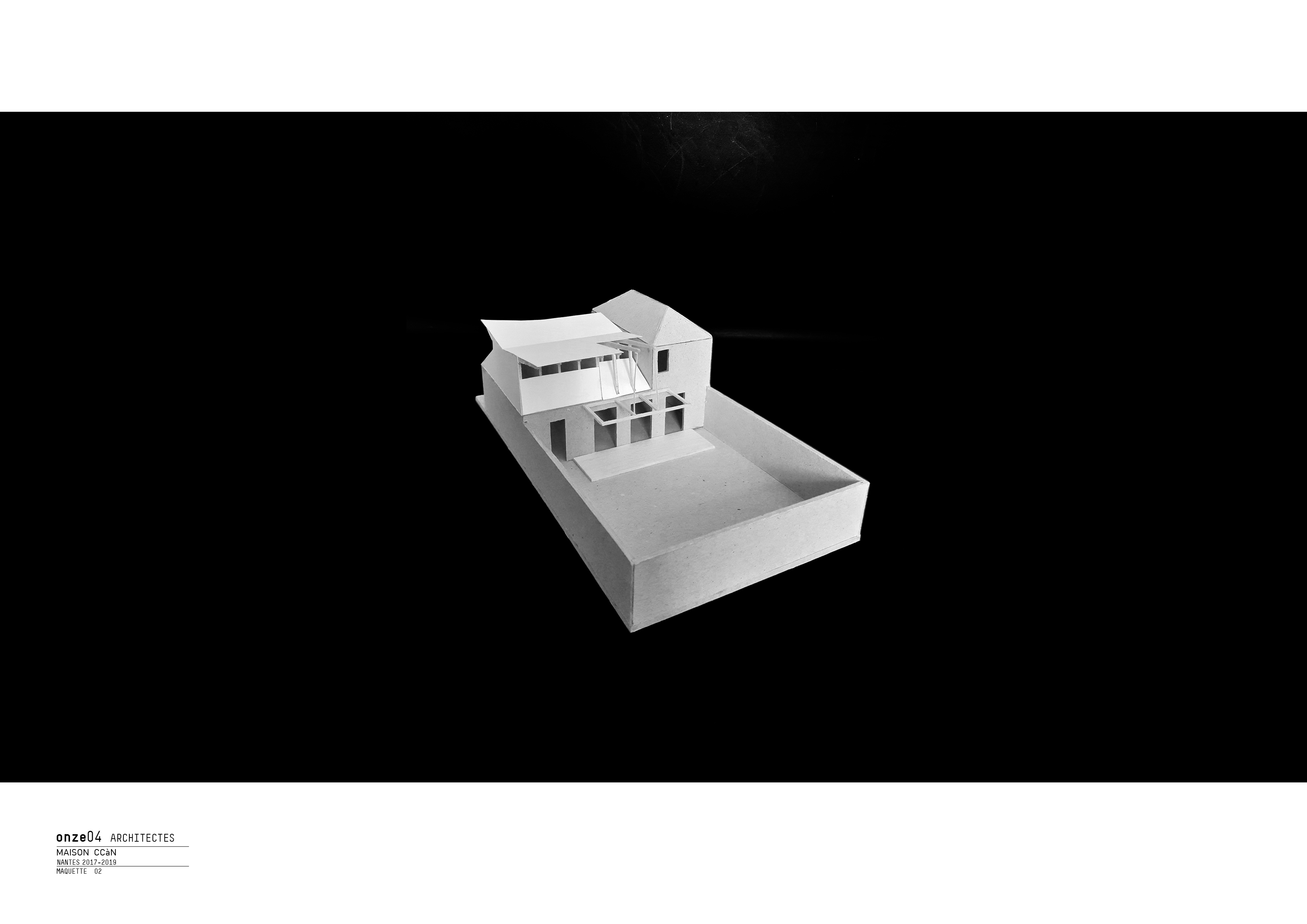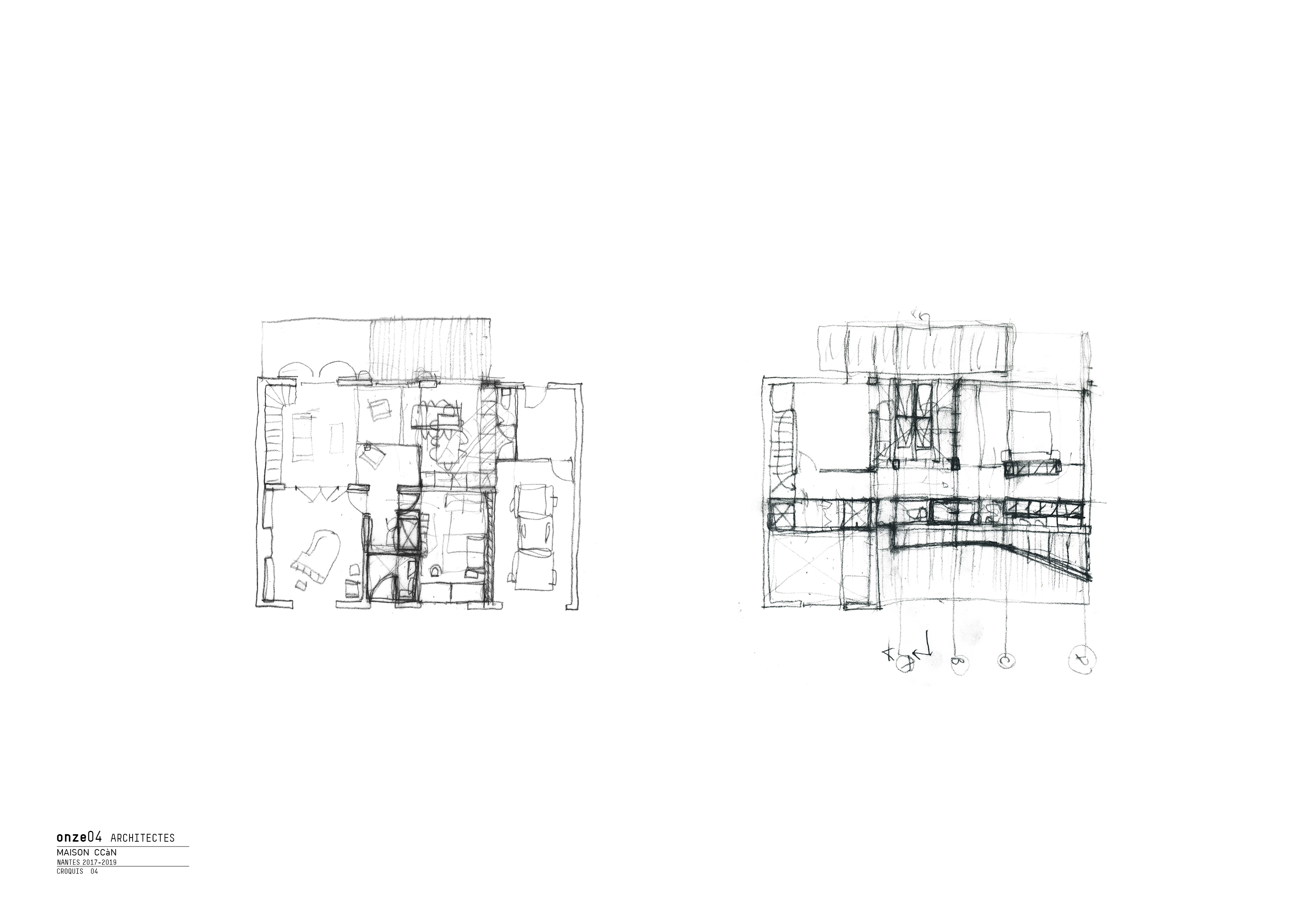 Approche environnementale : La toiture à pente inversée et la pergola ont également été conçues comme des éléments d’architecture ayant un impact climatique. Leurs débords ont été dimensionnés afin de constituer en été une bonne protection solaire, tout en laissant pénétrer le soleil lors des autres saisons. La façade jardin étant orienté au Sud, la distribution intérieure de la maison est tournée vers le jardin afin d'avoir une orientation solaire optimale. Le nouveau volume ayant un niveaux d'isolation très performant ainsi que des généreuses surfaces vitrées au sud, minimise l'usage du chauffage les jours d'hiver ensoleillés.