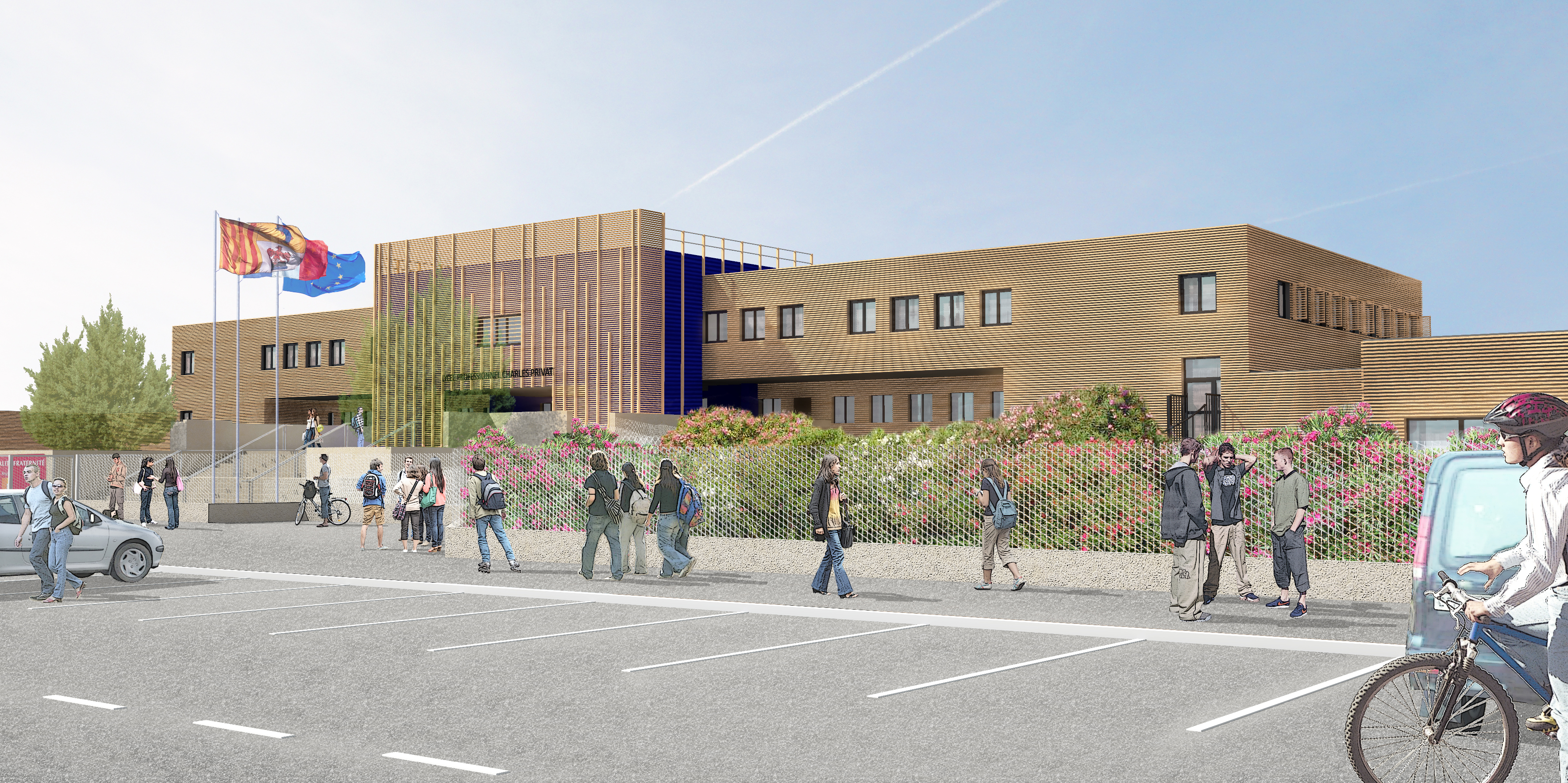 Le lycée, construit en 1985 en centre-ville, forme un ensemble compact constitué d'un externat bordé latéralement par des ateliers d'enseignement technique. Notre intervention porte notamment sur l'amélioration thermique de l'enveloppe dont nous avons tiré parti pour revaloriser l'image de l'établissement. Le bois est le vecteur principal de notre approche. Il est décliné en bardage de tasseaux posés horizontalement à claire-voie sur un pare-pluie noir. L'animation des façades repose sur un rythme d'épines verticales et sur la mise en œuvre de brise-soleil verticaux et horizontaux en douglas.
