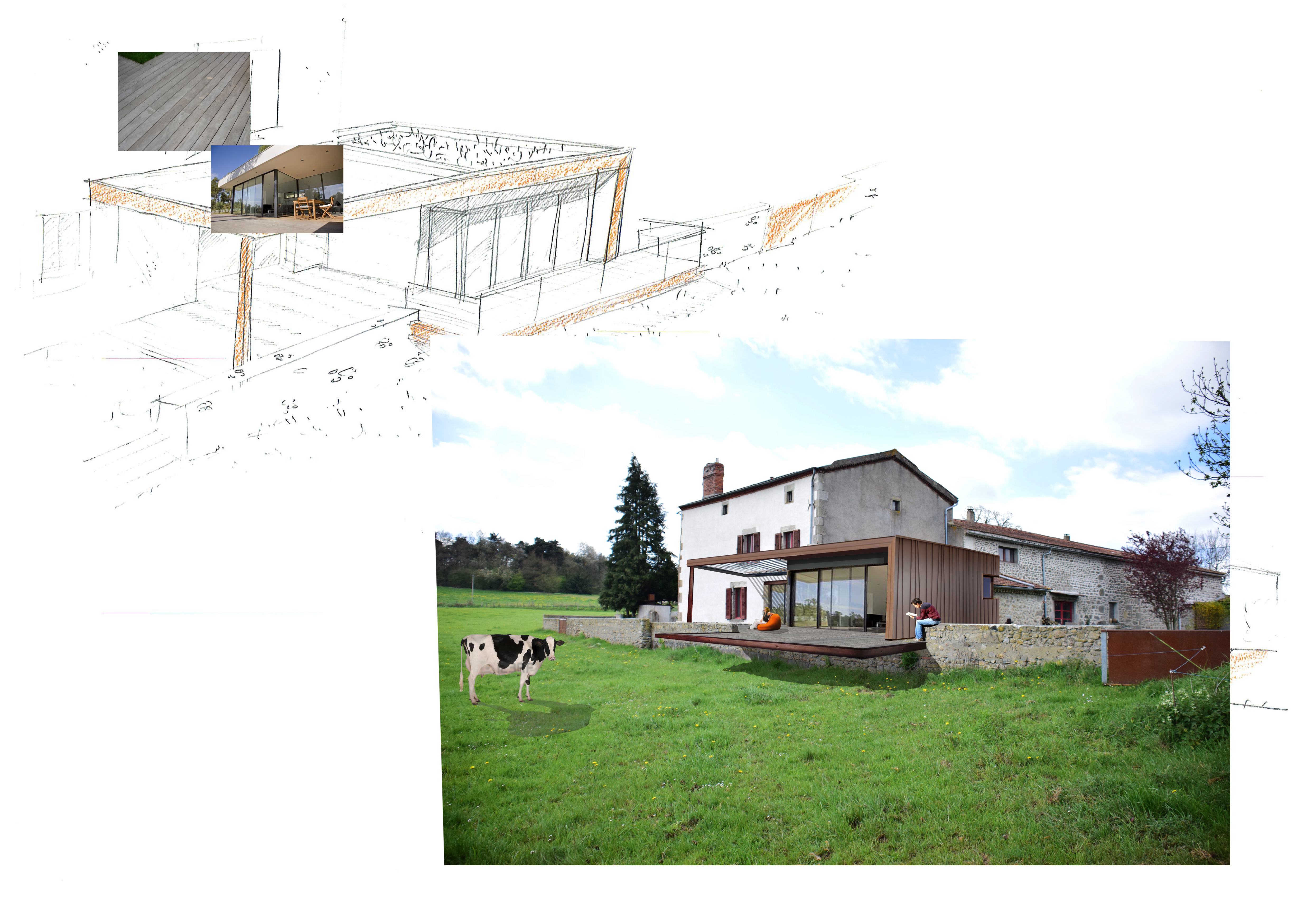 Extension d'une habitation pierre permettant une occupation de plain-pied pour un utilisateur en fauteuil roulant. les matériaux ont étés choisis pour s'harmoniser discrètement avec la pierre et l'environnement.
