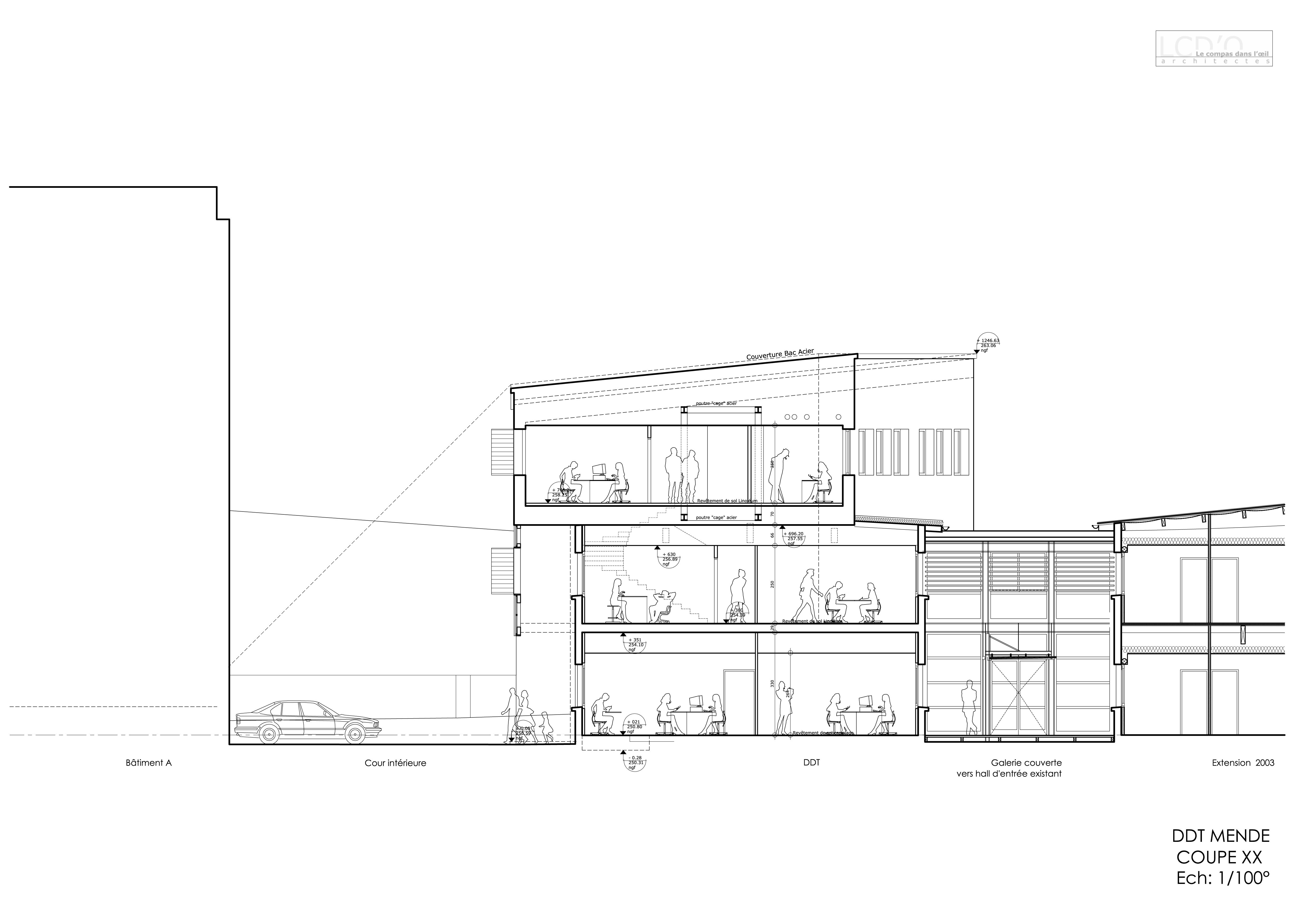 Extension des locaux administratifs de la DDE pour la DDT de la Lozère. Conçu comme un pont en bois enjambant l'ancien bâtiment du SIR, la lecture du volume ancien, permet de comprendre l'évolution du site, sans en effacer les étapes. Contrairement au bâtiment A et au bâtiment bois de 2002, tous deux fortement ancrés dans le sol, constitués de murs pleins percés de portes fenêtres ou de baies vitrées, le nouveau bâtiment sous lequel, le public et le personnel de la DDE peuvent passer, est enveloppé; d'une résille constituée de fines lames de bois suggérant la légèreté de l'édifice (lames 36*72 en douglas thermo huilé pose à plat ou sur chant). Les baies viennent se composer derrière la façade tramée (persiennes bois et cadre métal), pour protéger du soleil et de l'échauffement sans priver les occupants de la lumière nécessaire. A la tombée de la nuit, le bâtiment prend un tout autre aspect en fonction de l'éclairement artificiel des locaux, de l'ouverture ou de la fermeture des persiennes ajourées, ce qui vient renforcer son aspect léger et "volatile". Aussi important que les volumes construits et habités, les vides laissés entre les bâtiments et le relief du talus ont un sens précis, une identité claire et vivante pour ne pas finir en "délaissé". Nous définissons deux grands espaces extérieurs significatifs. Le premier vient renforcer le lien entre les bâtiments, pour donner vie à une grande cour minérale ponctuellement plantée de pieds de bambou. Celle ci se déploie depuis le bâtiment A jusqu'au bâtiment en bois, sous la galerie couverte et sous le passage couvert également, comme si les bâtiments avaient été posés dessus. La limite entre ce grand "tapis" minéral et le talus planté le long de l'avenue G. Clémenceau est conçue davantage comme un lieu où il est possible de se tenir, de se poser sur un revêtement plutôt du registre végétal (platelage bois) en référence aux espaces déjà existants dans les courettes de l'actuel SIR. Ces terrasses peuvent à l'occasion devenir l'extension extérieure de la salle de réunion pour d'éventuelles manifestations ou pour créer des terrasses extérieures aux bureaux situés au rez de chaussée. Plus que des liens urbains, ces espaces permettent d'enrichir le lien social et convivial nécessaire à la qualité du travail et du service.