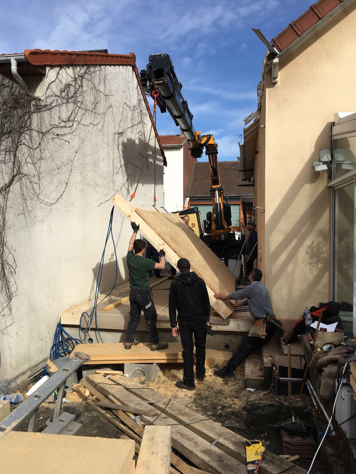 Approche environnementale : Nous avons opté pour un système de construction NOVATOP, qui est un système de construction complet comprenant des éléments de grande dimension, fabriqués en bois massif lamellé-croisé (CLT – panneau bois massif contrecollé). Les panneaux sont fabriqués à partir de lamelles d ́épicéa séchées et empilées en couches croisées à 90° Le levage de la maison a pris quatre jours. L’ensemble du clos et couvert (sauf habillage métallique) a été ni en deux semaines. L’ensemble est assemblé comme un jeu de Lego, tous les composants sont dessines préalablement en 3D et fabriqués dans leur format précis Solution économe et passive Le bois massif offre une solution éprouvée et efficace pour les maisons économes en énergie (BBC) et passives. Tous les éléments offrent une étanchéité à l’air optimale. Les panneaux réduisent ainsi efficacement la perméabilité à l ́humidité. Une partie de l ́humidité progresse dans la construction et ensuite vers l ́extérieur; une autre partie est absorbée et retenue par le bois et après réduction de l ́humidité à l ́intérieur, elle est de nouveau dirigée vers l ́extérieur. Ce dispositif participe à une meilleure gestion du réchauffement de la toiture, et permet de limiter l’oscillation thermique qui in uence la qualité de la chaleur à l’intérieur de la construction. Le bois est une matière première renouvelable. Le bois nécessaire pour construire une maison familiale pousse en 108 secondes dans nos forêts. Le bois est le seul matériau de construction qui absorbe plus de CO2 (dioxyde de carbone) qu’il n’en produit tout au long de son cycle de vie, de sa croissance à la fabrication, jusqu ́à l’installation dans les bâtiments. Chaque arbre prélève du CO2 dans l’atmosphère, il stocke du carbone par photosynthèse dans le bois et renvoie de l’oxygène dans l’atmosphère.