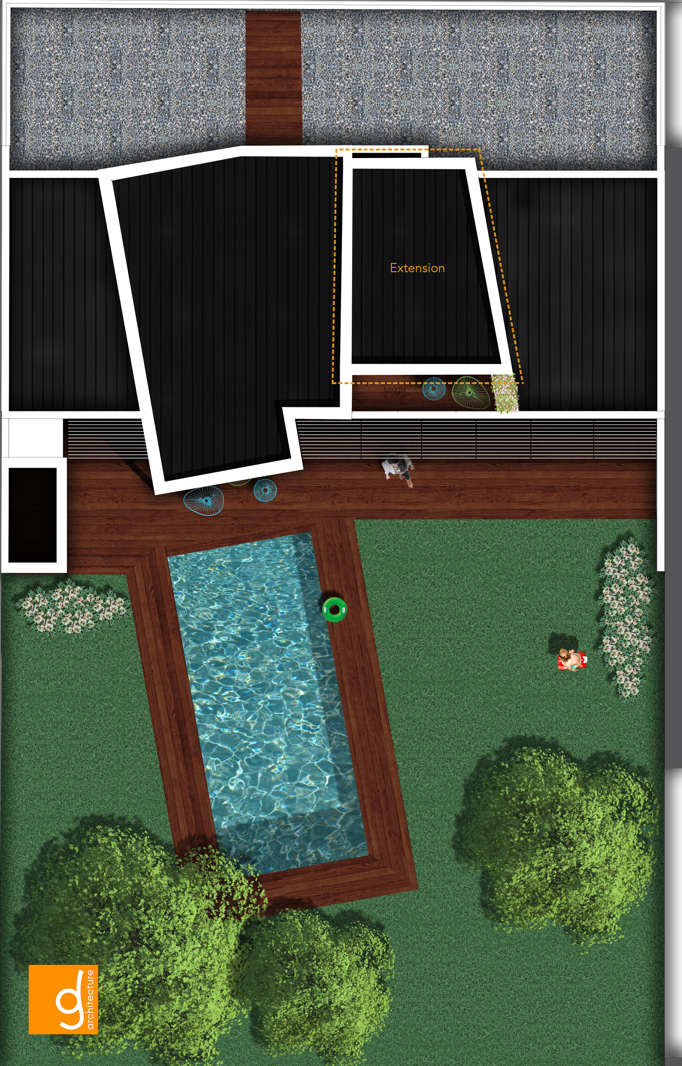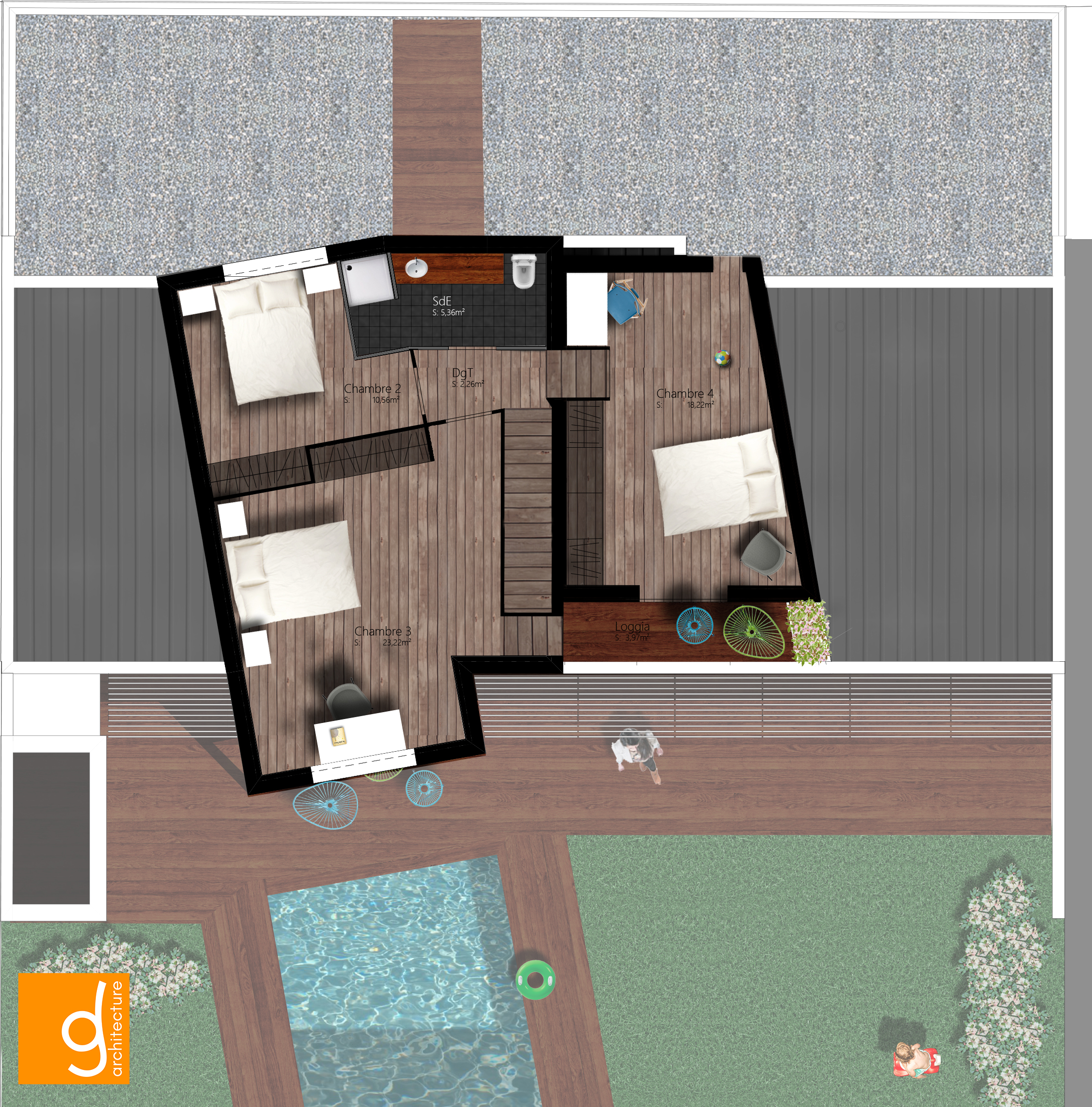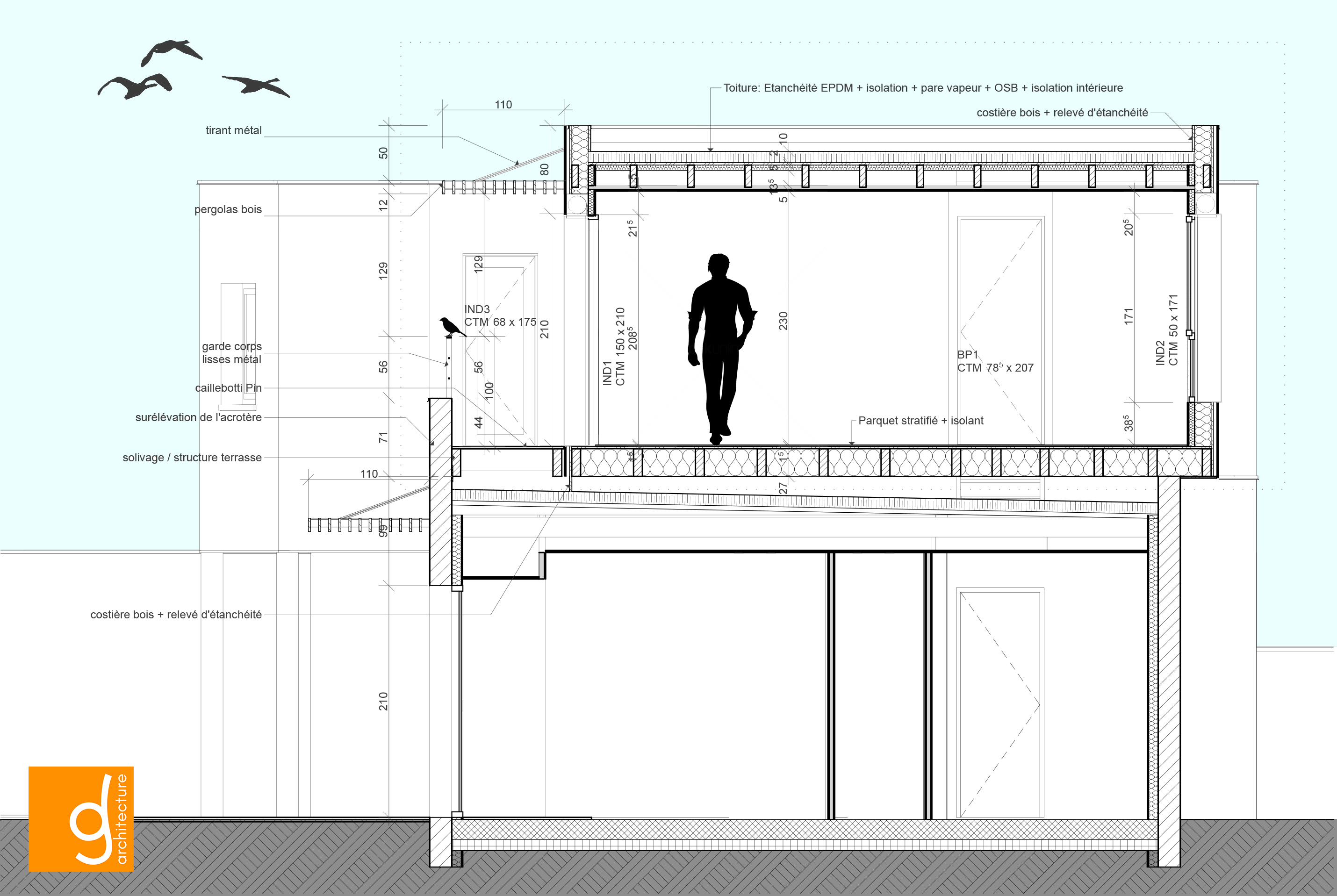 Les clients souhaitaient une chambre supplémentaire, réguler les apports thermiques solaires au rez-de-chaussée orienté au sud et créer un système de rangement dans l'entrée. Notre projet répond à leurs besoins en créant un volume contemporain en bois sur la toiture-terrasse existante abritant une chambre supplémentaire tout en aménageant une terrasse donnant sur le jardin. Une pergola suspendue vient s'installer sur la façade existante sur jardin pour limiter les apports solaires dans les pièces du rez-de-chaussée. Un meuble comptoir et un meuble sous escalier sont créés au rez-de-chaussée.