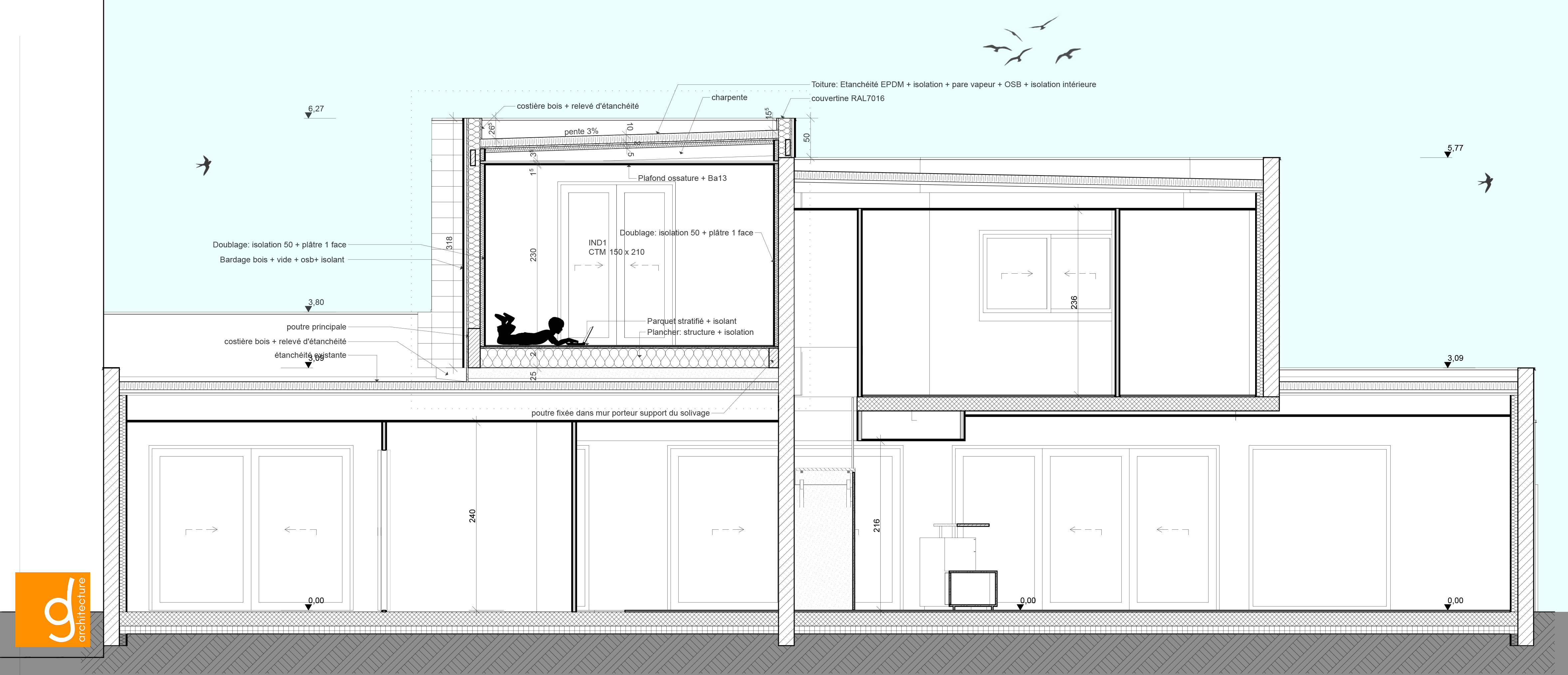 Descriptif technique : La surélévation est réalisée en ossature bois supportée par une poutre maîtresse en appui sur les deux façades. La technique constructive a été imaginée pour limiter au maximum les charges ajoutées au bâtiment existant tout en réduisant la durée du chantier. La maison restant occupée pendant la durée des travaux, la surélévation est prévue pour être entièrement réalisée depuis l'extérieur. Les accès à la surélévation ont été percés à la fin de la réalisation pour permettre de réduire les nuisances envers les occupants. PEFC (Gestion forestière durable)