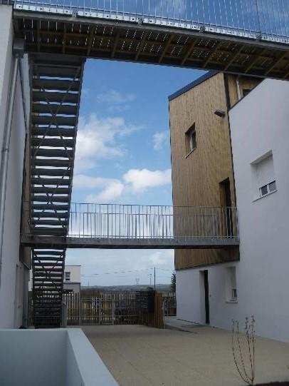 Descriptif technique : Isolation de l'enveloppe : -Laine minérale haute performance entre ossature 14,5 cm + 5 cm en intérieur : R = 6,2 m².K/W -40 cm de ouate de cellulose en toiture, R = 10 m².K/W -10 cm de polyuréthane en plancher bas sur parking, R = 4,5 m².K/W Équipements : Minimiser les besoins réels pour investir le moins possible dans des équipements techniques ou technologiques (réduction du coût lié à l'achat et à la maintenance). -Ventilation hygroréglable, basse consommation,réduction des fuites des réseaux et test d'étanchéité à l'air : Classe A. -Chaudière collective granulés de bois pour le chauffage et l'ECS des 23 logements et prise en compte de 12 logements supplémentaires programmés en mitoyenneté en juin2014. -Sur-isolation des distributions de chauffage et d'ECS (40% de réduction de pertes) Panneaux photovoltaïques pour production et compensation des consommations communes et domestiques PEFC (Gestion forestière durable)
