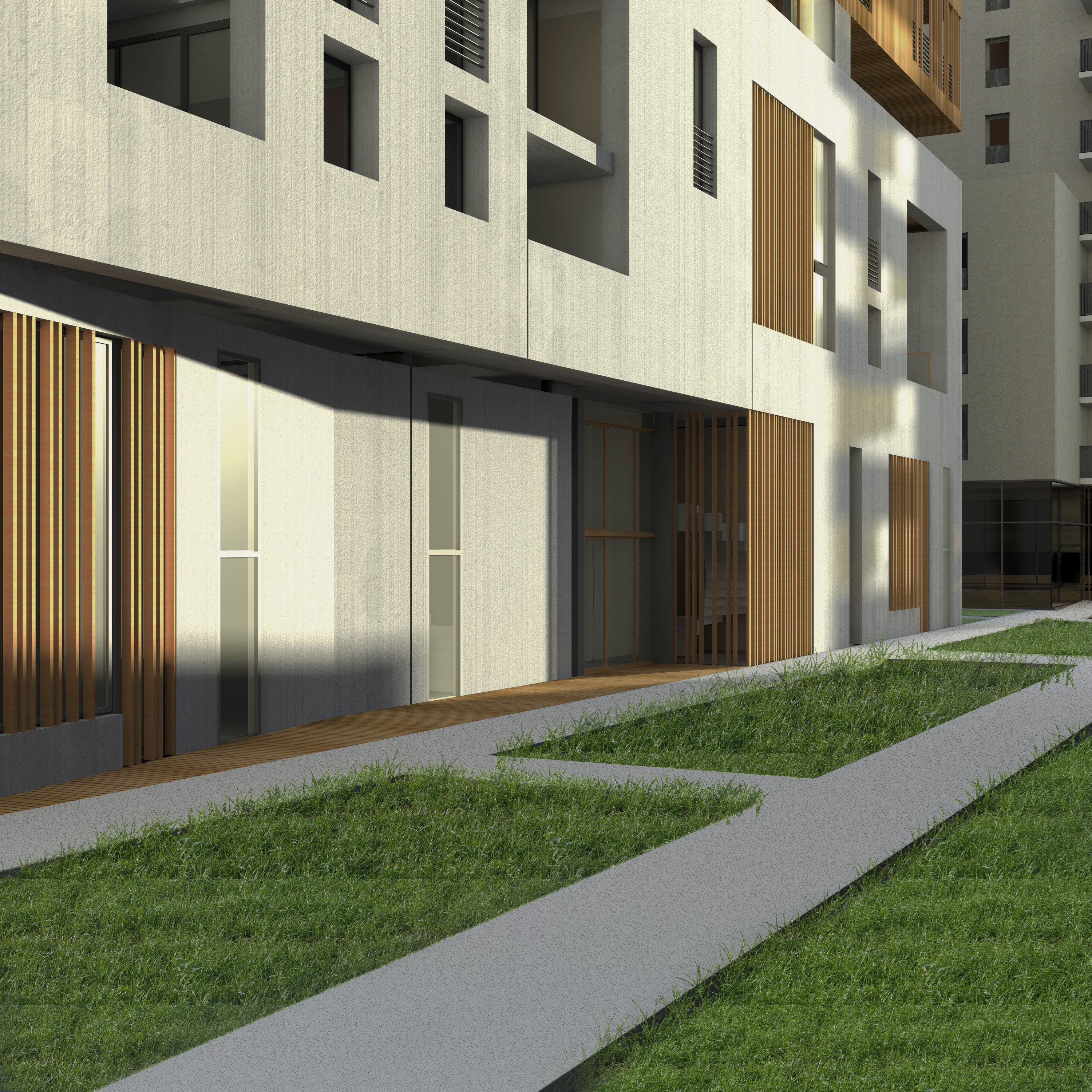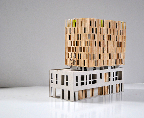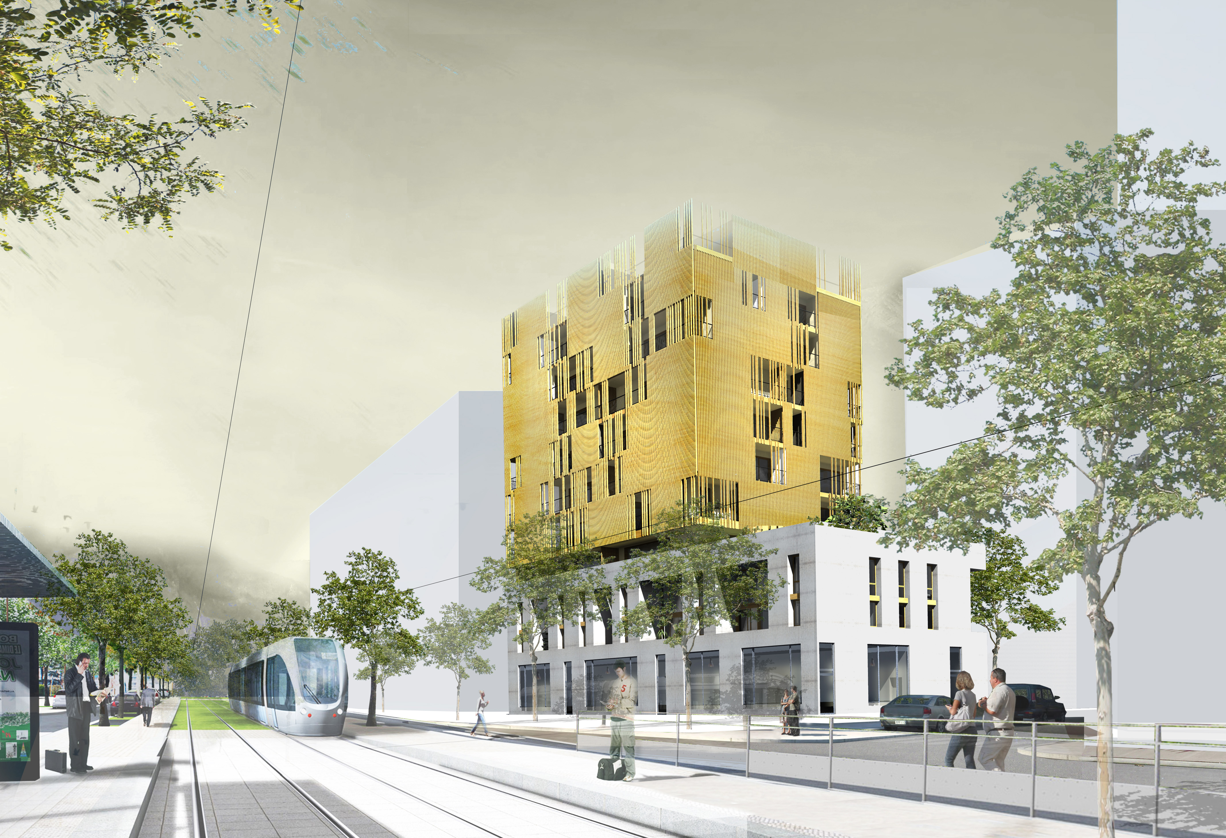 Le bâtiment CJ4 est un immeuble collectif en R+10+attique comprenant 38 logements locatifs sociaux. Le site alloué à la construction du projet se situe au cœur d’une ZAC en construction. La composition du bâtiment s’appuie sur deux principes forts : - Un socle minéral en béton ancré au sol qui contient des commerces en RDC et des logements duplex en R+1/R+2 - Un corps principal léger et émergeant du socle avec une enveloppe filtrante en bois. Entre les deux entités le niveau R+ 3 constitue un joint creux et accueille dans sa partie Est un jardin collectif pour les habitants de l’immeuble.