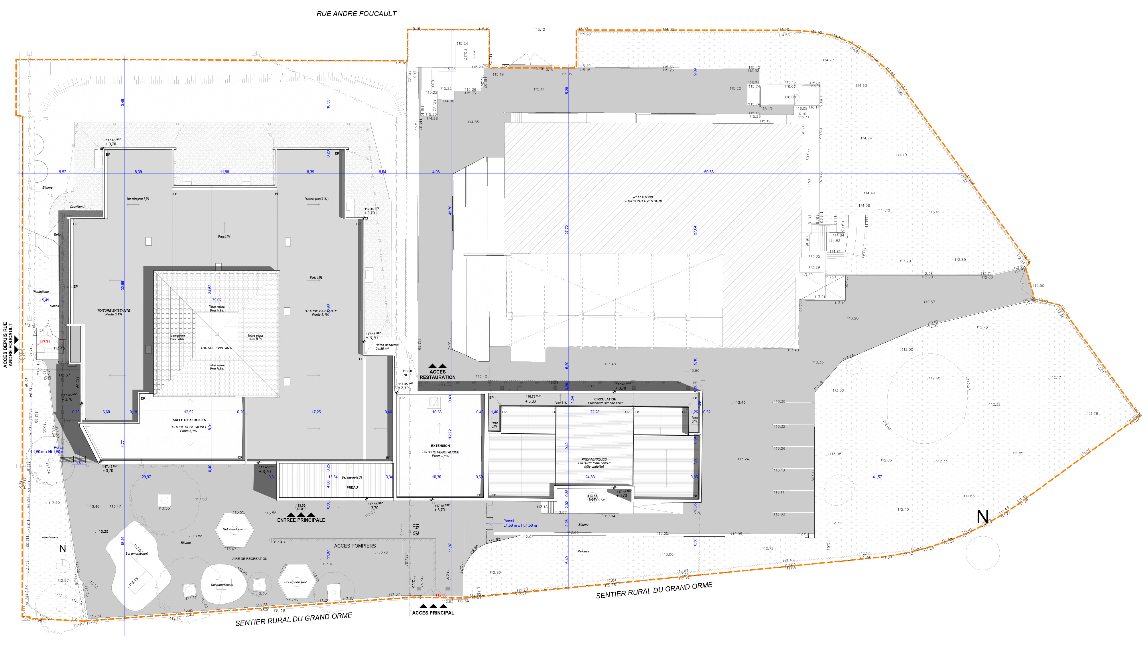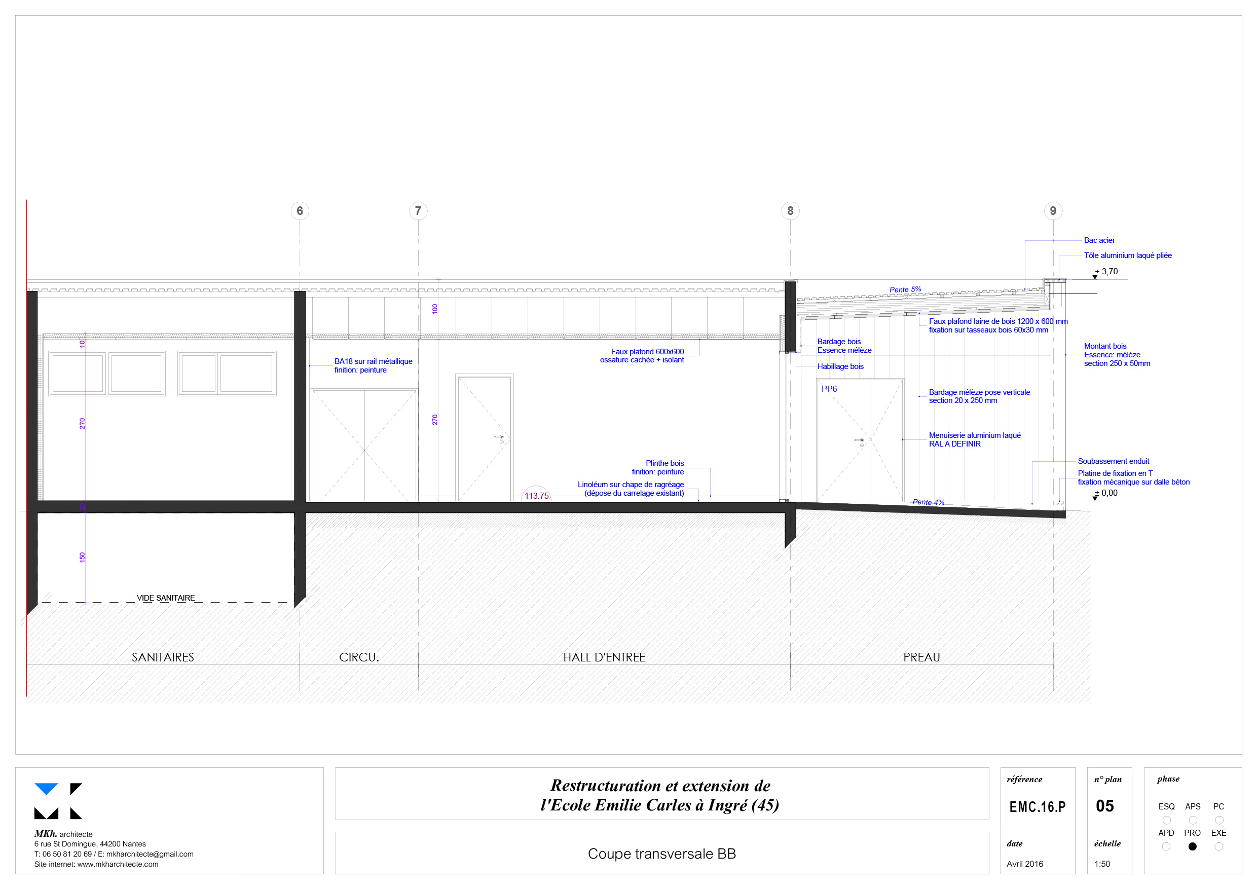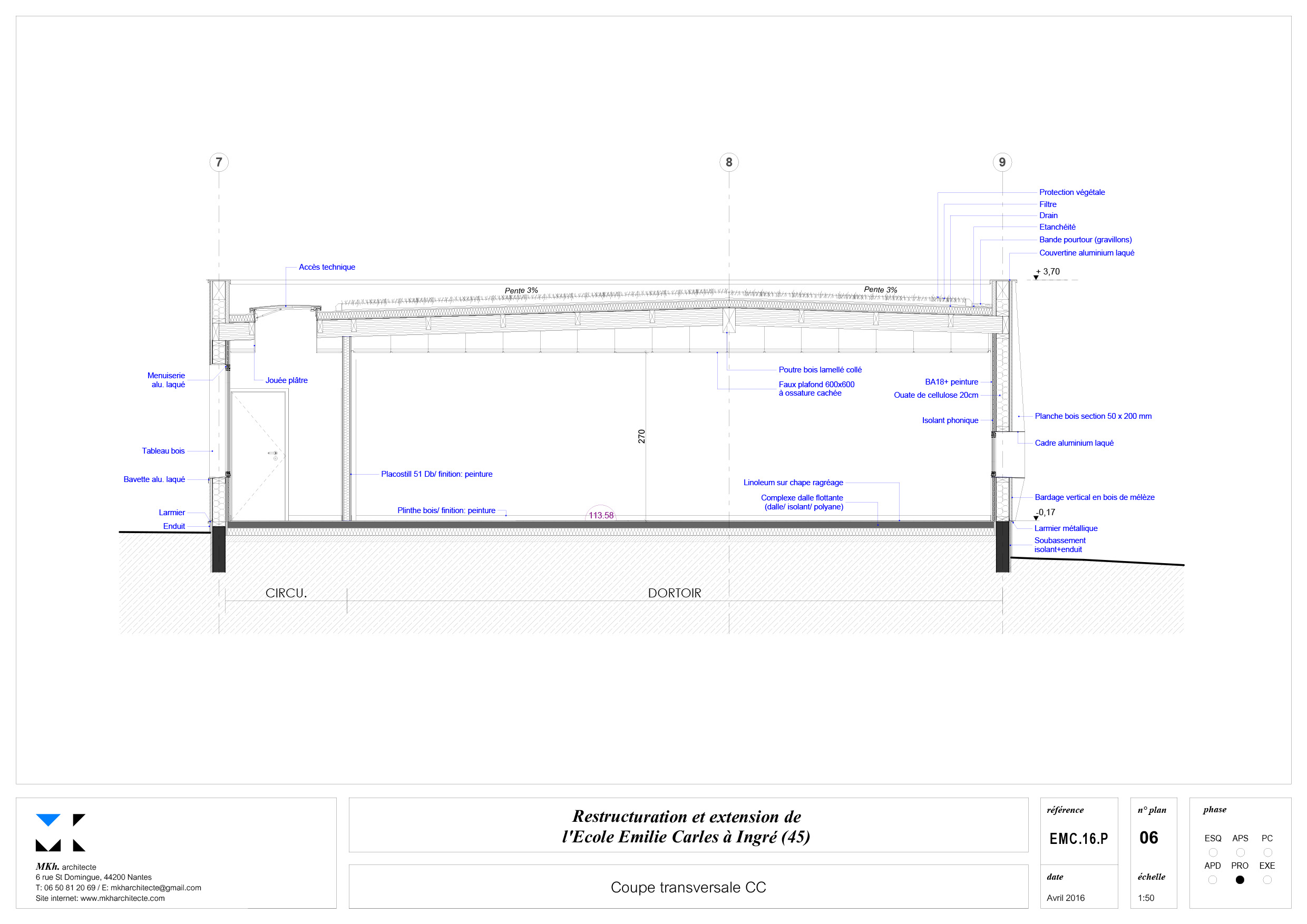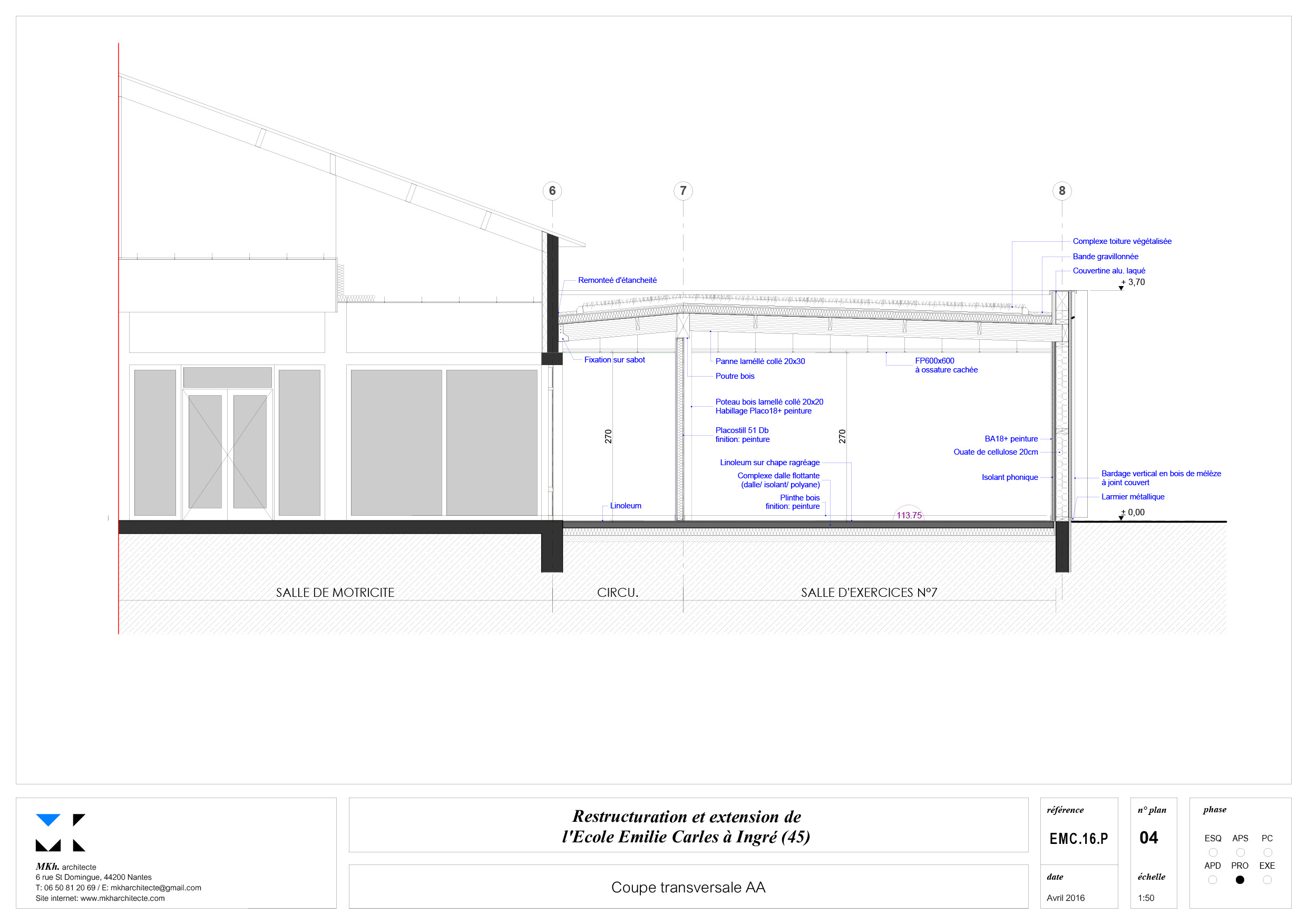 Descriptif technique : L’extension est réalisée sur un système constructif préfabriqué en bois (ossature et bardage bois). Le choix de ce système a été retenu par la particularité de ce chantier. Ce dernier a été entièrement planifié durant les vacances scolaires, ce qui a demandé à l'équipe de travailler sur des solutions rapportées. Le choix du bois paraissait dès lors pertinent.