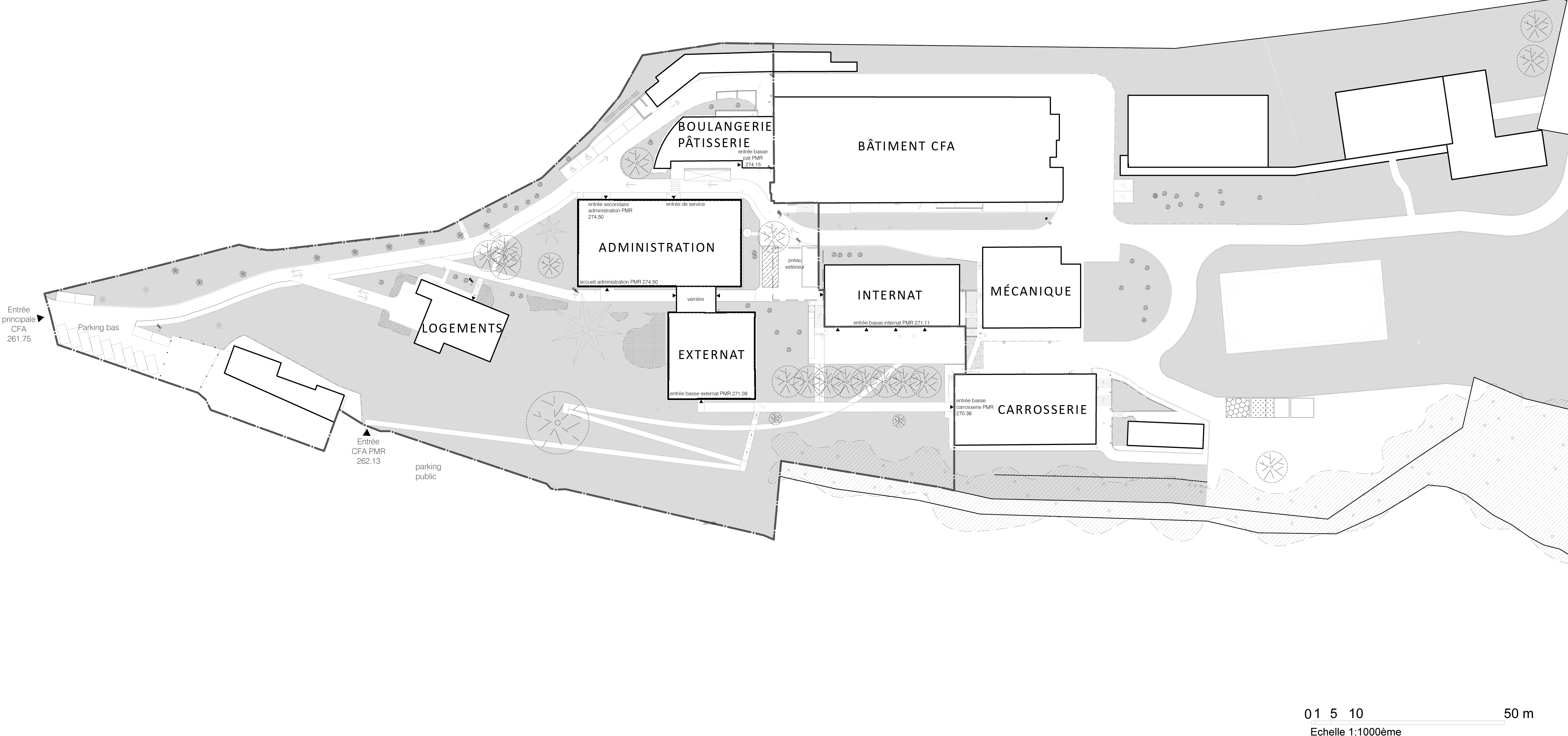 Isolation thermique extérieure et mise aux normes Accessibilité d’un ensemble de bâtiments du Centre de Formation des Apprentis de Limoges. Construits en 1974, les trois bâtiments présentent la même typologie: structure poteau-poutres et façades préfabriquées en béton, toits-terrasse non accessibles.Les bâtiments sont compacts et présentent des façades répétitives qui permettent des solutions économiques et efficaces: isolation par l’extérieur en panneaux préfabriqués en ossature bois. Cela permet de bien traiter les ponts thermiques et a peu d’incidences sur les espaces intérieurs.