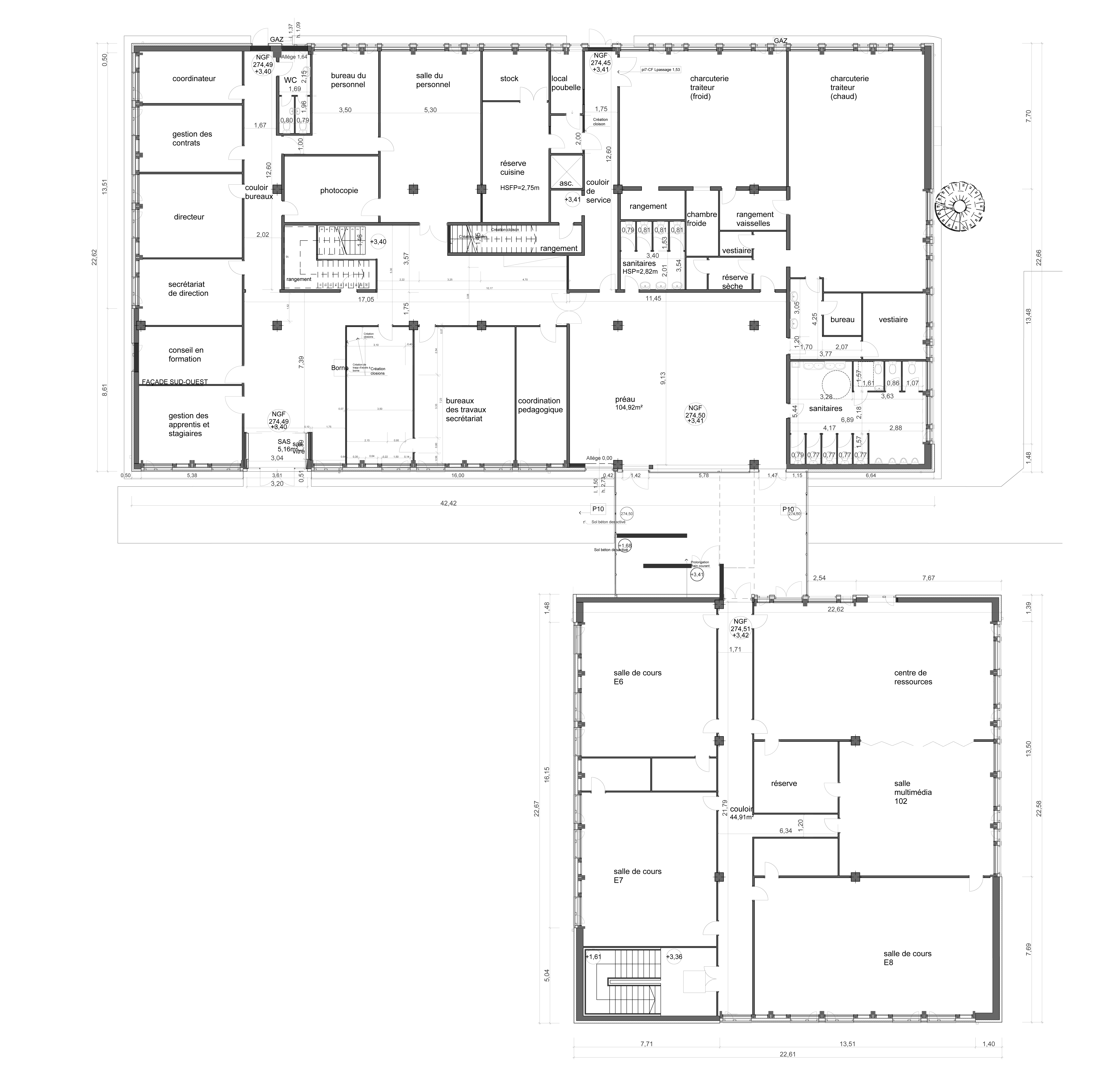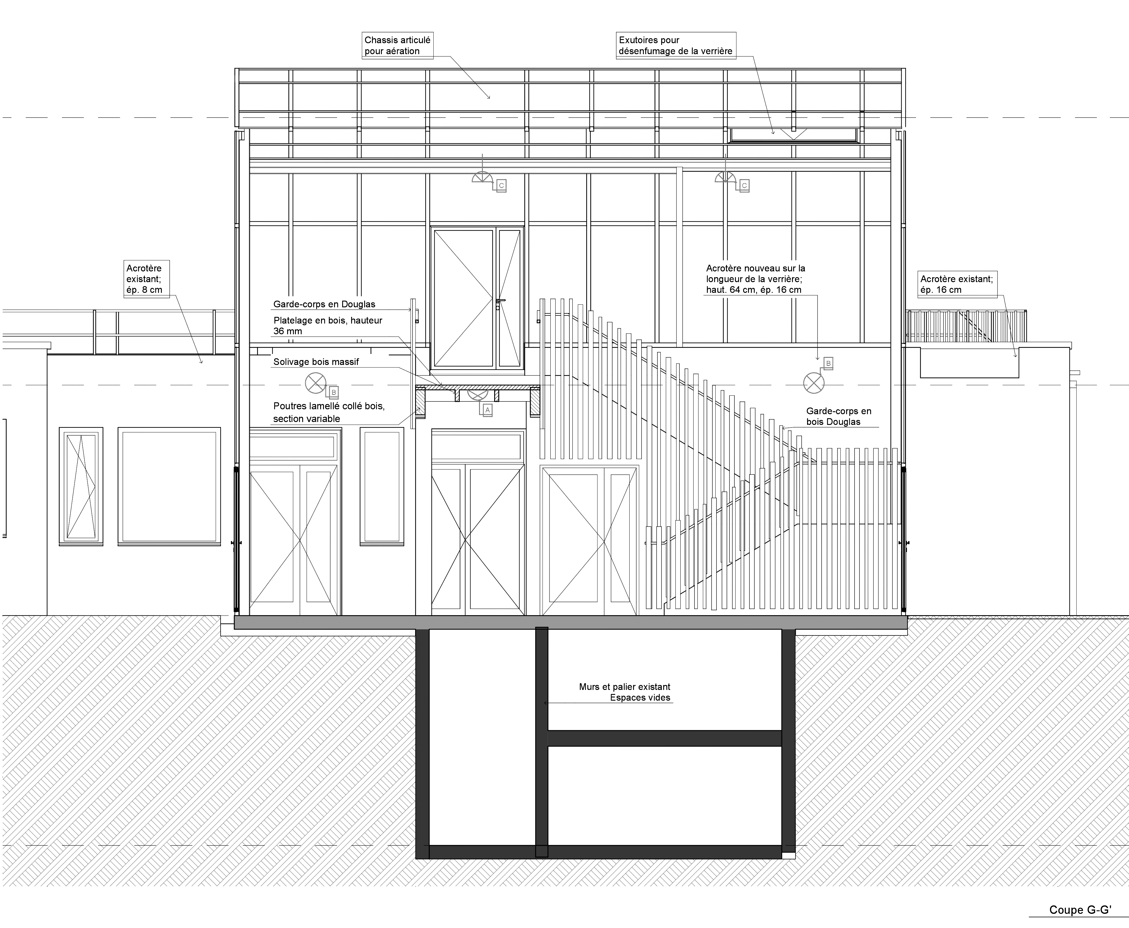 Descriptif technique : - ITE sur béton préfabriqué en panneaux ossature bois préfabriqués, isolation laine de roche. Parement : bardage en douglas du Limousin (traitement saturateur gris) / béton fibré - ITE des pignons en laine de roche, enduit chaux - Menuiseries bois-aluminium et stores - Renforcement de l'isolation des toitures terrasses, nouvelle membrane EPDM et gravier de réemploi - Création d'une verrière avec ouvrants automatisés selon la température - Réaménagement des circulations et adaptations pour l'accessibilité des espaces extérieurs - Nouveaux circuits de ventilation et de chauffage PEFC (Gestion forestière durable)