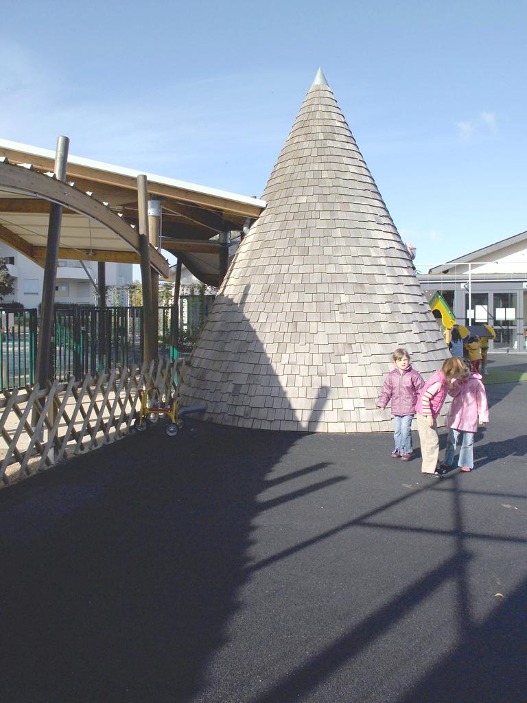 Projet de restructuration et d'extension du groupe scolaire. Les locaux de la maternelle et le restaurant sont en structure mixte thermopressé bois (panneaux in situ) Les isolants sont en fibre de bois sur panneau bois OSB priroply. Les bardages sont en peuplier rétifié. Les bardeaux du tipi sont en mélèze. les sructures des préaux sont en lamellé collé. Les structures des toitures sont en chevrons porteurs sapin du Jura.