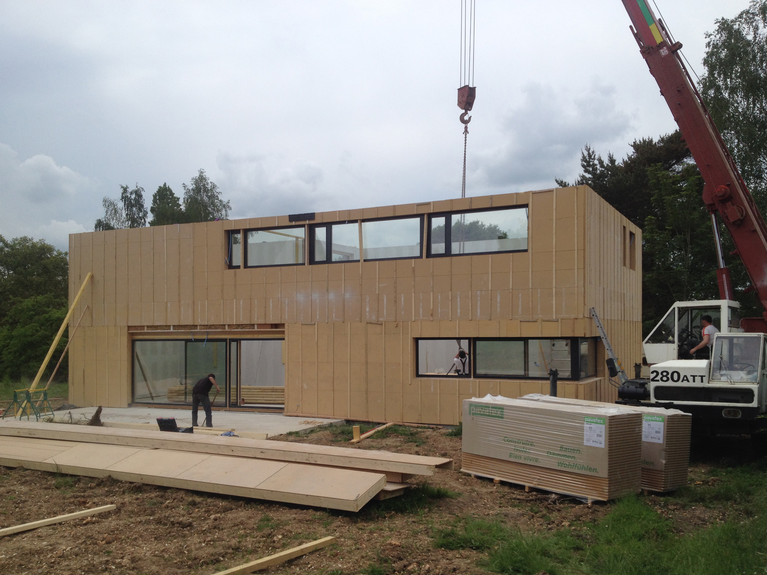 Descriptif technique : Menuiseries triple vitrage. Les fluides sont simplement une VMC double flux à haut rendement et un poêle à bois. La structure des murs est en ossature bois contreventé à l'intérieur, isolée en botte de paille. De l'intérieur vers l'extérieur : Panneau de Gypse et cellulose, panneau bois contreventant, ossature bois et botte de paille, pare-pluie en fibre de bois de 35 mm, vide ventilé, panneau support. Le plancher intermédiaire est en poutres en I, laine de bois et chape sèche type Fermacell. La toiture est construite en ossature bois avec une toiture végétalisée sur un EPDM.