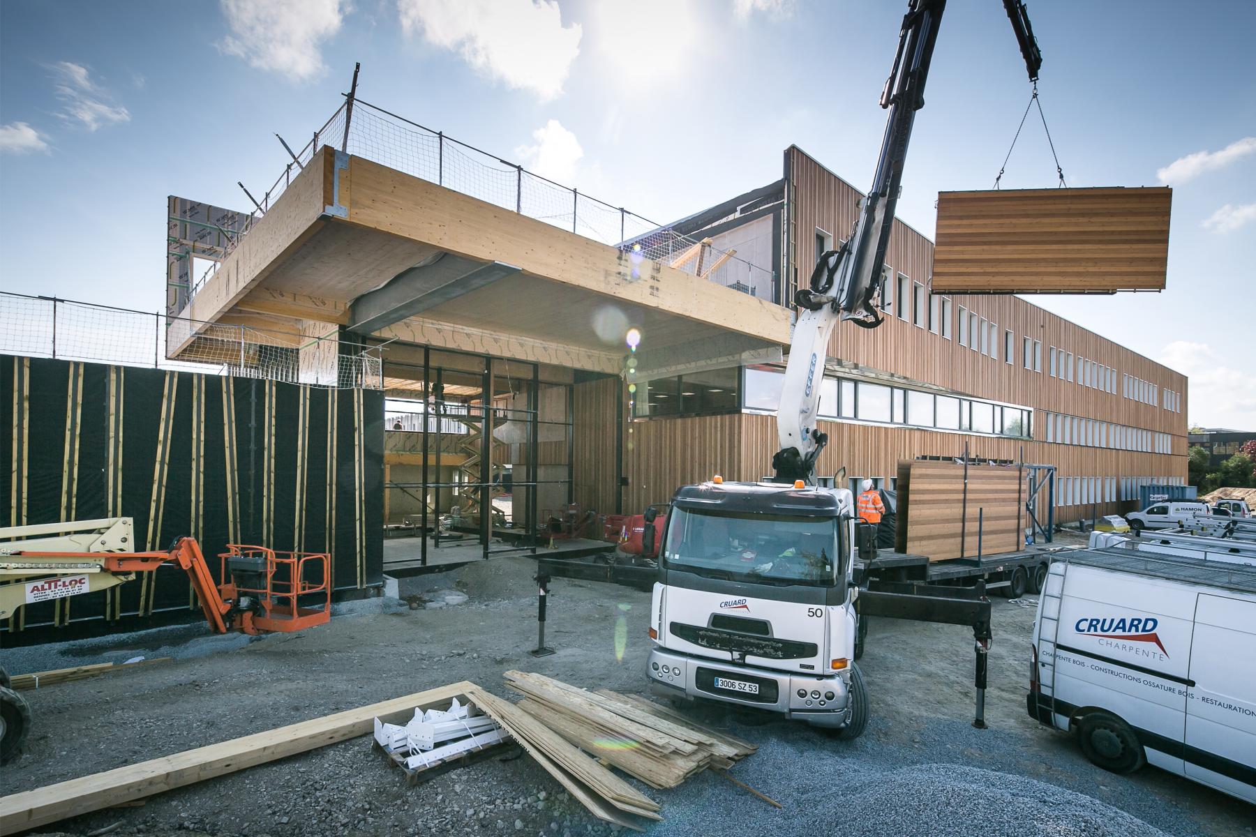 Descriptif technique : Réalisé en site occupé, le choix du mode constructif a été déterminant pour le bon déroulement du chantier. La préfabrication a été optimisée afin de minimiser les nuisances. Les parois préfabriquées (avec l'ensemble du complexe compris les menuiseries extérieures) intègrent 200mm d’isolant. Les caissons de toiture ont été montés par modules de 17x3m (isolés en atelier par 400 mm de laine de bois). L'ensemble de la structure secondaire a été montée en modules (murs, plancher CLT, cage d'ascenseur). Seule la dalle du RDC est réalisée en Béton. Le volume d'EPICEA de SITKA utilisé est de 100 m3.