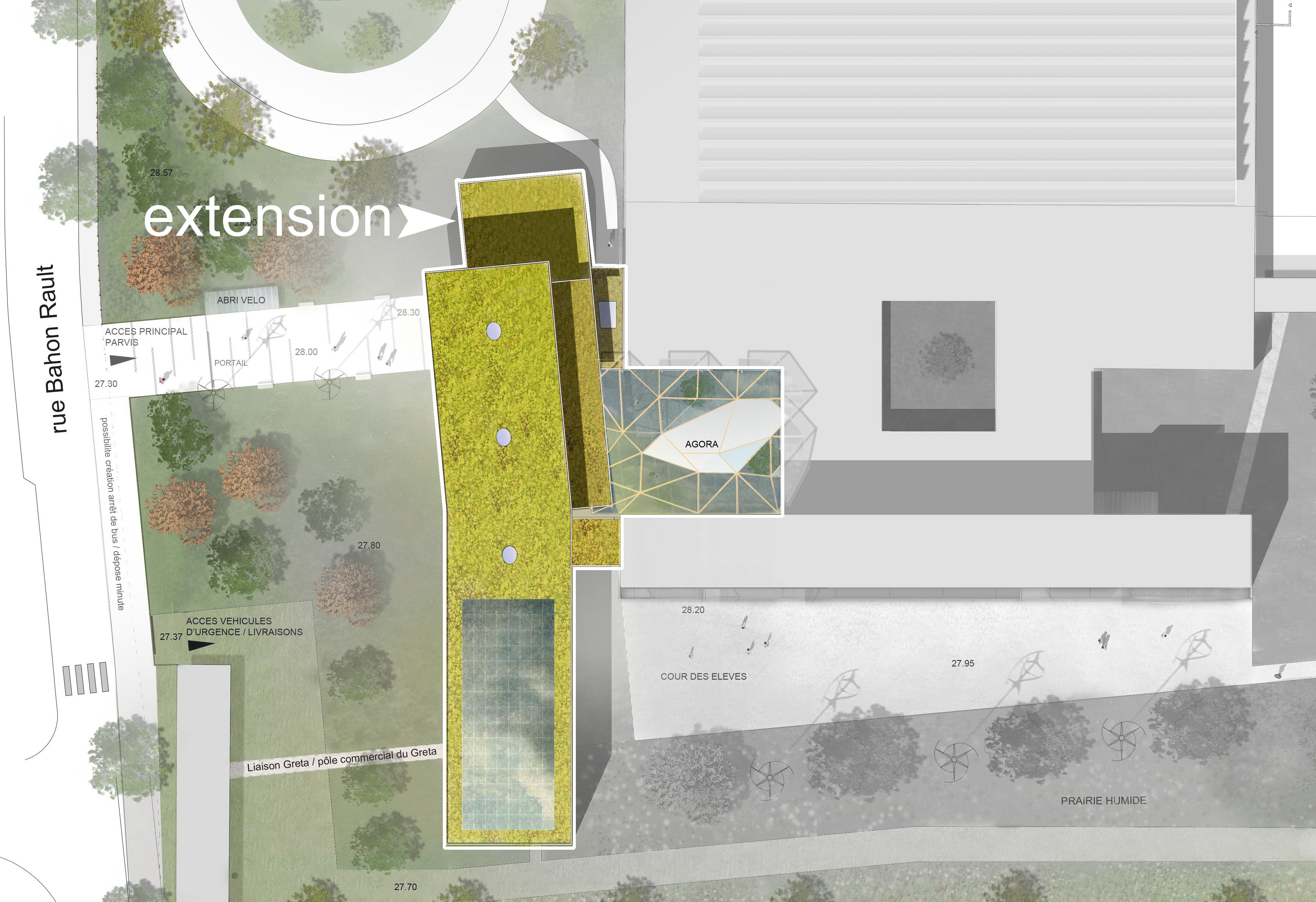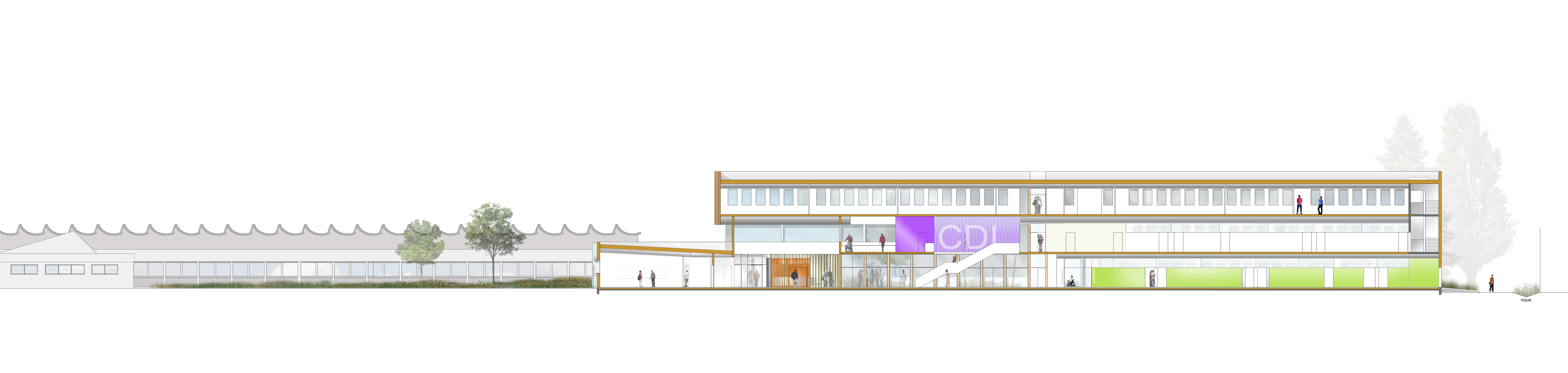 Véritable vitrine pour l'établissement, le projet permet de créer une frontalité valorisante sur l'espace public, d’ouvrir le lycée sur son environnement. En façade, les différentes nuances de bois rythmées verticalement créent un effet cinétique, un écho urbain pour un bâtiment en mouvement.Le hall en double hauteur est marqué par un porte à faux monumental laissant transparaître les activités au cœur du lycée. Ce bâtiment est pensé comme un outil pédagogique manifeste, support de formation, à la fois à la destination des étudiants mais aussi du public. Un bâtiment vertueux, passif et BEPOS.