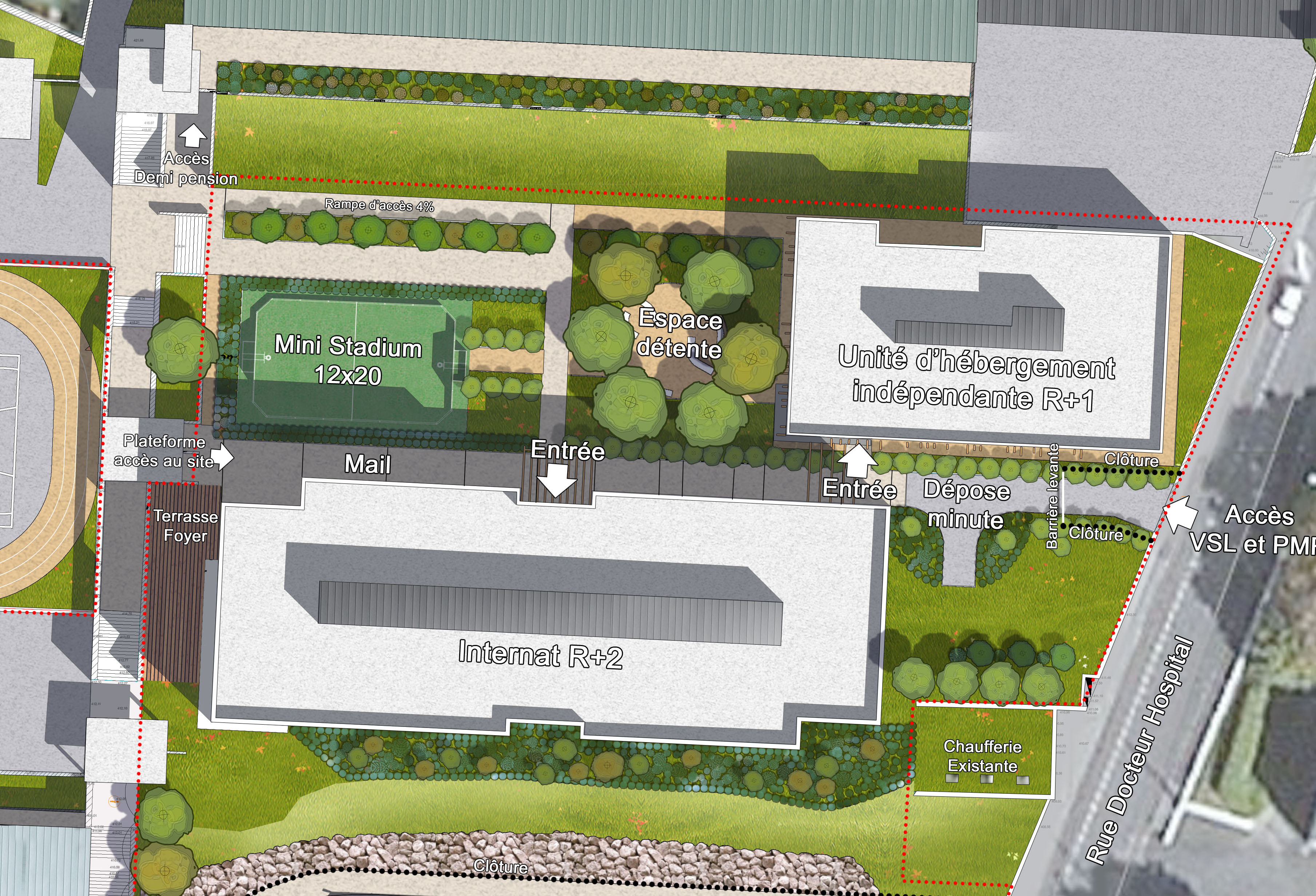Le site comportant une topographie très marquée, est composé de bâtiments implantés selon des épannelages variés sans toutefois dépasser le R+3, dans un environnement principalement résidentiel. Cette assiette en surplomb bénéficie d’une exposition favorable Nord/Sud ainsi que de vues dégagées à l’Ouest et au Sud sur les côtes de Clermont-Fd, le Puy de Dôme et le centre ville. Cette configuration a influencé directement la réflexion architecturale, fonctionnelle et paysagère. La création d’un mail reliant la rue Dr Hospital à l’axe piéton principal du site sur lequel se raccrochent tous les bâtiments nous a paru la solution architecturale et fonctionnelle la plus cohérente en adéquation avec le site existant.