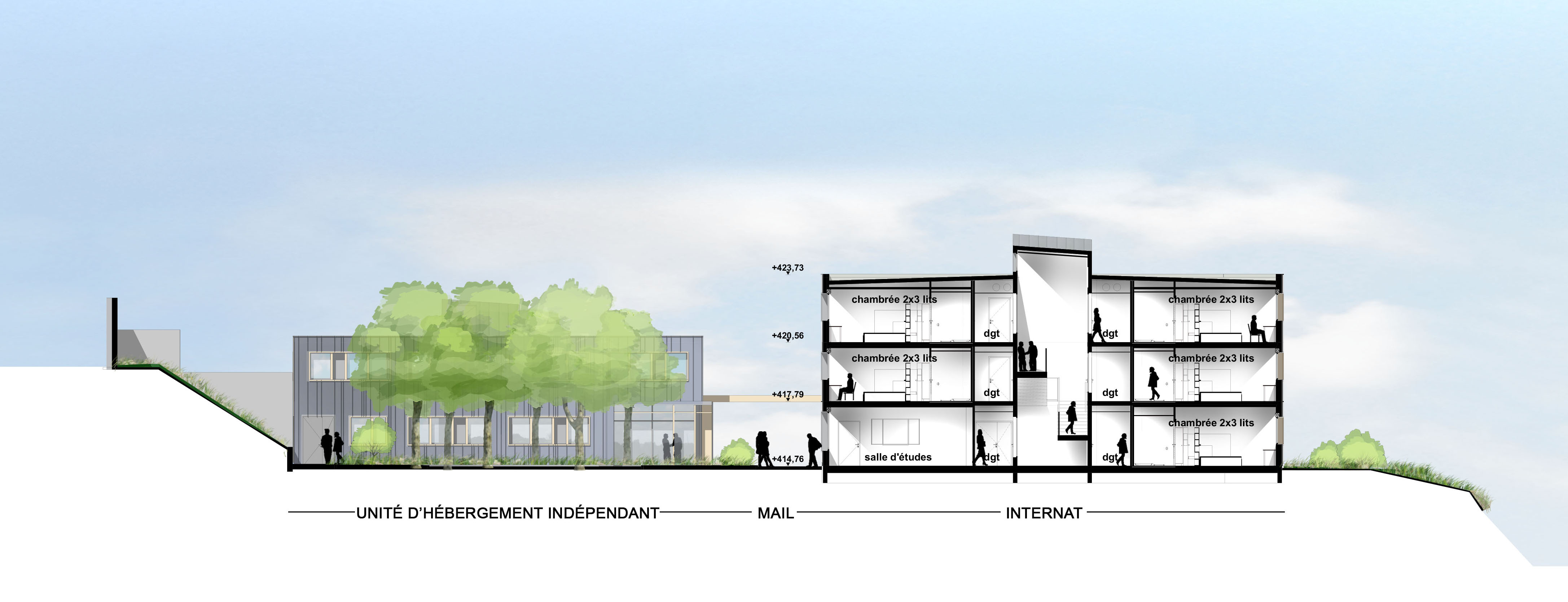 Approche environnementale : Le projet intègre différentes préoccupations environnementales avec notamment le choix de l’orientation Nord/Sud des bâtiments. Le traitement des escaliers encloisonnés apporte un comportement bioclimatique performant au sein d’un bâtiment à forte compacité, avec un éclairement naturel valorisant. Le confort des utilisateurs est assuré par des ambiances de qualité maitrisées, le contrôle de l’ensoleillement, le confort visuel, l’ergonomie des espaces. Le recours à la filière sèche locale présente bon nombre d’avantages, tels qu’un bilan carbone favorable.