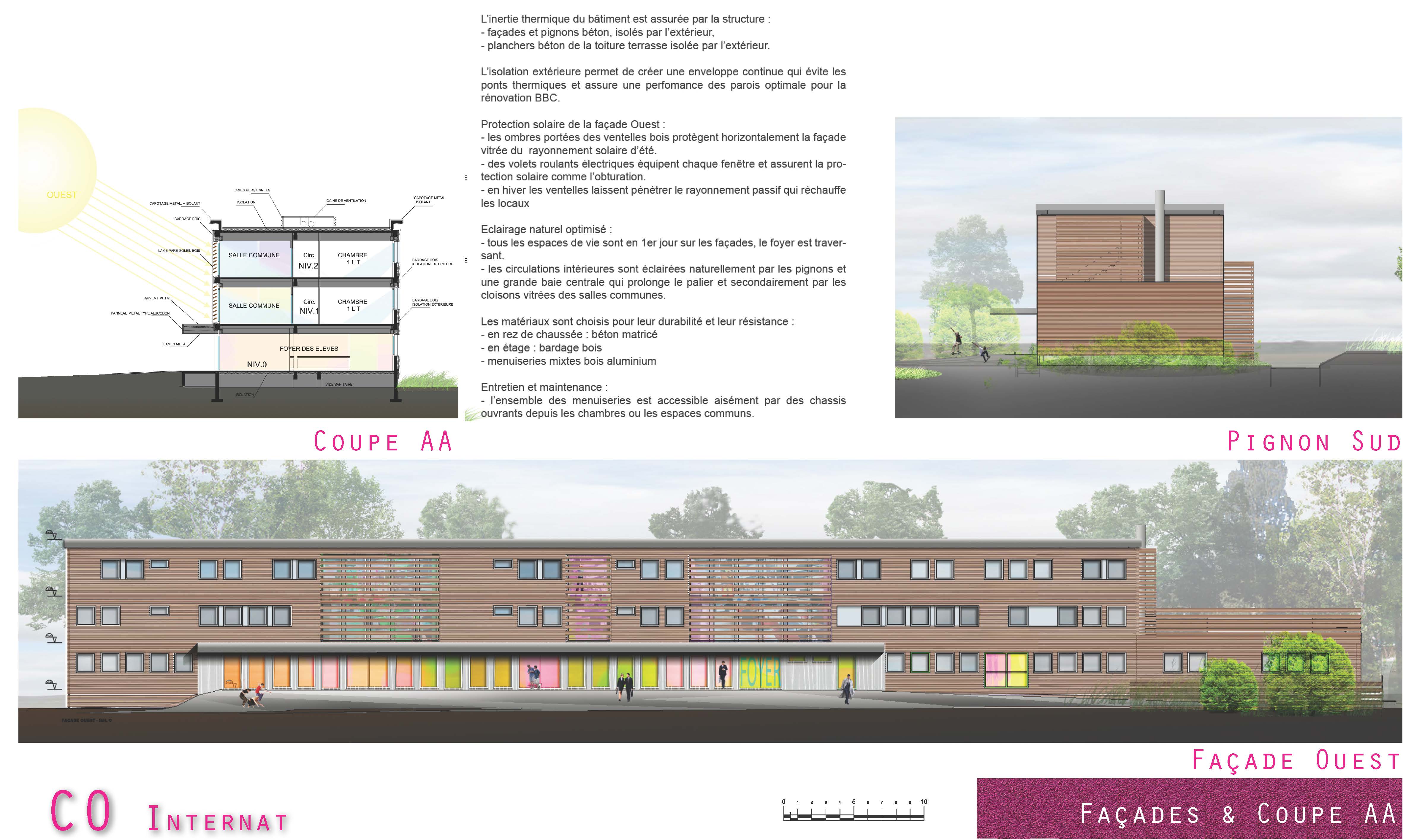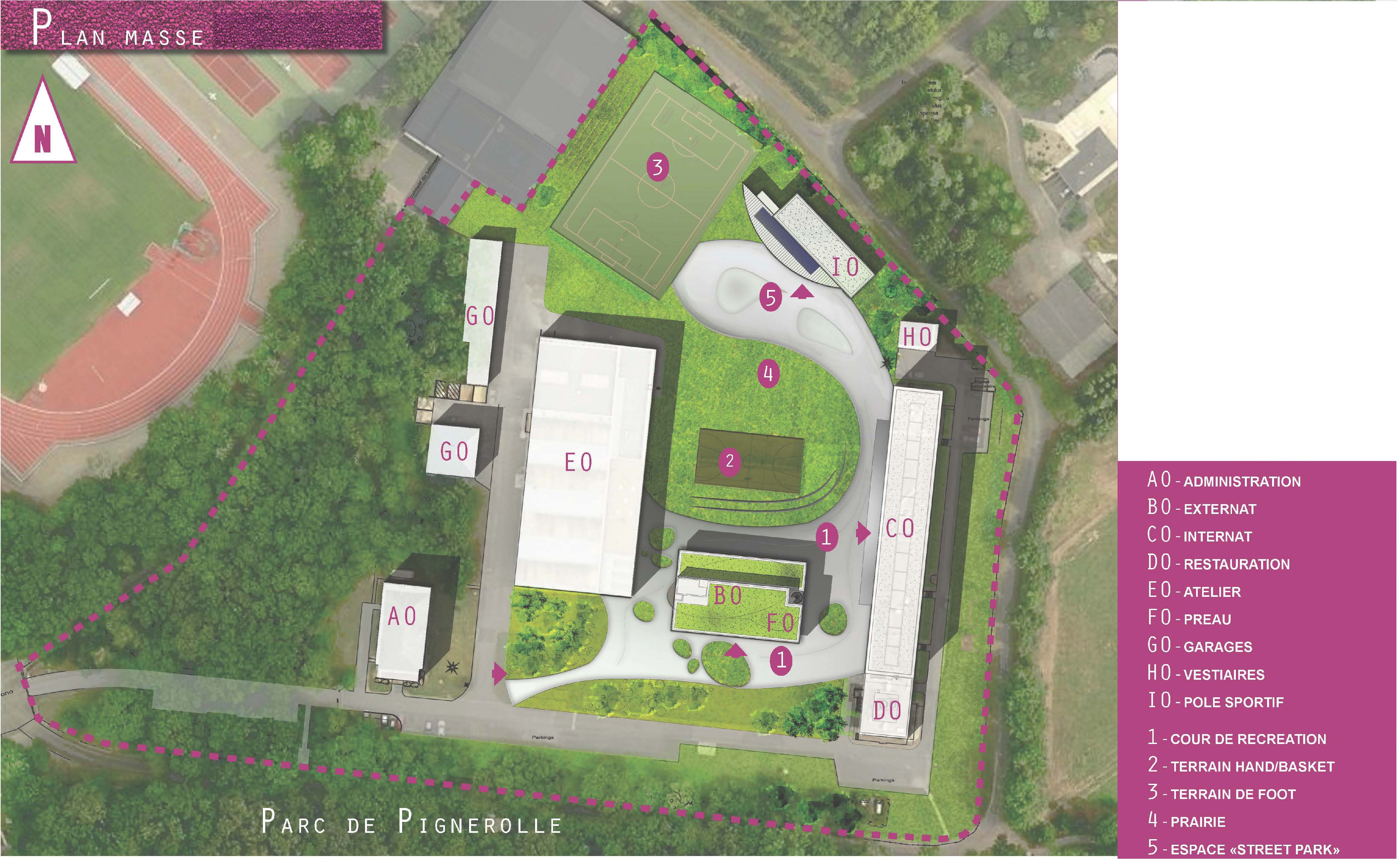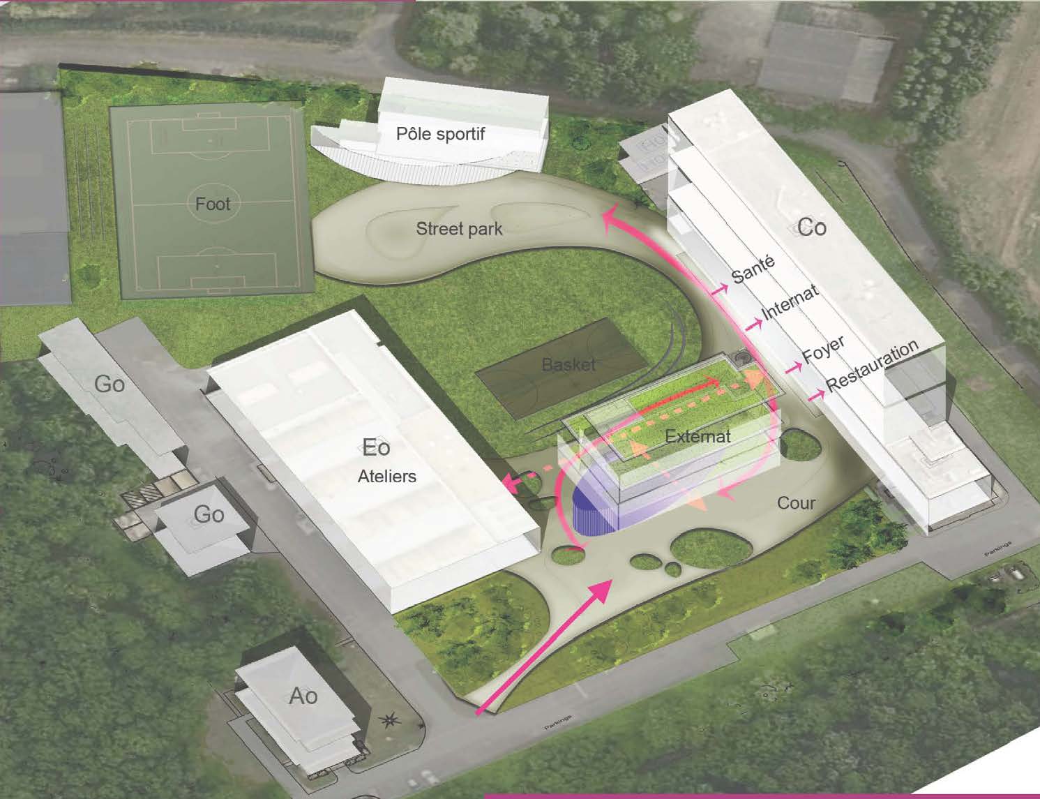 L’objet de cette opération est la restructuration du bâtiment internat (C0), la démolition du bâtiment (B0), la construction d’un nouvel externat, la création d’un pôle sportif, et la réorganisation et la réfection des espaces extérieurs impactés par les travaux. Le projet vise à proposer de nouveaux locaux mieux adaptés et fonctionnels mais aussi à offrir un cadre de vie renouvelé pour les jeunes élèves qui le fréquentent et y résident. La géométrie fluide des espaces extérieurs crée un lieu d’accueil propice aux rencontres et aux échanges et forme un cadre de vie convivial et créatif.
