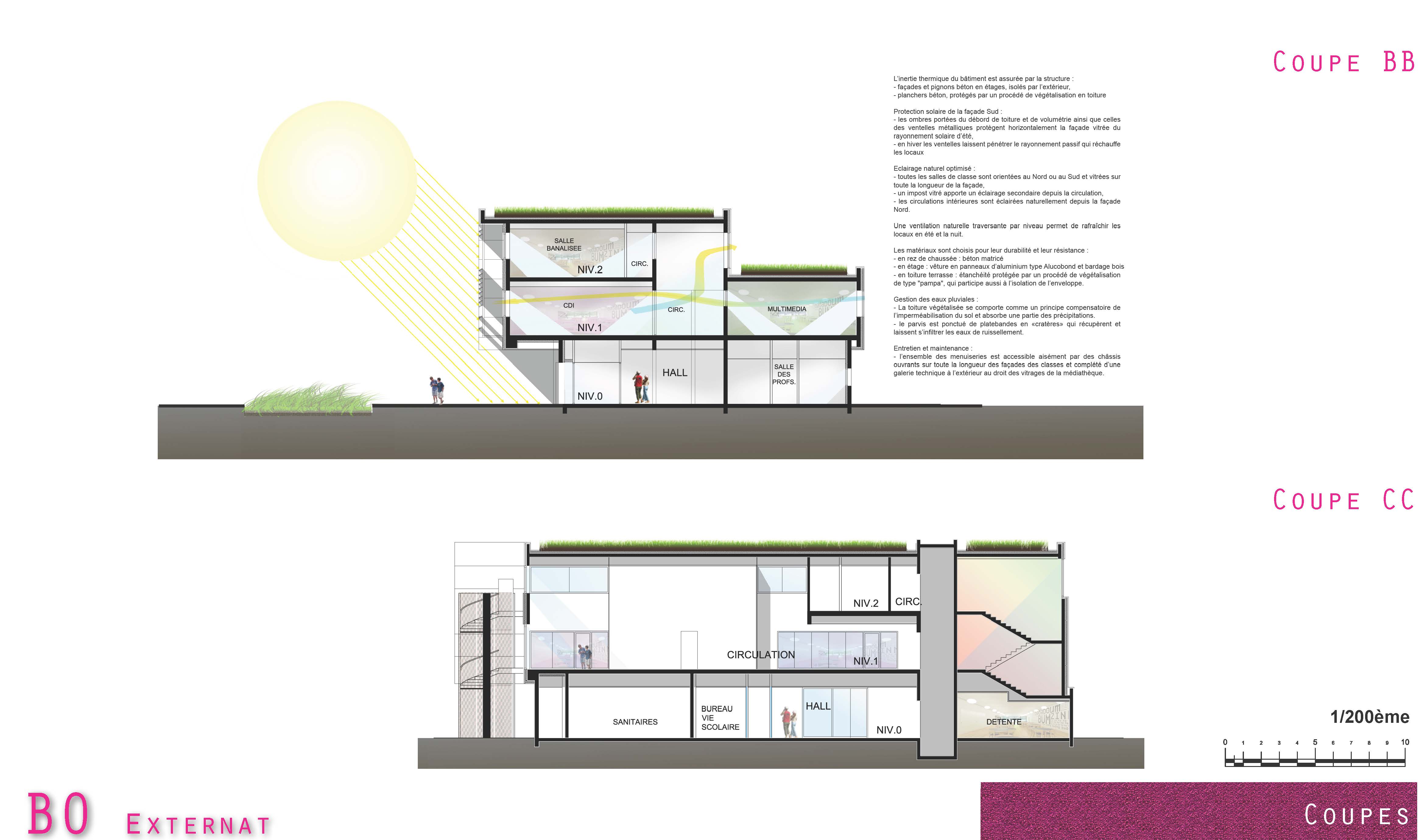 Descriptif technique : Afin d’atteindre l’objectif BBC RT Rénovation (Internat), BBC (Complexe Sportif) et RT2012 -10% (Externat), la mise en place d'une enveloppe thermique particulièrement performante sur chaque bâtiment a été privilégiée. L'objectif est de bénéficier d'un bâtiment dont les besoins en chauffage sont très faibles, et de limiter et simplifier les systèmes énergétiques à mettre en œuvre. Le projet intègre une inertie intérieure forte : inertie des façades, planchers béton, mur à inertie le long de la circulation et toitures végétalisées pour l'externat et le complexe sportif. NF Bâtiments Tertiaires Démarche HQEe