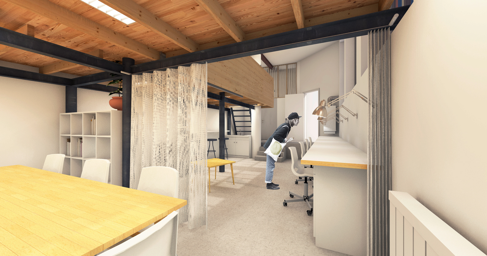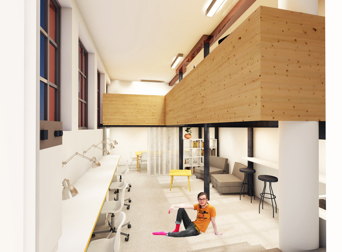 Descriptif technique de l'aménagement : La première intervention a été le remplacement de 2 poteaux béton par des EPN d'acier, plus fin et plus aptes à recevoir une structure réversible. La mezzanine entièrement démontable est posée sur une structure métallique composée d'IPN sur laquelle sont disposées les solives en porte à faux qui intègrent en rainure les réseaux du projet, et enfin le plancher. Le garde-corps est en structure bois et habillée de panneaux OSB sur les 2 faces et la tranche. Les murs de la salle d'eau sont habillés de tôles galvanisées, le plafond de plaques ondulées fixées sur solives support d'éclairage.