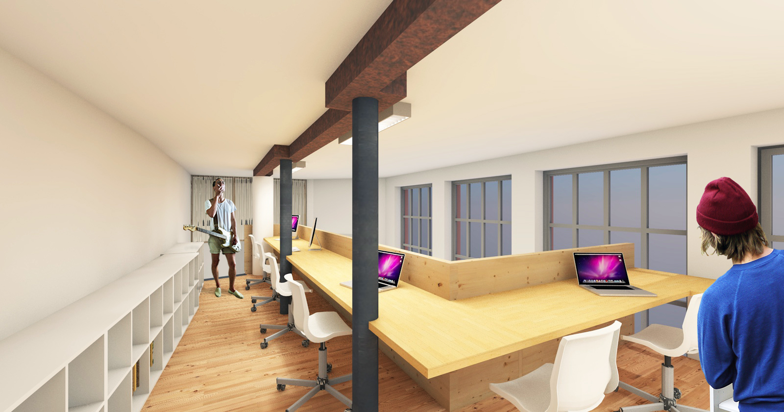 Approche environnementale : Notre approche sert une logique d'emploi de matériaux qui vise à servir au minimum 2 fonctions : Ainsi un IPN structurel devient également éclairage, une plaque de polycarbonate ondulé devient un organe de protection contre les projections d'eau et luminaire, une solive devient aussi une gaine électrique. Cet approche vise à minimiser l'emploi de matière première au profit de la matière grise !